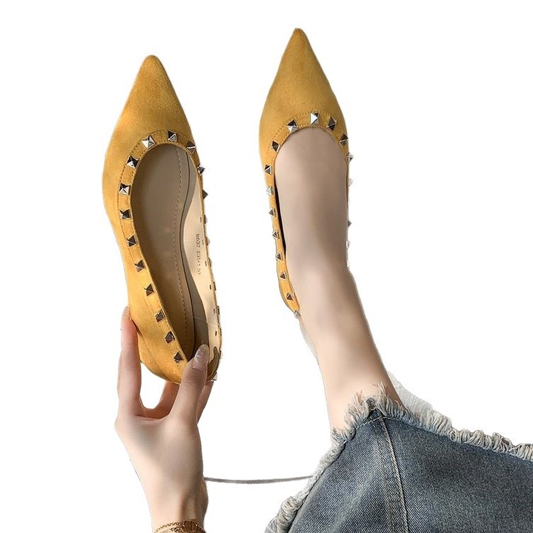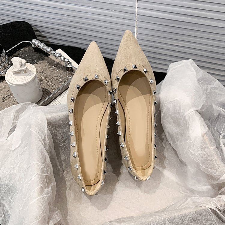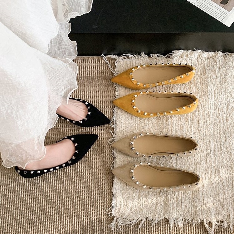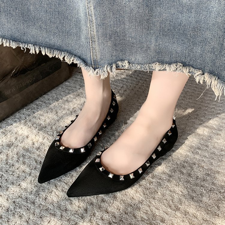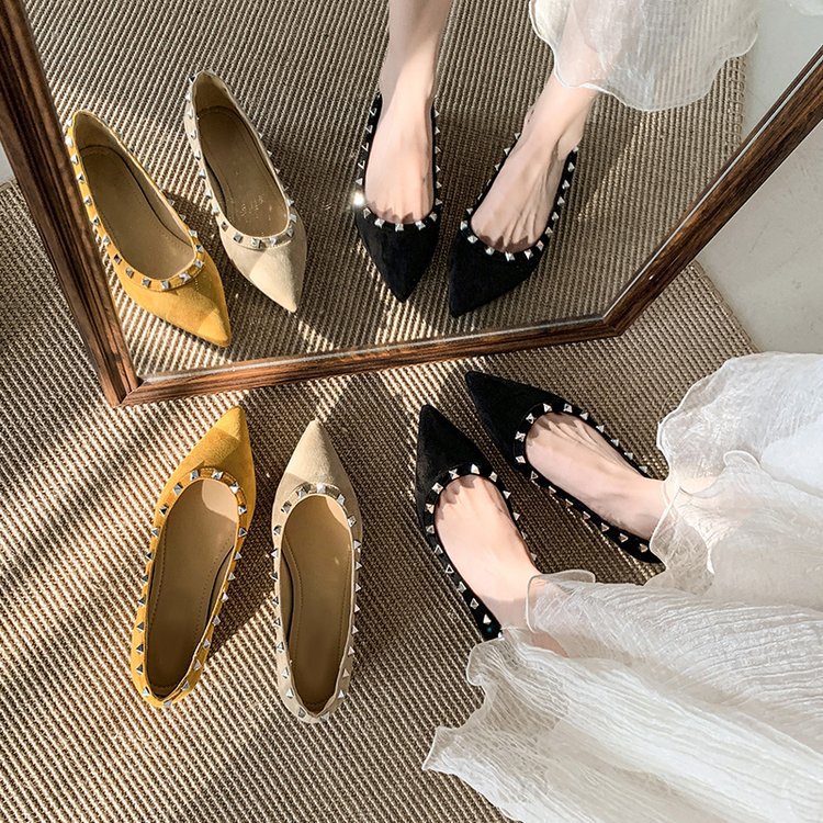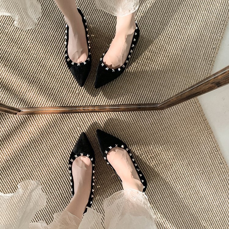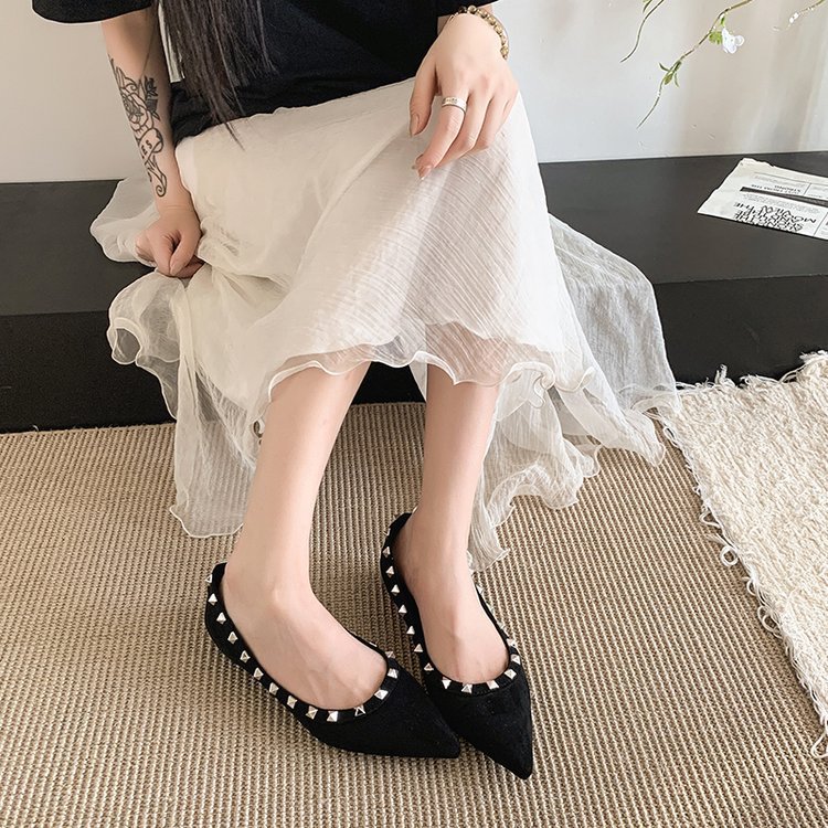 Женские летние балетки 2025 года в французском стиле с острым носком, шипами, скрытым каблуком и неглубоким вырезом.