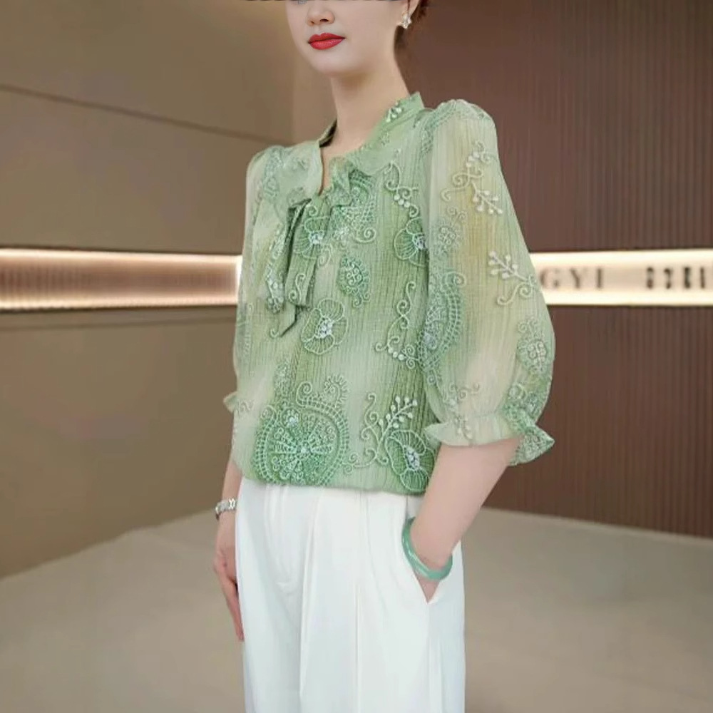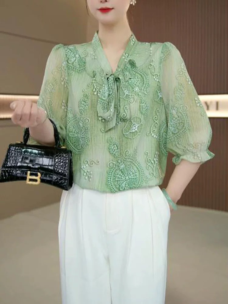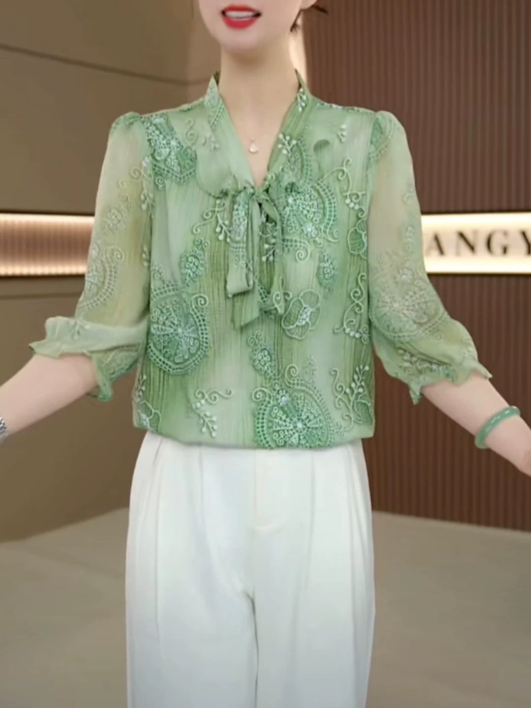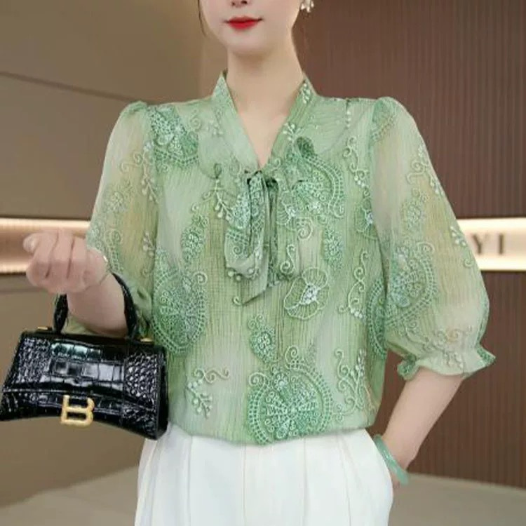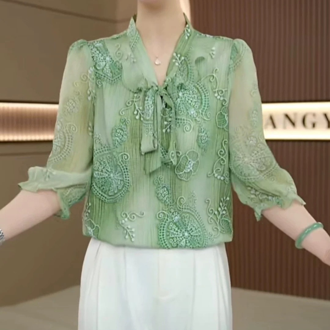 Популярная высококачественная женская рубашка для мам среднего и пожилого возраста 2025 года, летняя шифоновая рубашка с принтом, тонкий топ в западном стиле