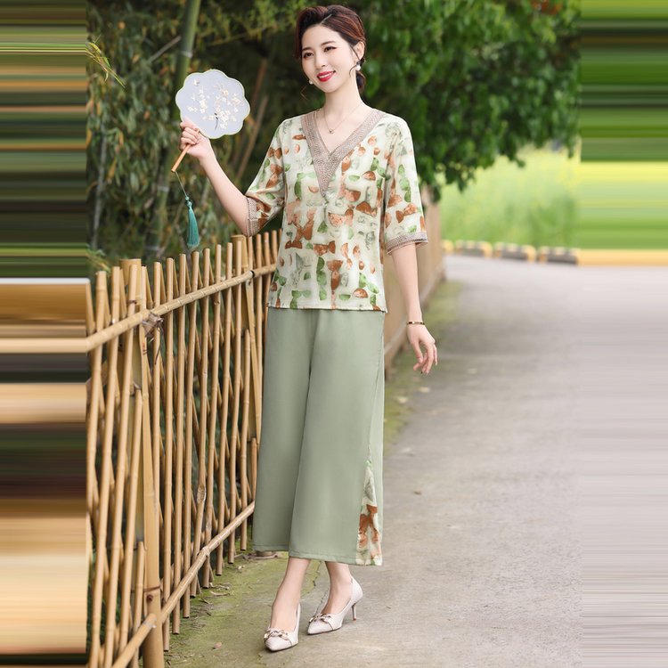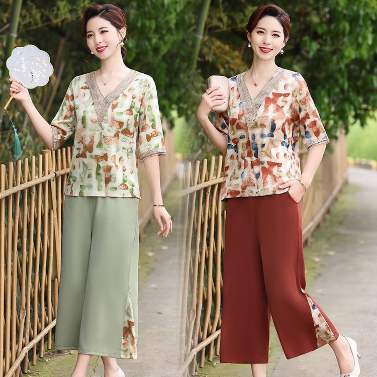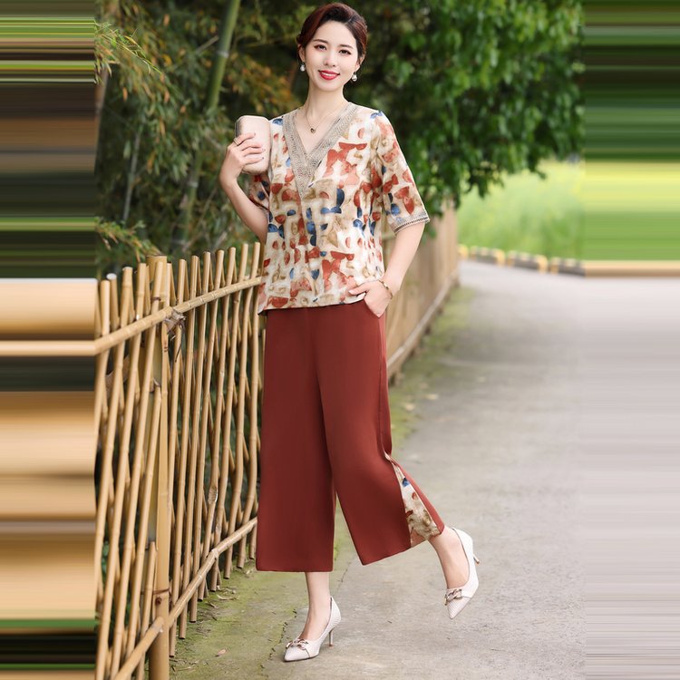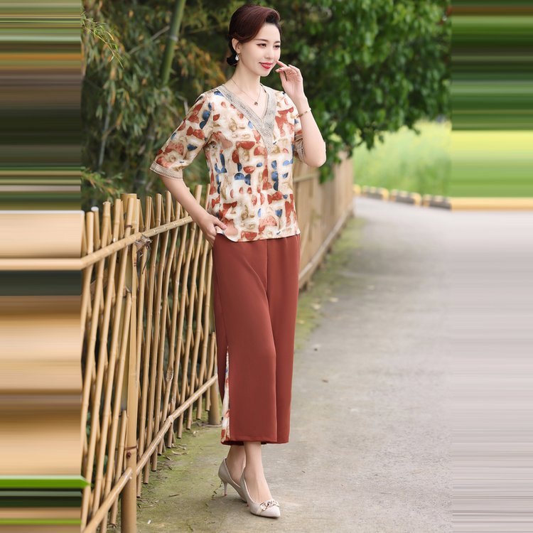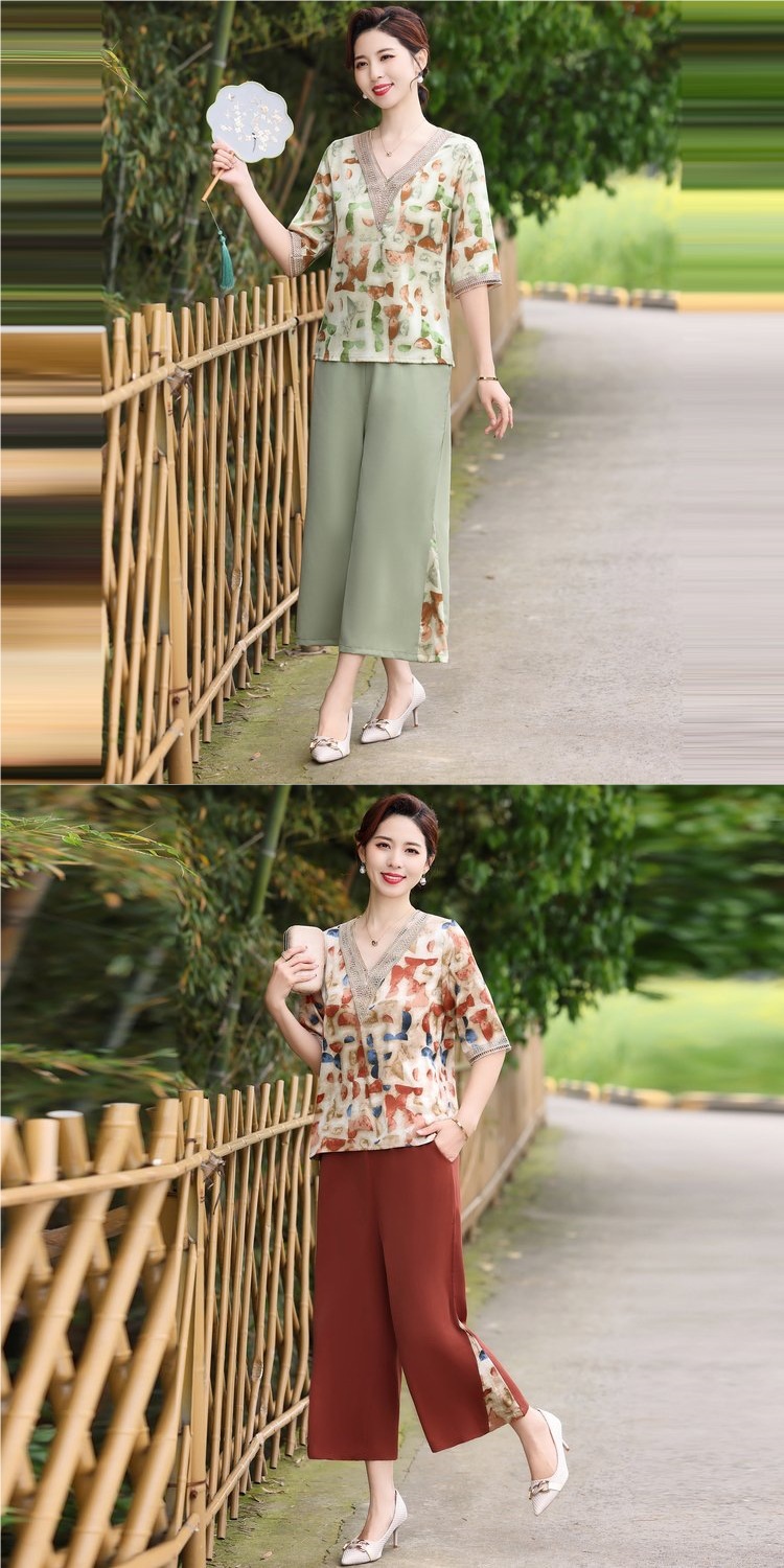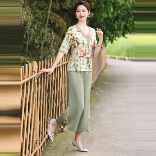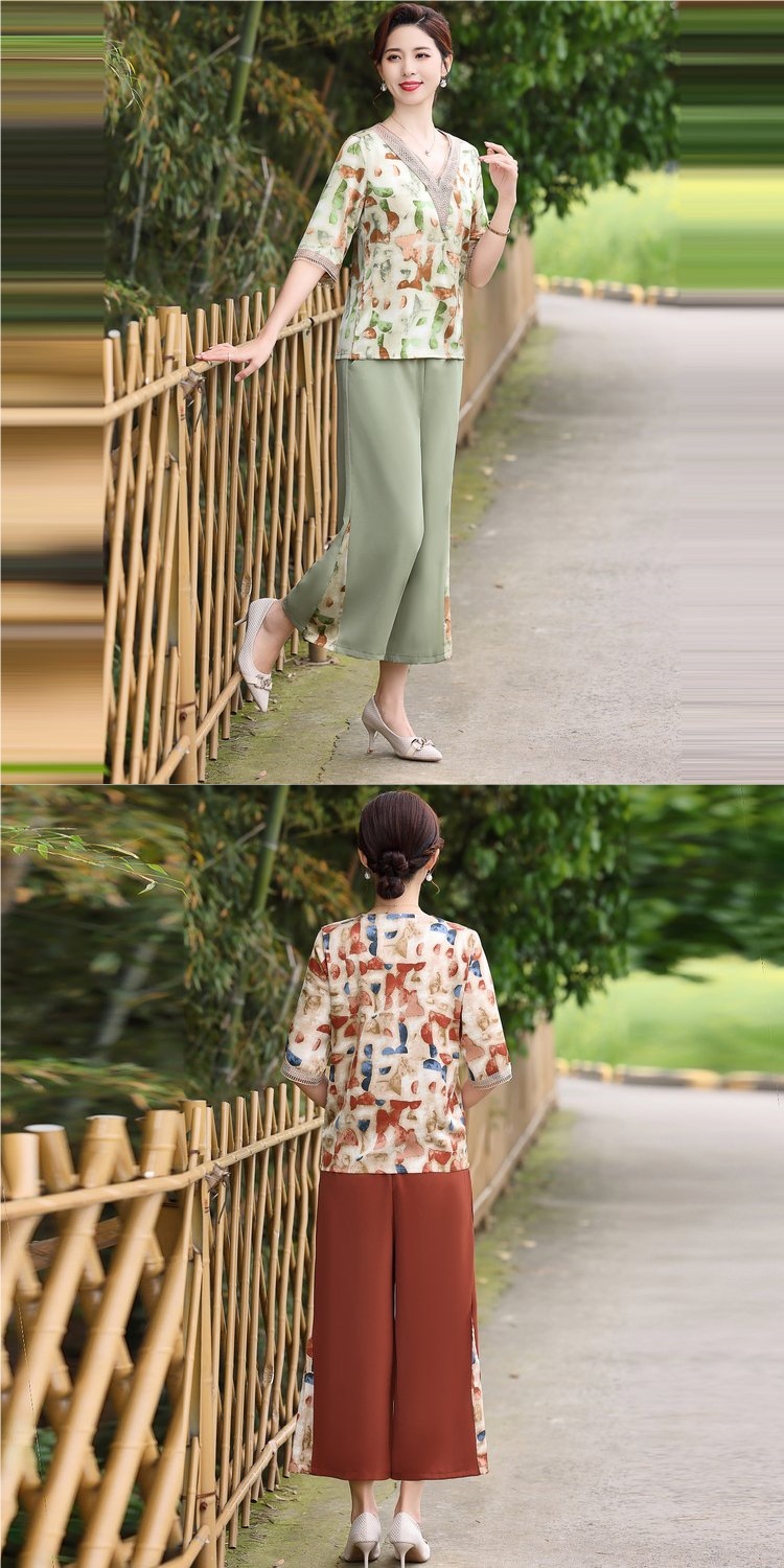 Модный шифоновый топ-костюм для мамы, уменьшающий возраст, новинка 2025 года, модный комплект из двух предметов для женщин среднего и пожилого возраста