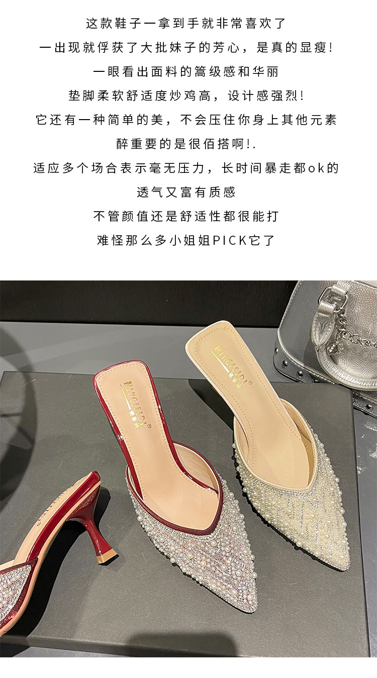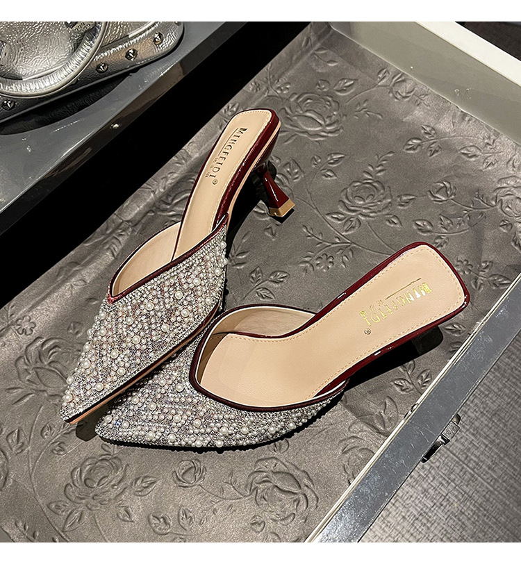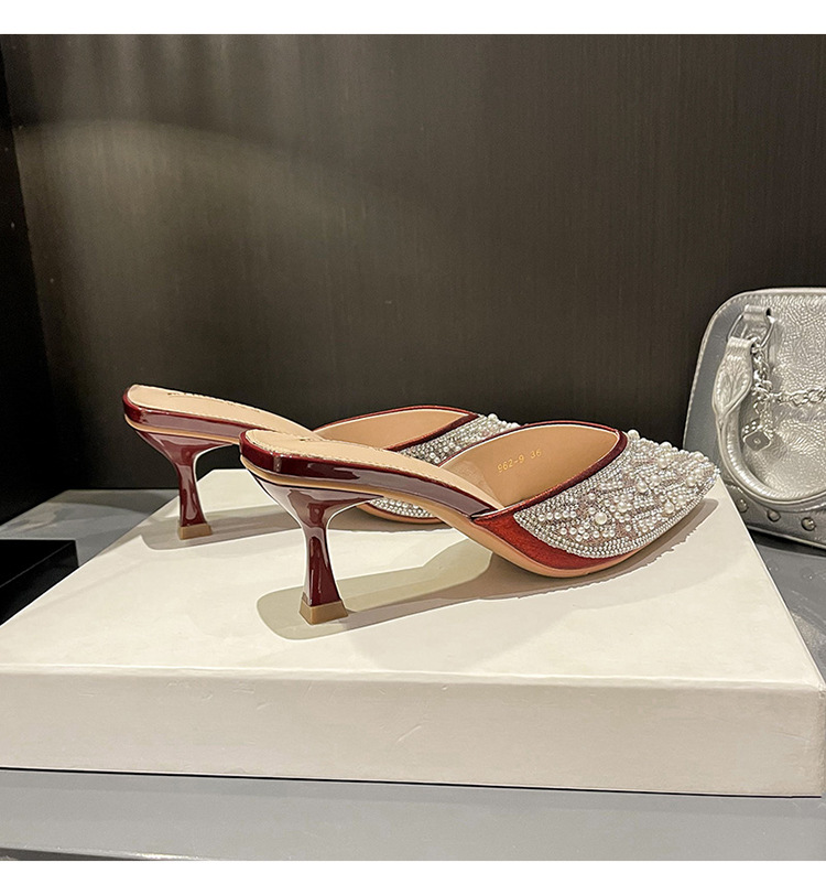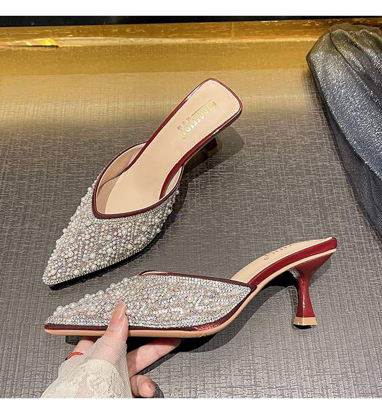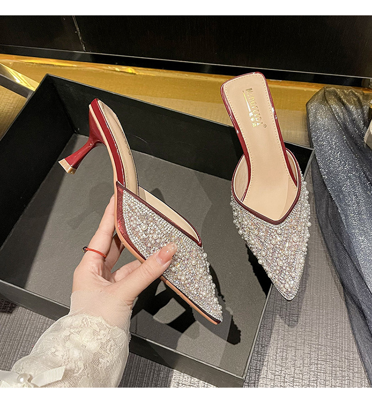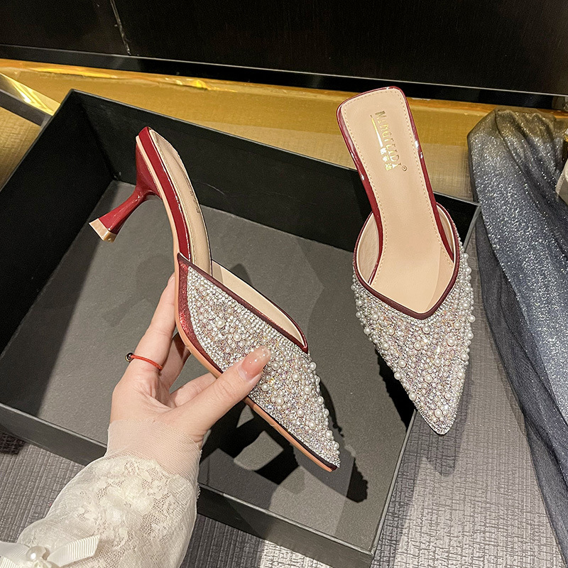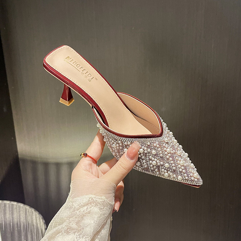 2025 новый летний сетчатый красный стразы полутапочки Баотоу холодные тапочки на высоком каблуке женские модные каблуки