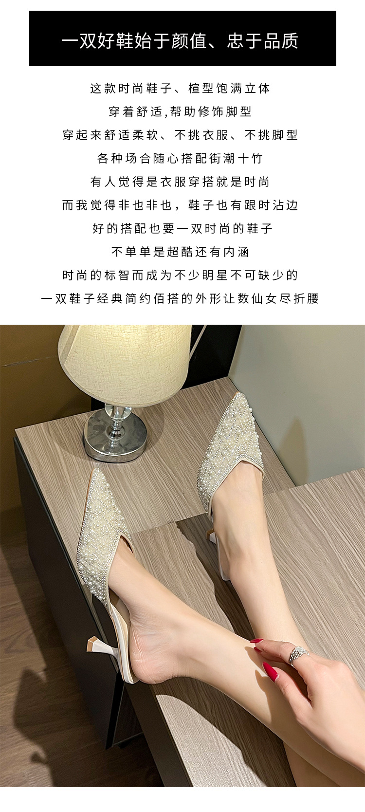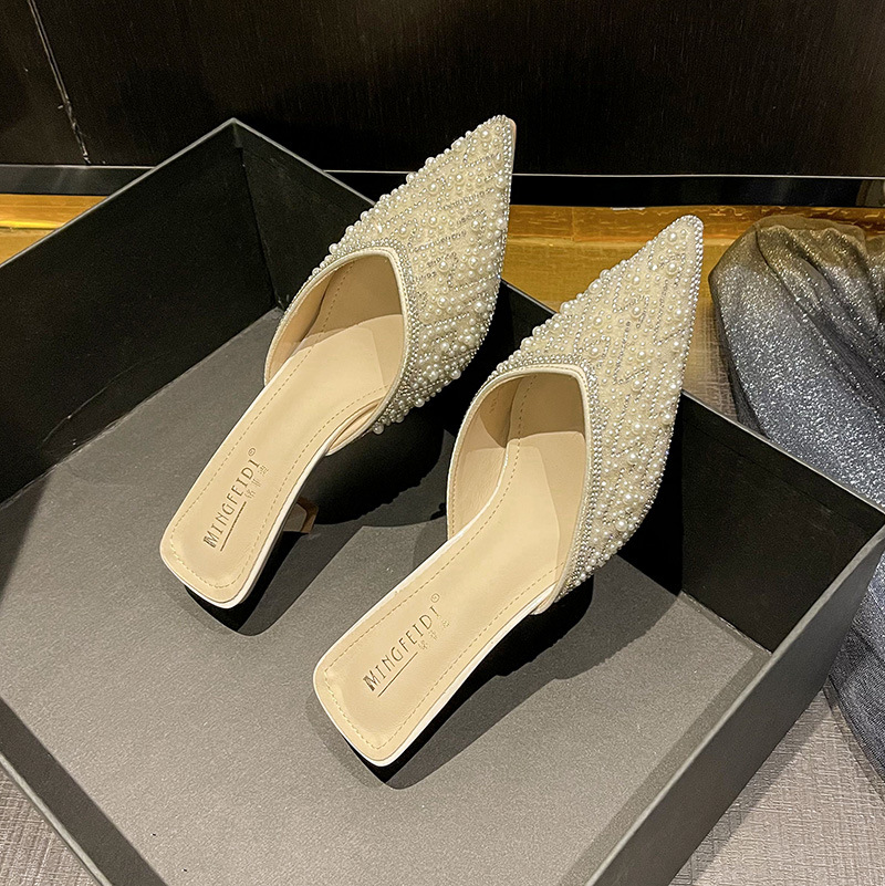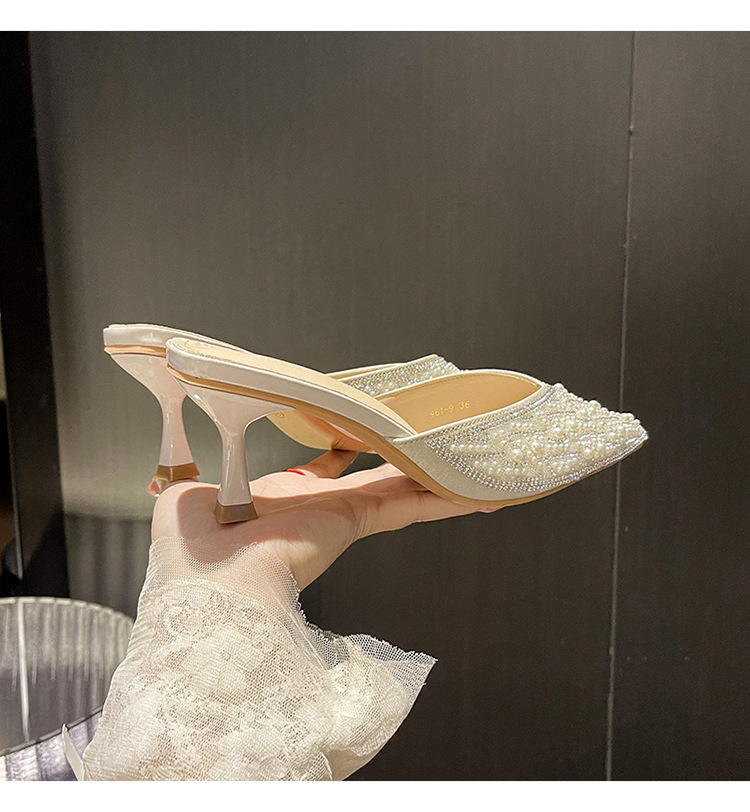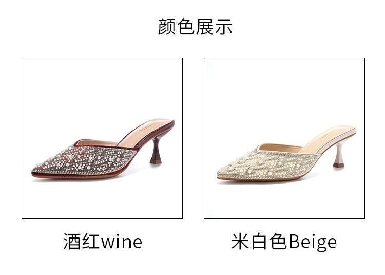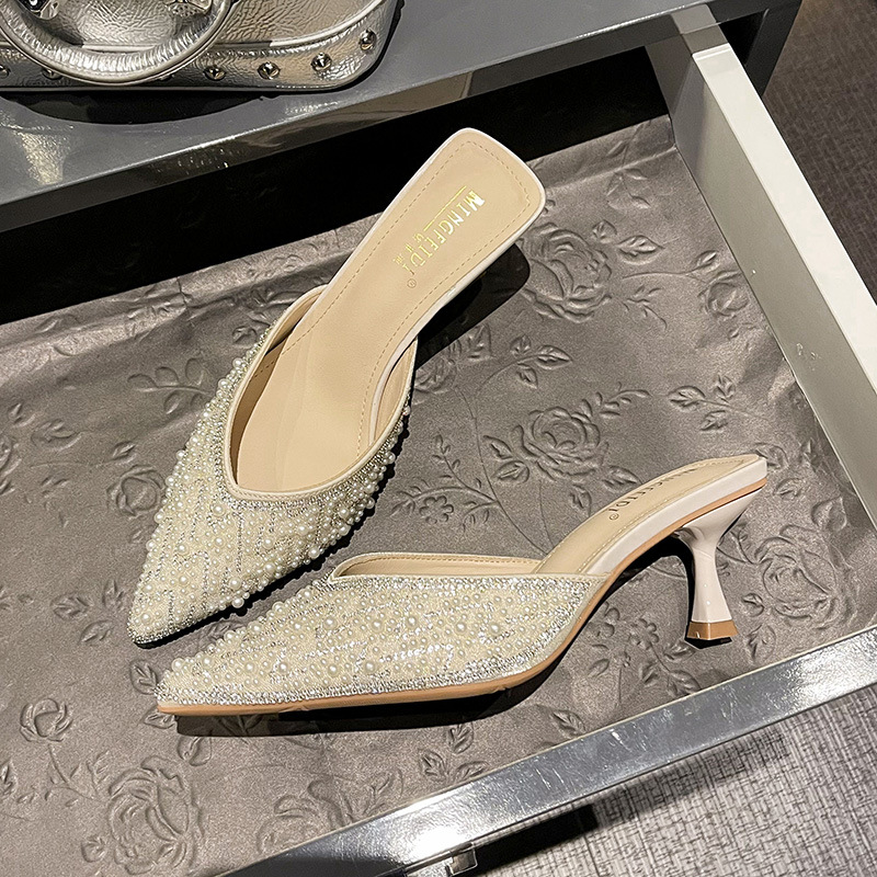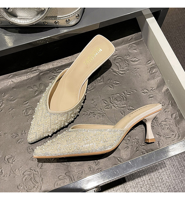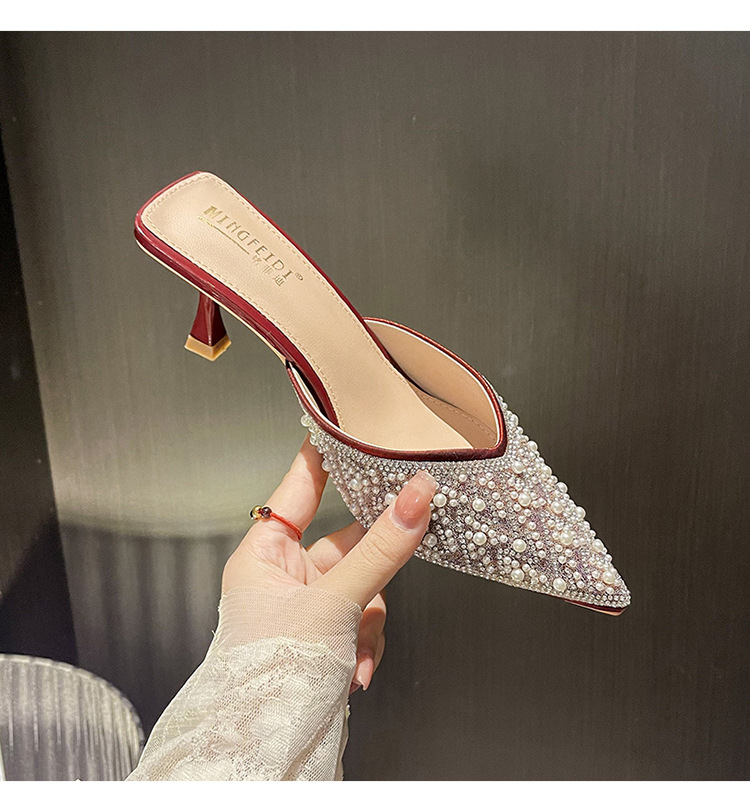 2025 новый летний сетчатый красный стразы полутапочки Баотоу холодные тапочки на высоком каблуке женские модные каблуки