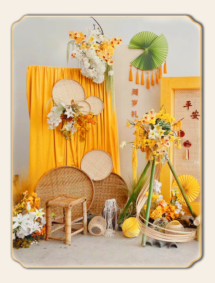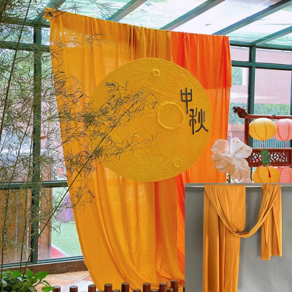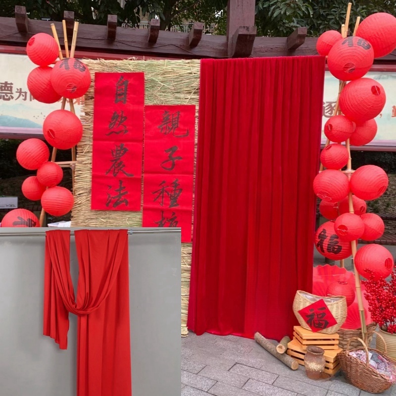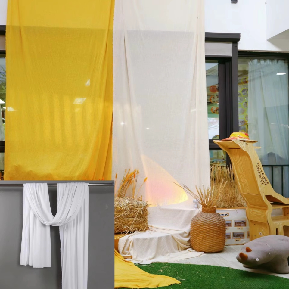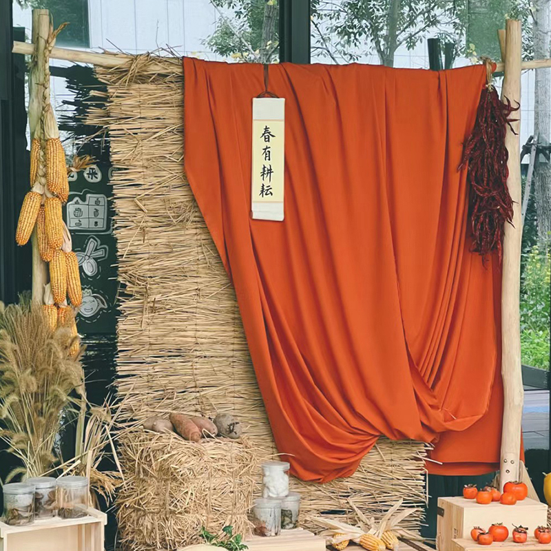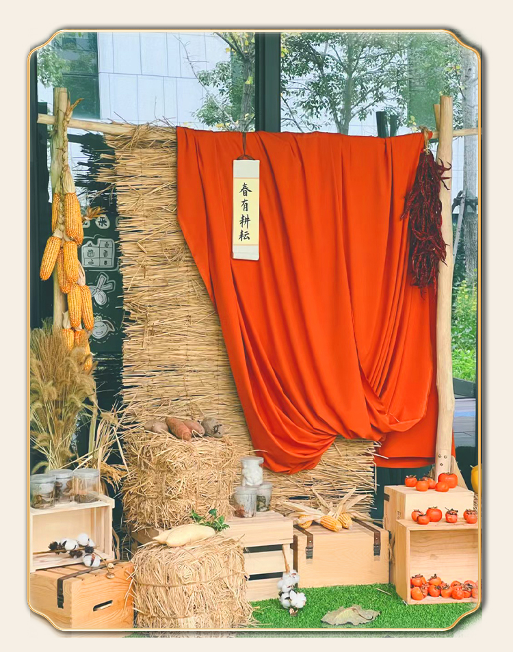 Новогоднее оформление детского сада, креативное оформление занавесей оранжево-желто-золотого цвета, создание фермерского двора.