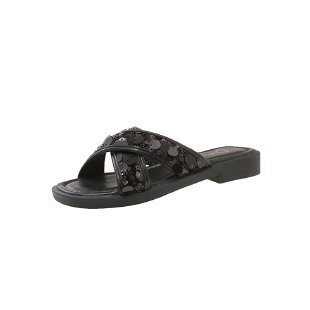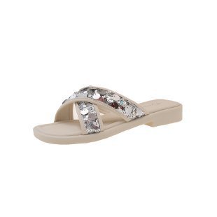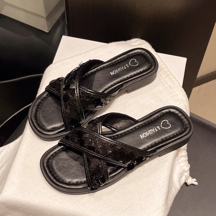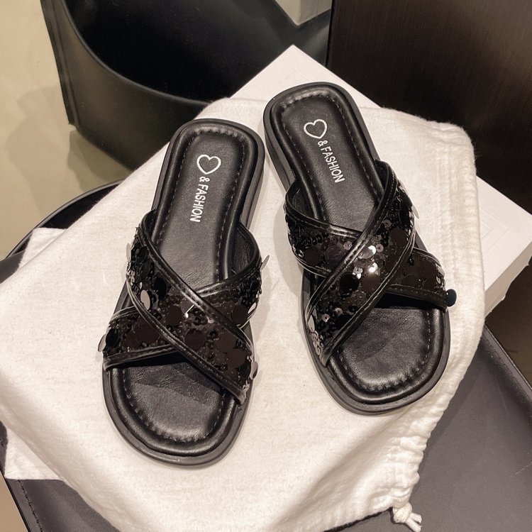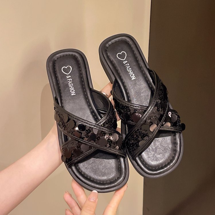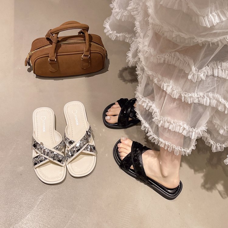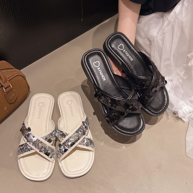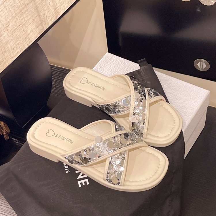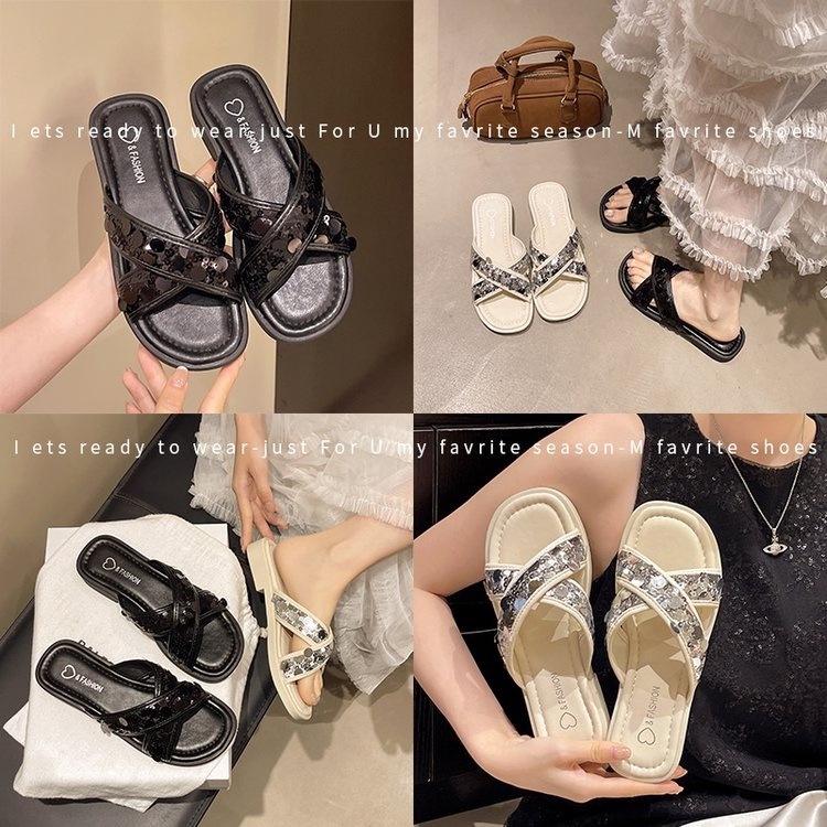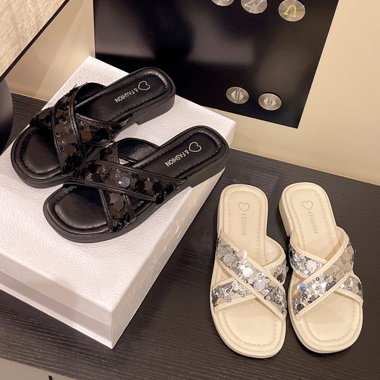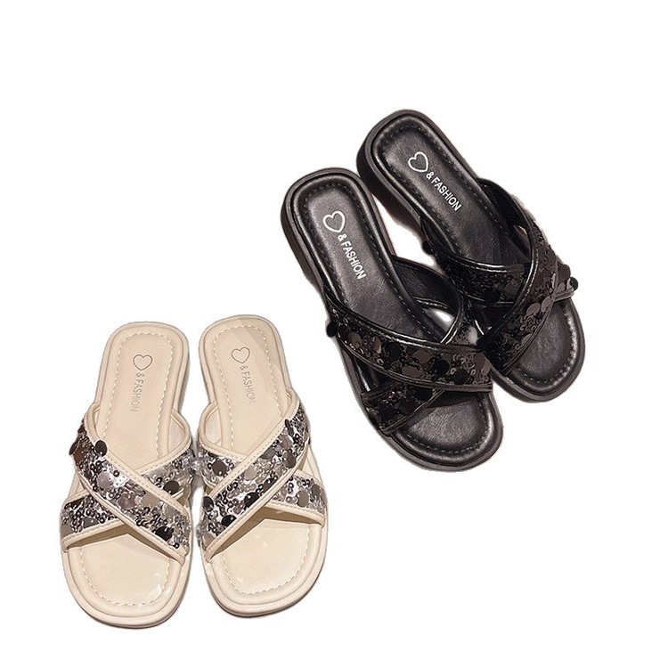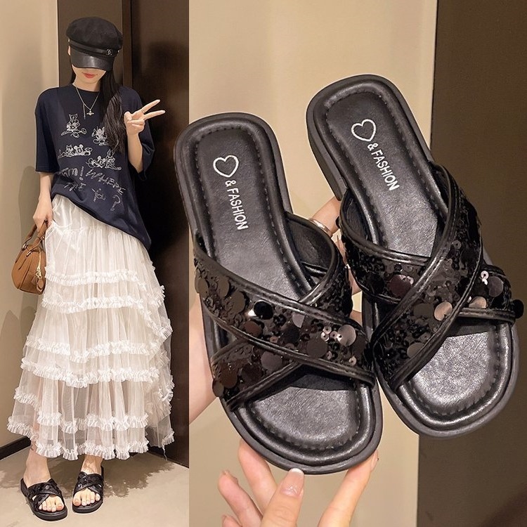 Красивые блестящие тапочки для женской летней верхней одежды 2025 года, новая мода, универсальные сандалии на толстой подошве с юбками