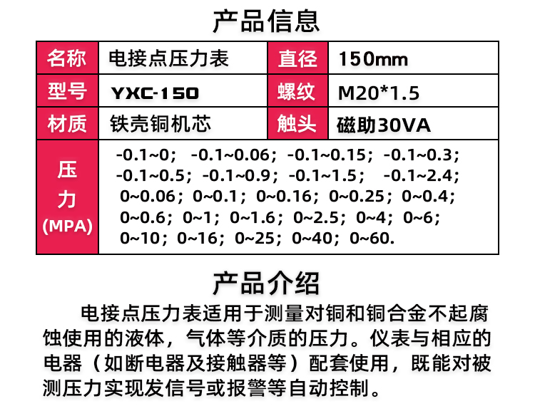 0~0,1 МПа эквивалентно 1kg; 0~0,25 МПа эквивалентно 2.5kg; 0~0,4 МПа эквивалентно 4kg; 0~0,6 МПа эквивалентно 6kg; 0~1 МПа эквивалентно 10kg; 0~1,6 МПа, что эквивалентно 16kg; 0~2,5 МПа эквивалентно 25kg; 0~4 МПа эквивалентно 40kg; 0~6 МПа эквивалентно 60kg; 0~10 МПа эквивалентно 100kg; 0~16 МПа эквивалентно 160kg; 0~25 МПа эквивалентно 250kg; 0~40 МПа, что эквивалентно 400kg; 0~60 МПа, что эквивалентно 600kg; Вакуумметр -0,1~0 МПа эквивалентен отрицательному значению 1kg ~0.; Вакуумное давление -0,1~0,15 МПа эквивалентно отрицательному значению 1kg ~0.; -0,1~0,9 МПа вакуумное давление, эквивалентное отрицательному значению 1kg ~9
