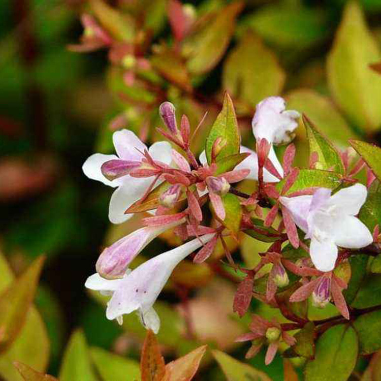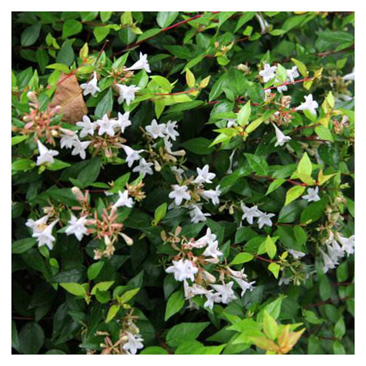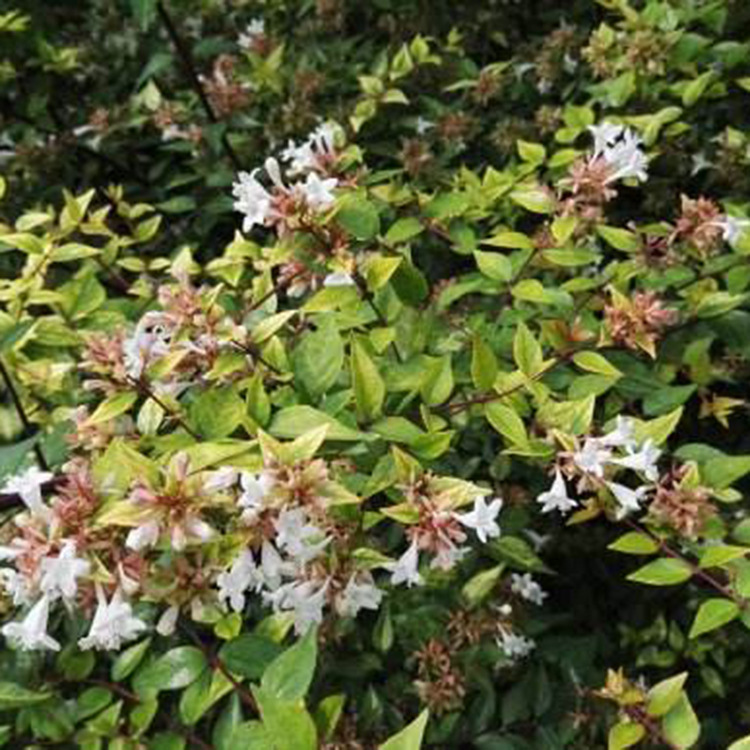 金叶大花六道木可达1.5m,小枝细圆,阳面紫红色,弓形。叶小,长卵形,长2.5-3.0cm,宽1.2cm,边缘具疏浅齿,在阳光下呈金黄色,光照不足则叶色转绿。圆锥状聚伞花序,花小,白色带粉,繁茂而芬芳,花期6-11月。