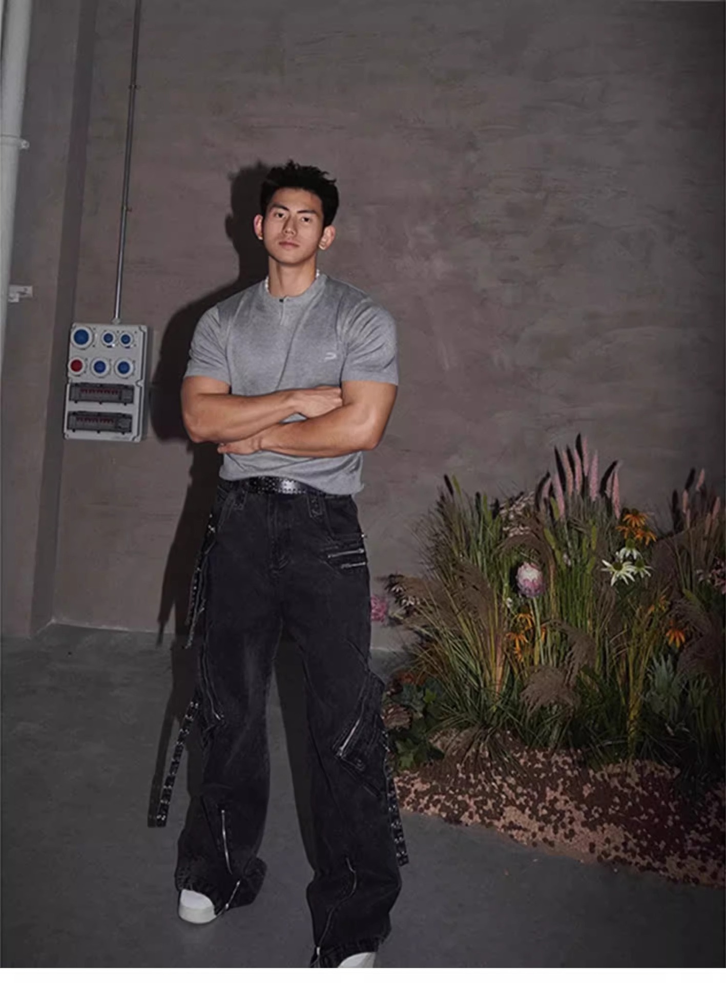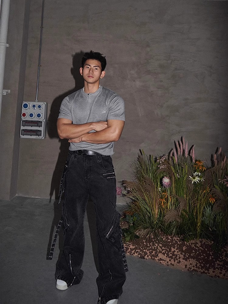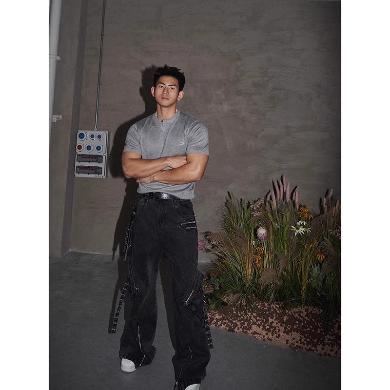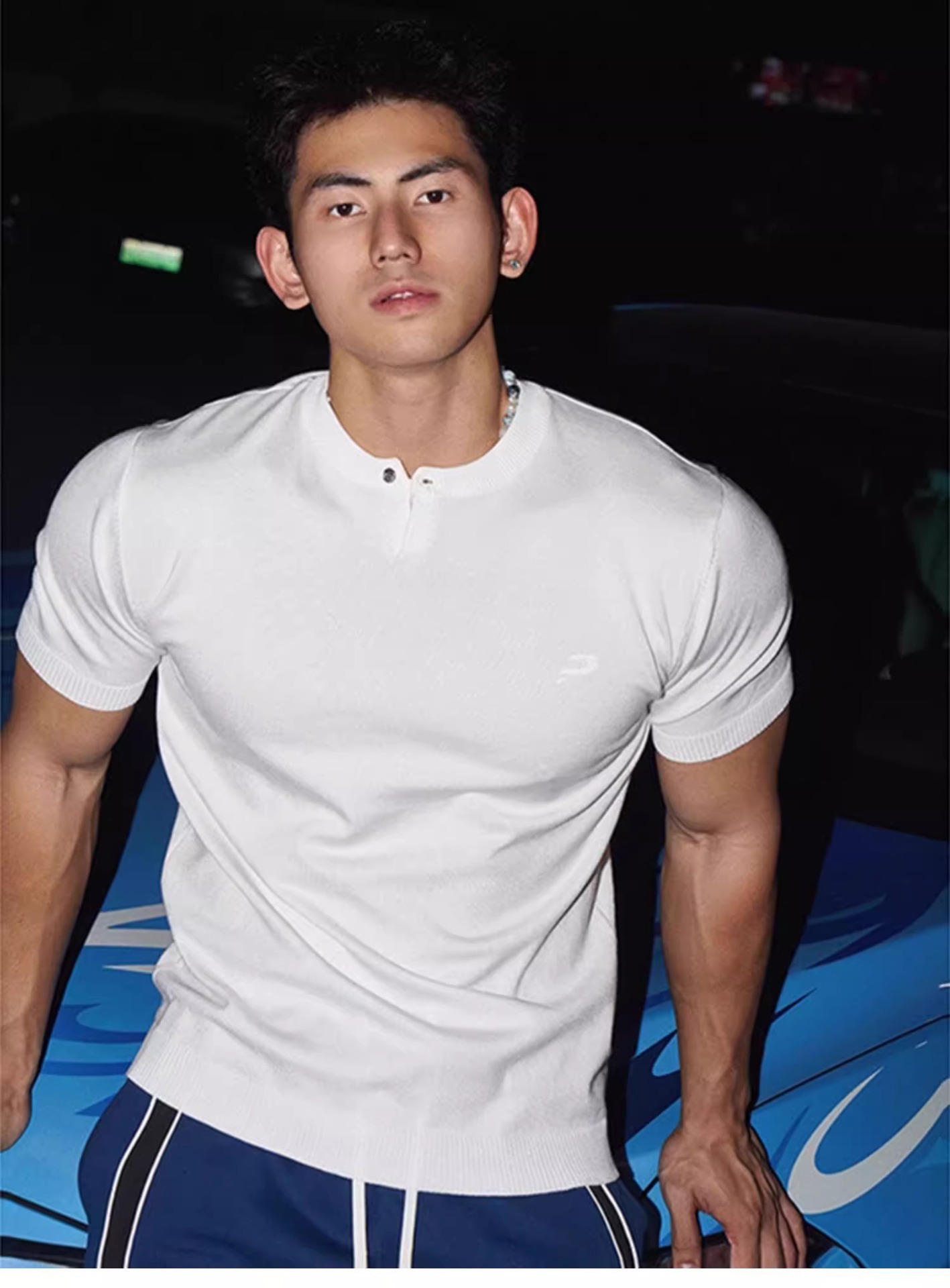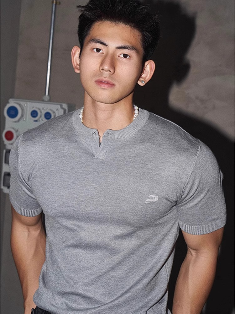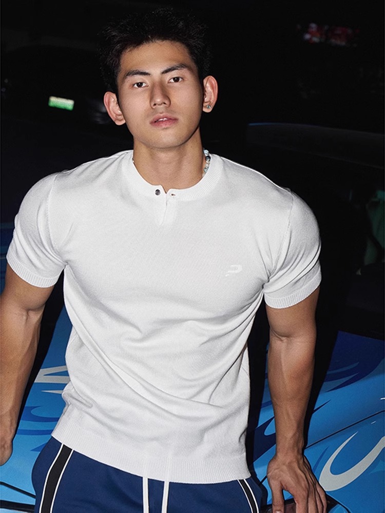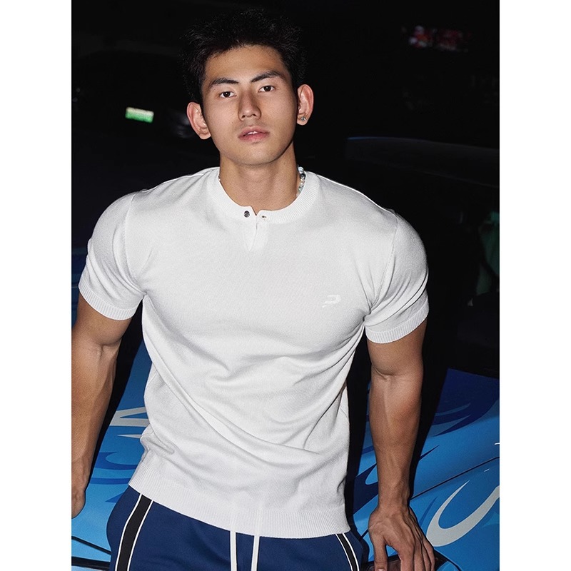 Американский трикотаж с короткими рукавами и воротником Генри на одной пуговице, мужская летняя тонкая спортивная футболка с вышивкой, демонстрирующая мышцы, фитнес, половина рукава