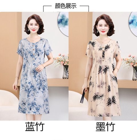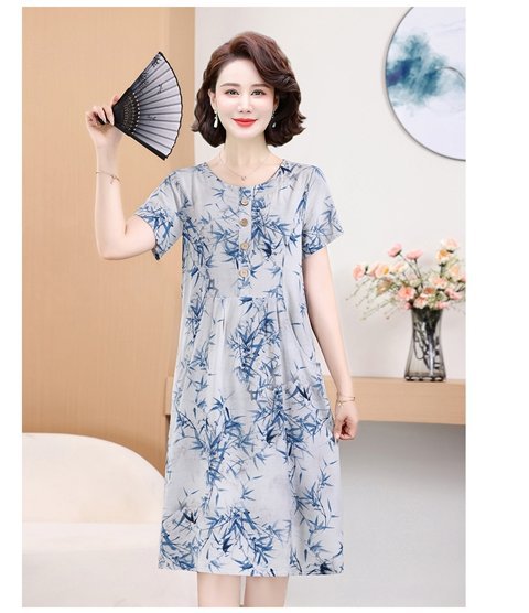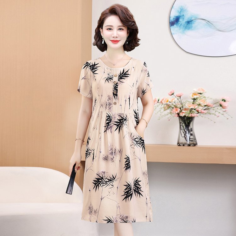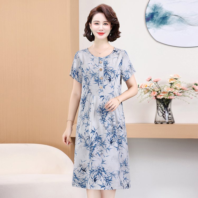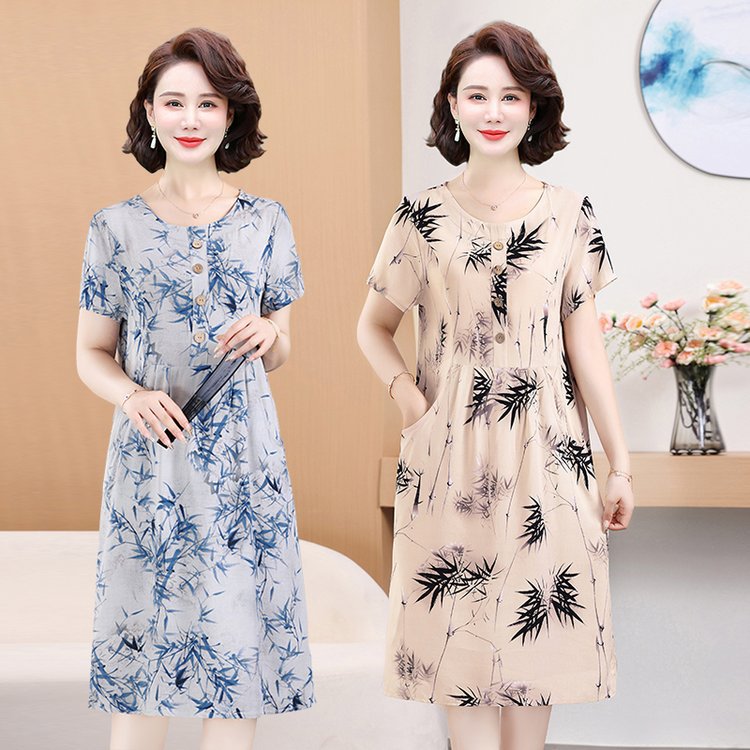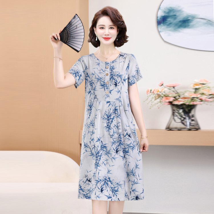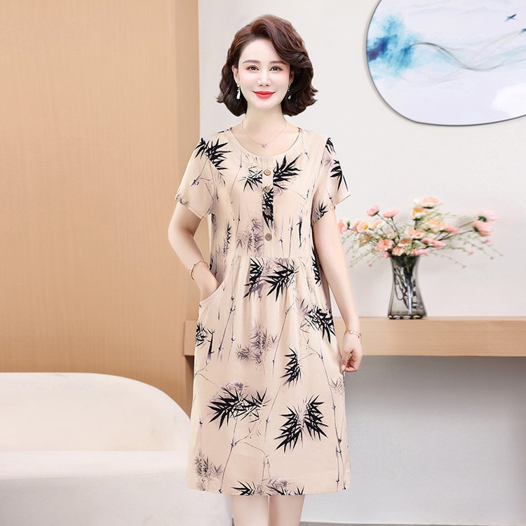 Хлопковое шелковое платье для мам среднего и пожилого возраста с короткими рукавами, летнее платье средней длины для бабушки, искусственный хлопок, круглый вырез, юбка большого размера с принтом