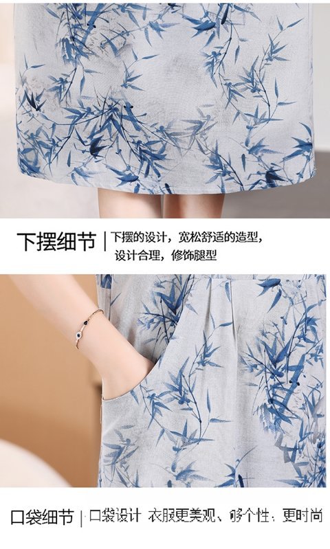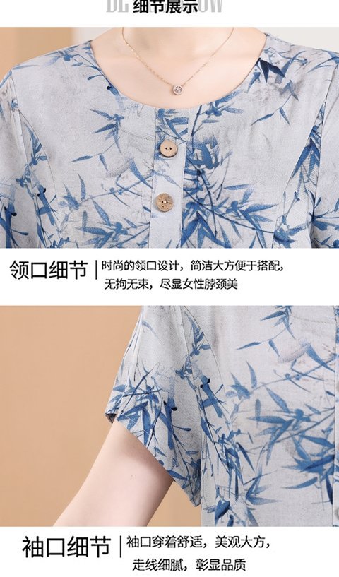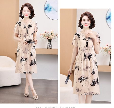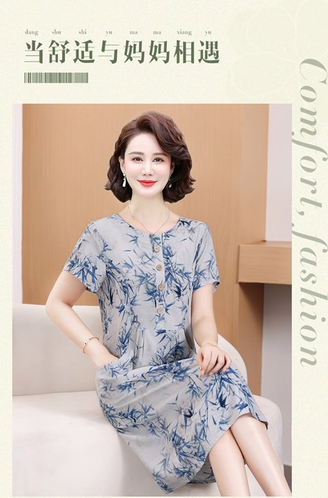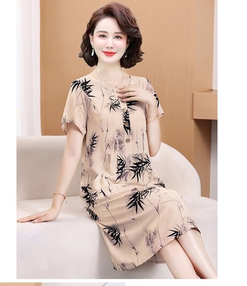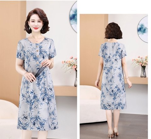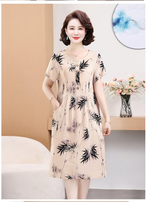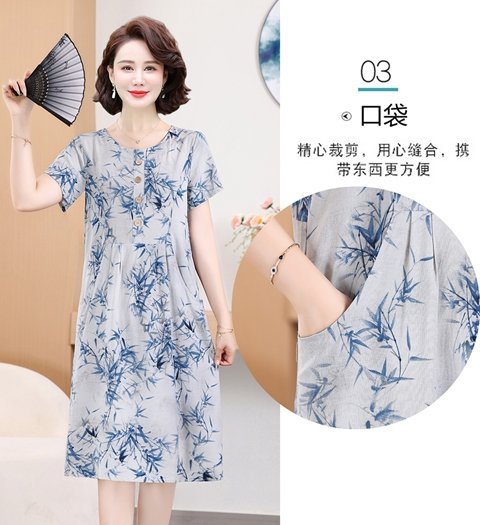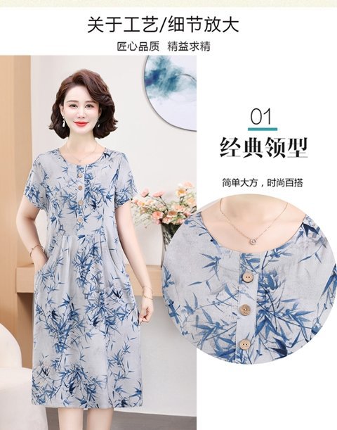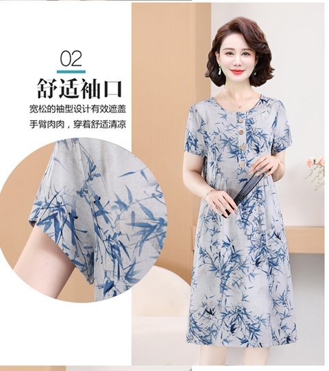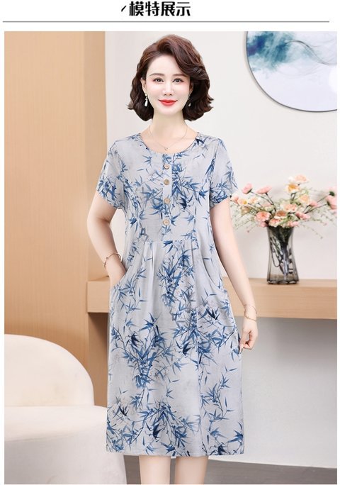 Хлопковое шелковое платье для мам среднего и пожилого возраста с короткими рукавами, летнее платье средней длины для бабушки, искусственный хлопок, круглый вырез, юбка большого размера с принтом