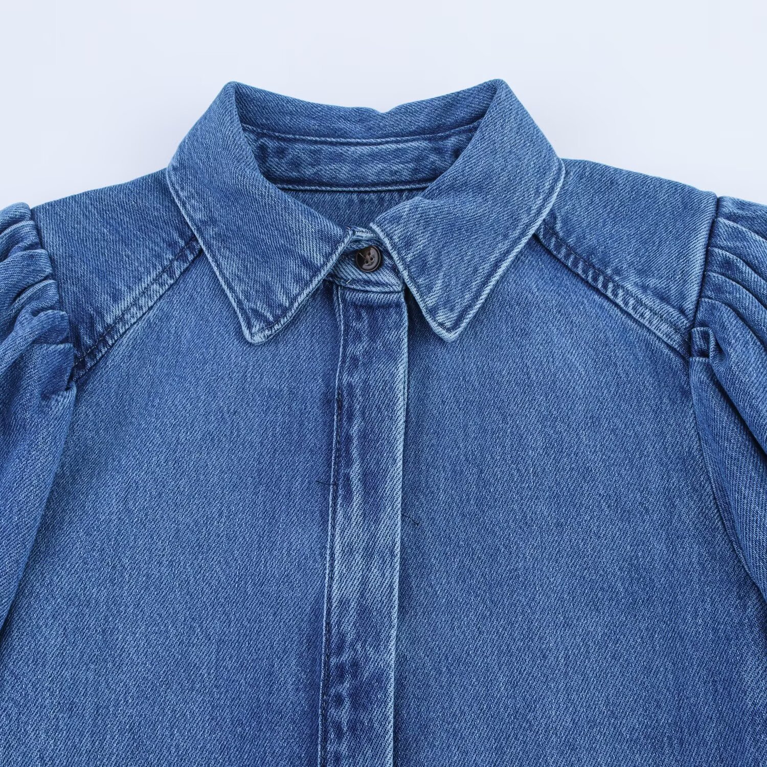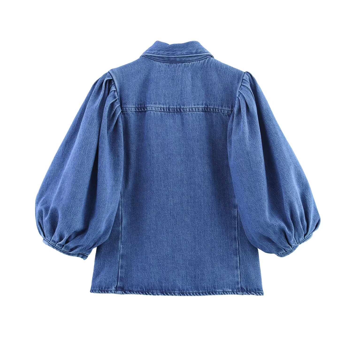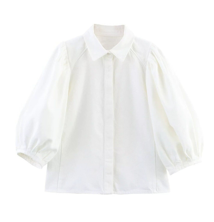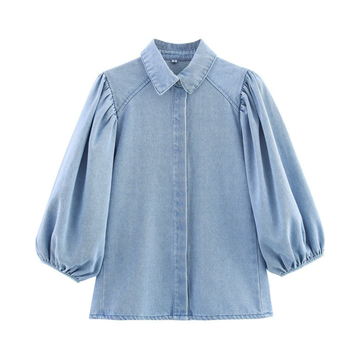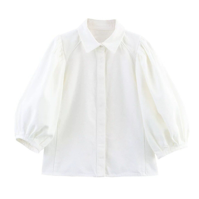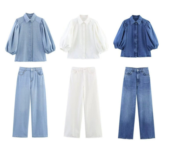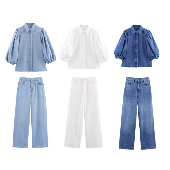 Трансграничная европейская и американская мода AliExpress, популярная универсальная джинсовая рубашка с воротником-поло и пышными рукавами + комплект брюк