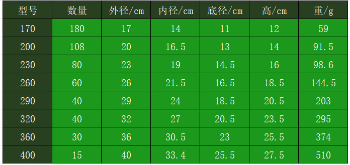 170 (200 шт./шт.); 200 (150 шт./шт.); 230 (120 шт./шт.); 260 (100 шт./шт.); 290 (100 шт./шт.); 320 (80 шт./шт.); 360 (60 шт./шт.); 400 (40 шт./шт.)