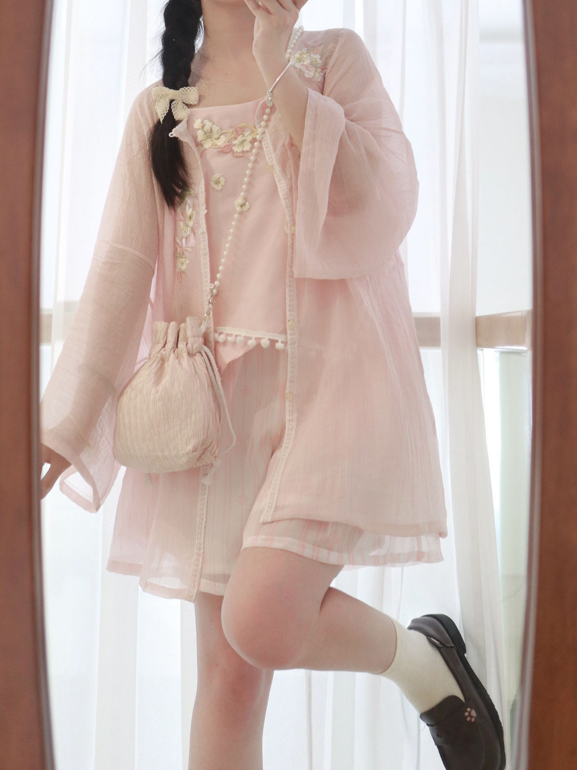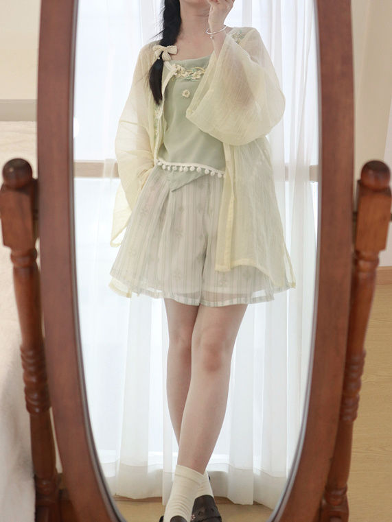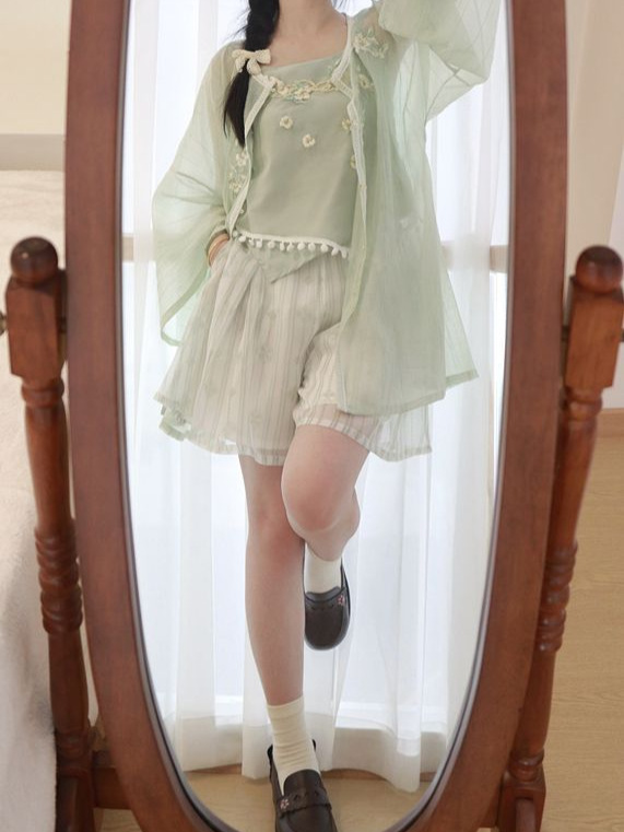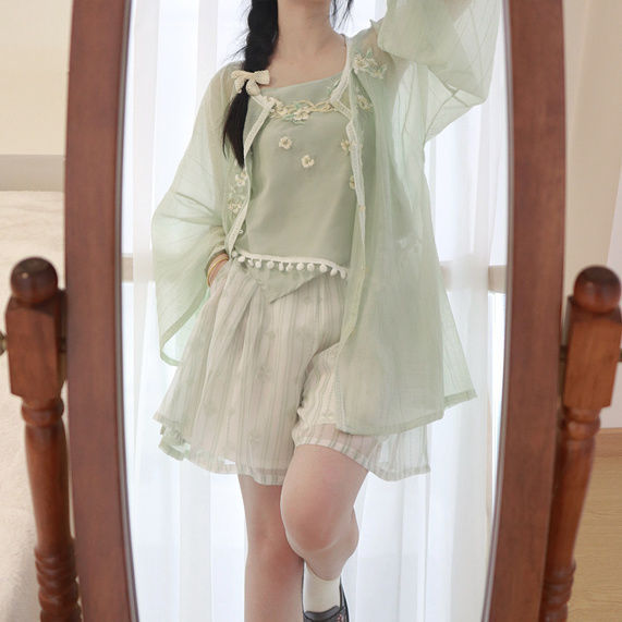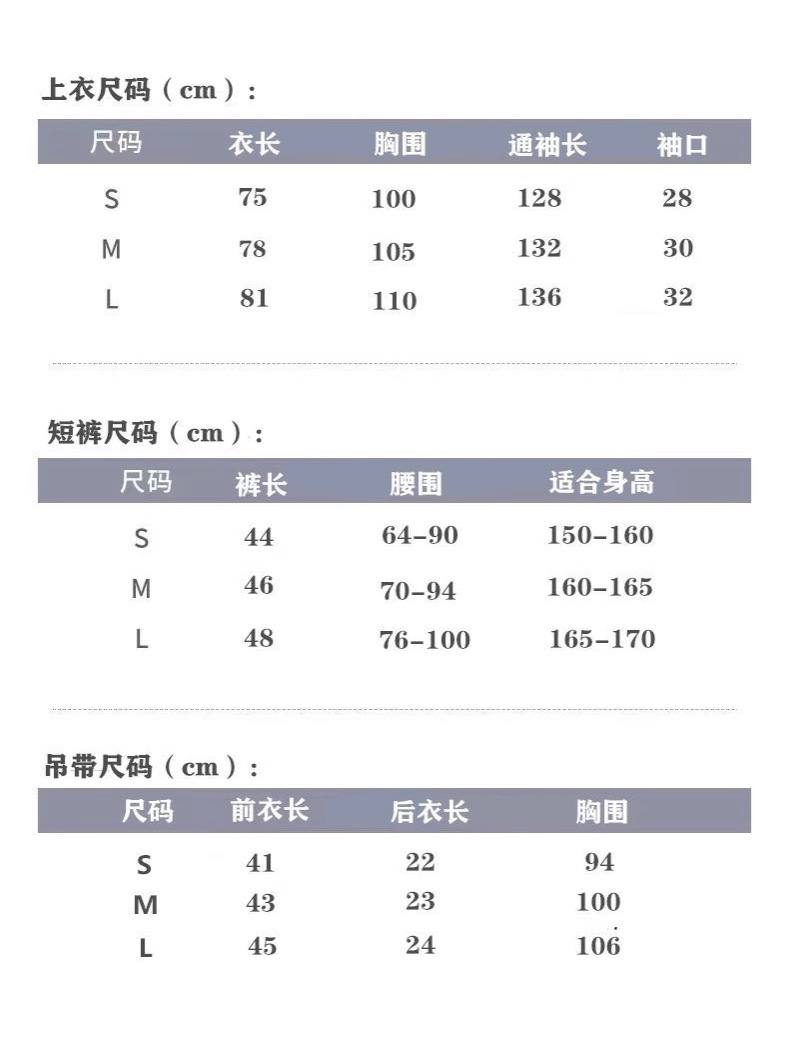 Синий костюмный топ + подтяжки + шорты; Светло-зеленый верх костюма + подтяжки + шорты; Розовый костюмный топ + подтяжки + шорты