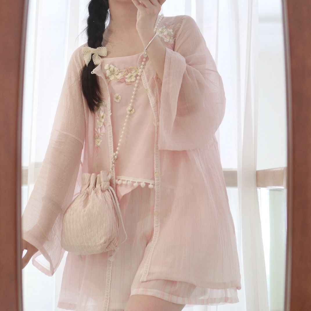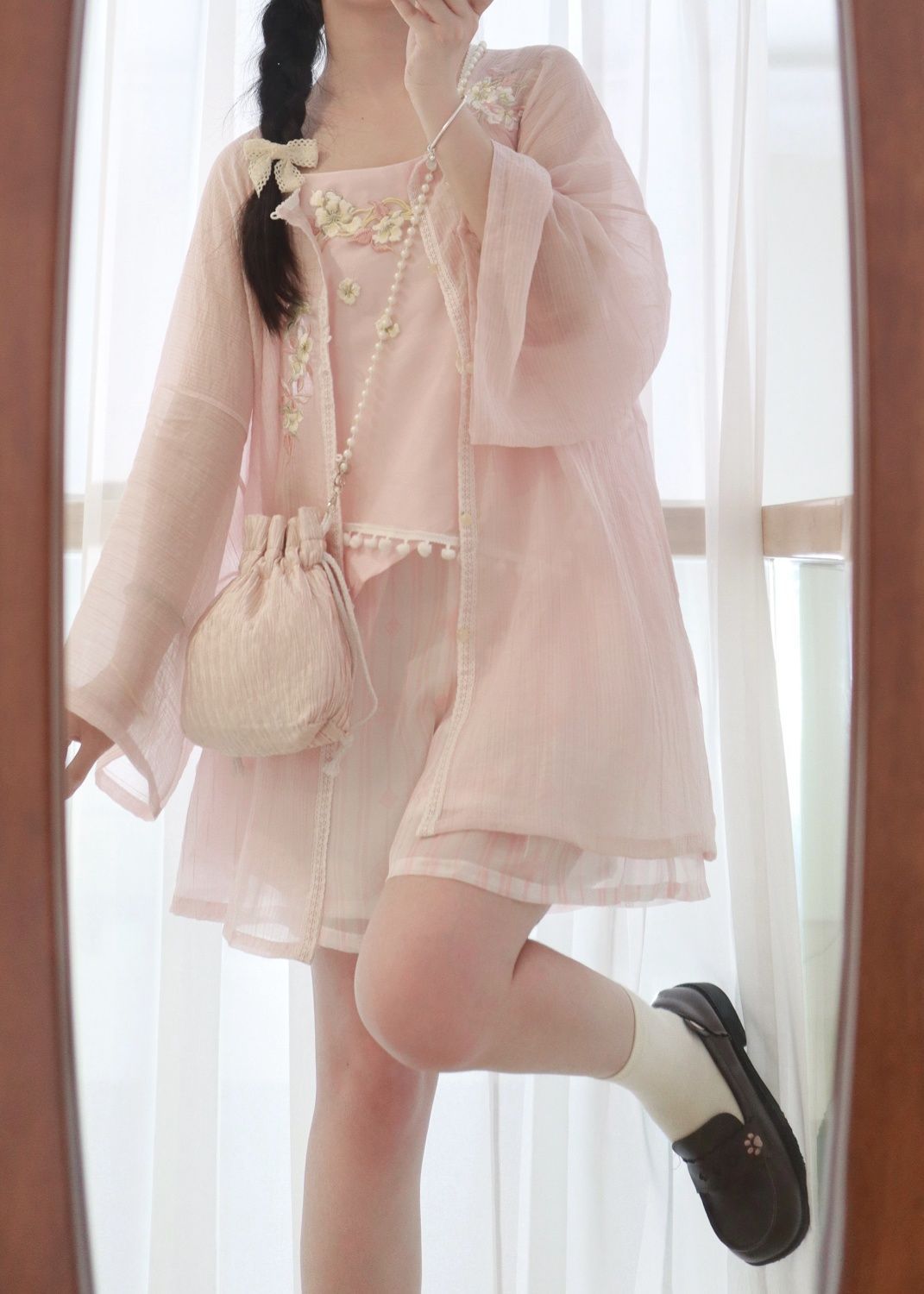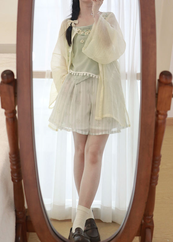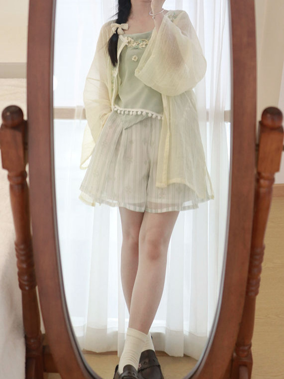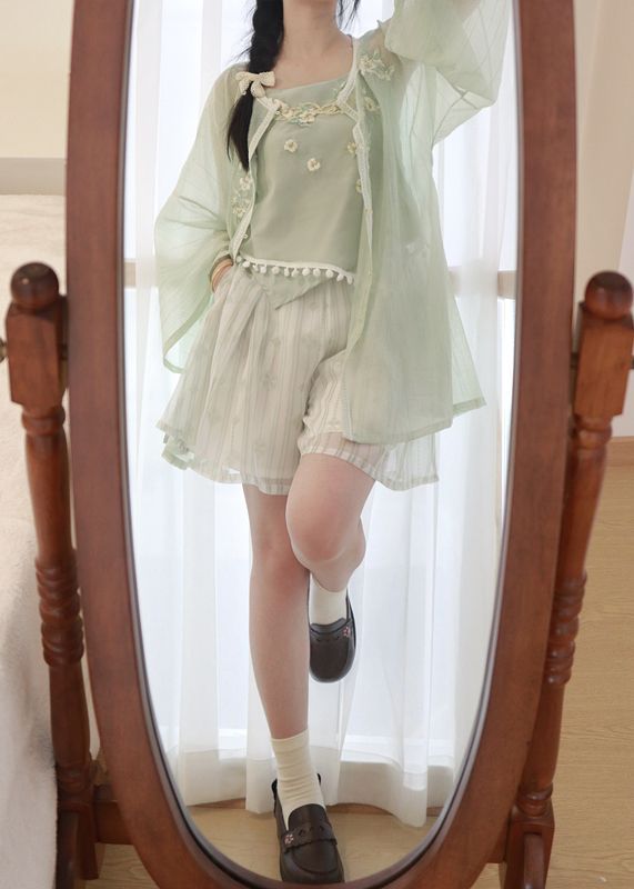 Синий костюмный топ + подтяжки + шорты; Светло-зеленый верх костюма + подтяжки + шорты; Розовый костюмный топ + подтяжки + шорты