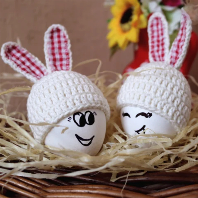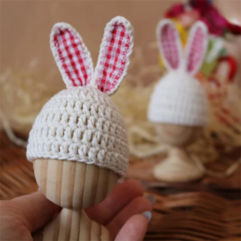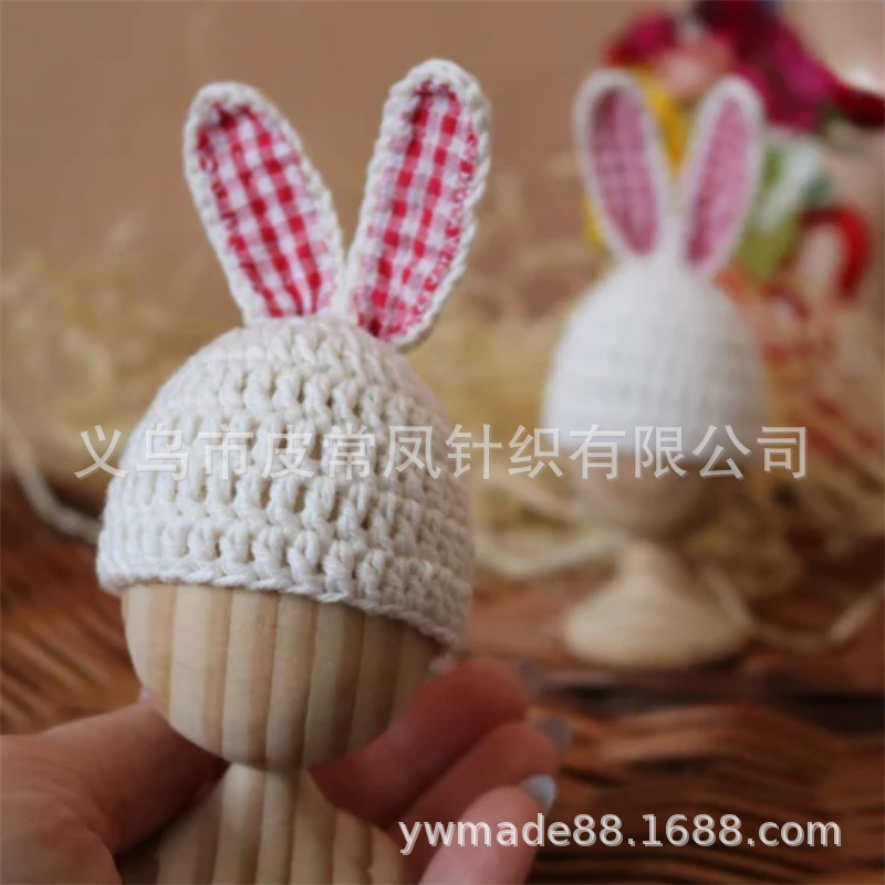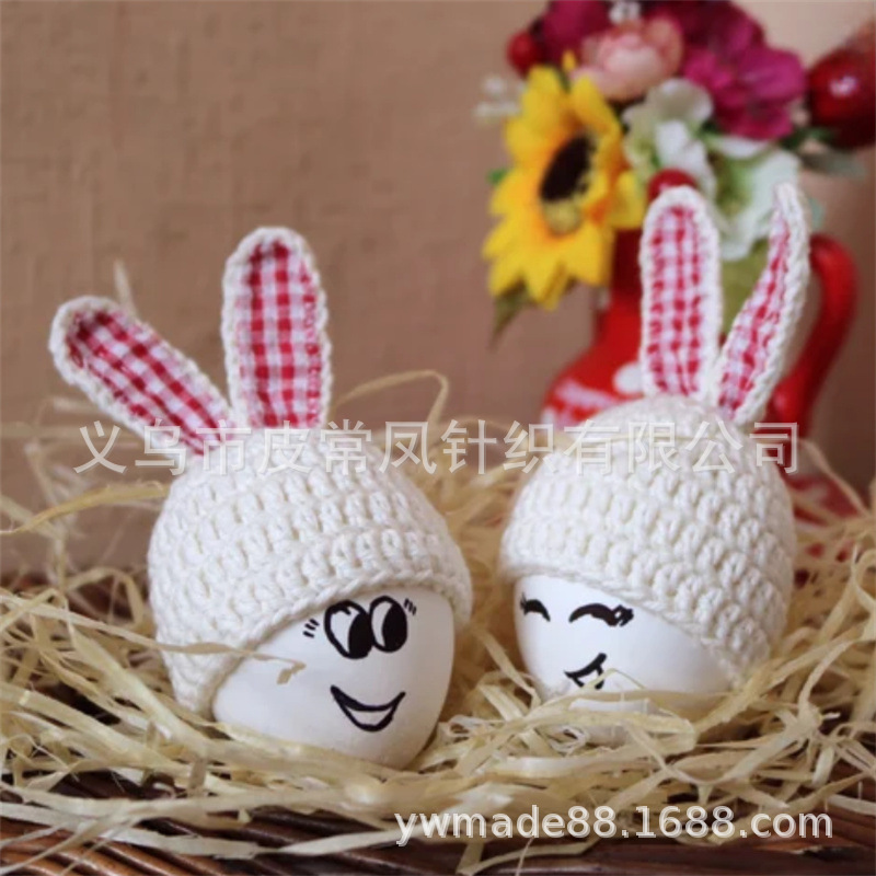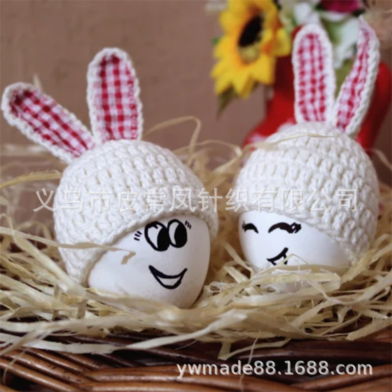 Новая внешнеторговая трансграничная вязанная крючком красно-белая клетчатая шапка с кроличьими ушками, защитный чехол для пасхального яйца, готовый продукт.