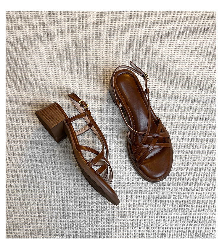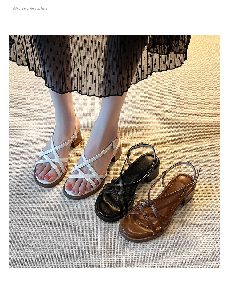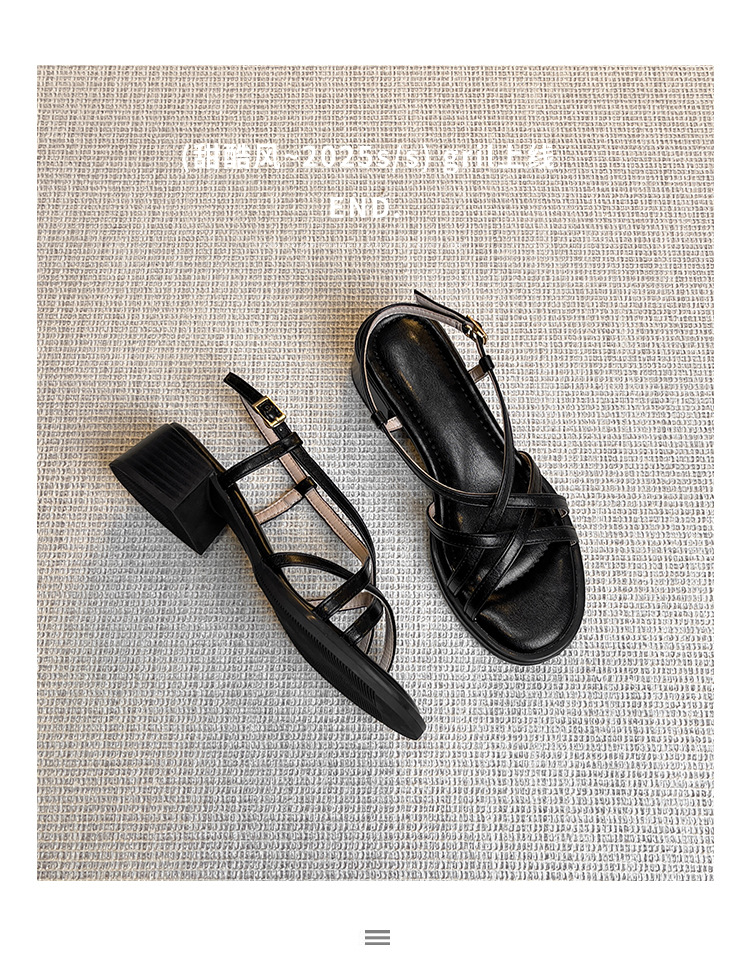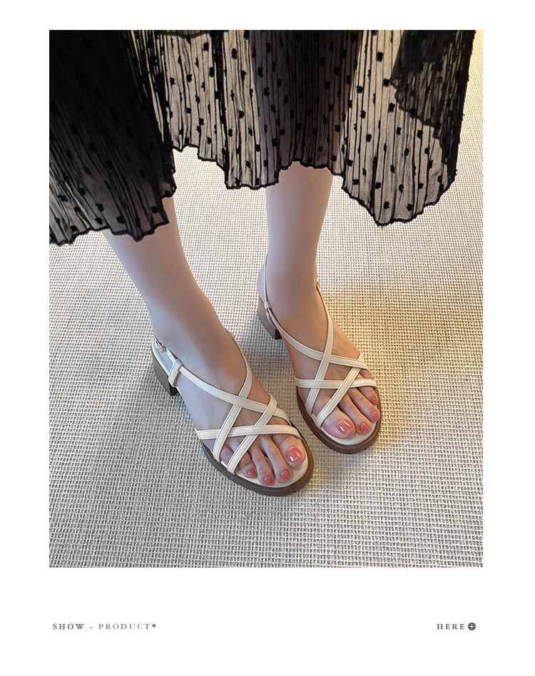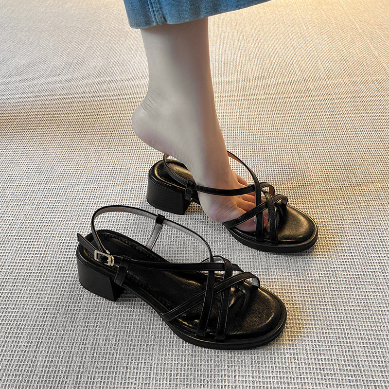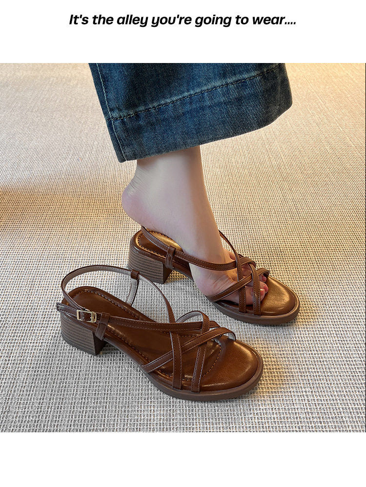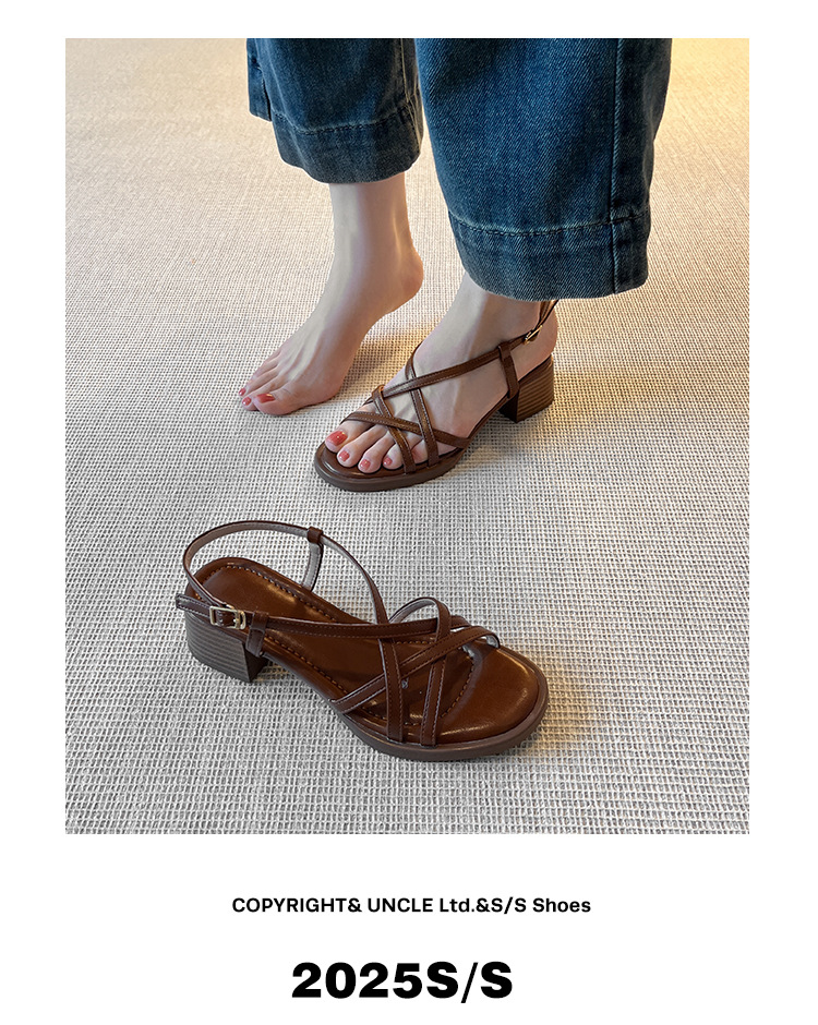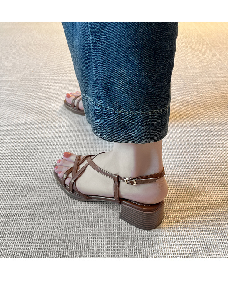 В наличии~~Женские летние новые стильные ретро-тапочки на среднем каблуке с перекрестными ремешками на толстом каблуке и тонкими ремешками.