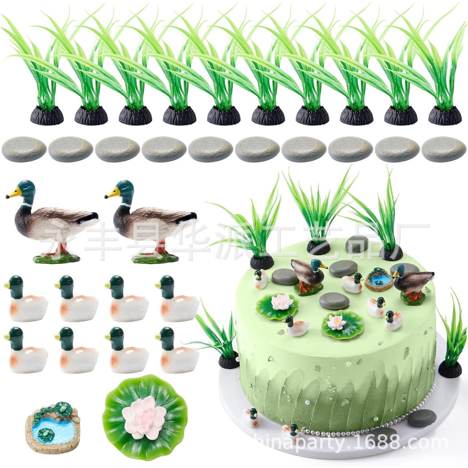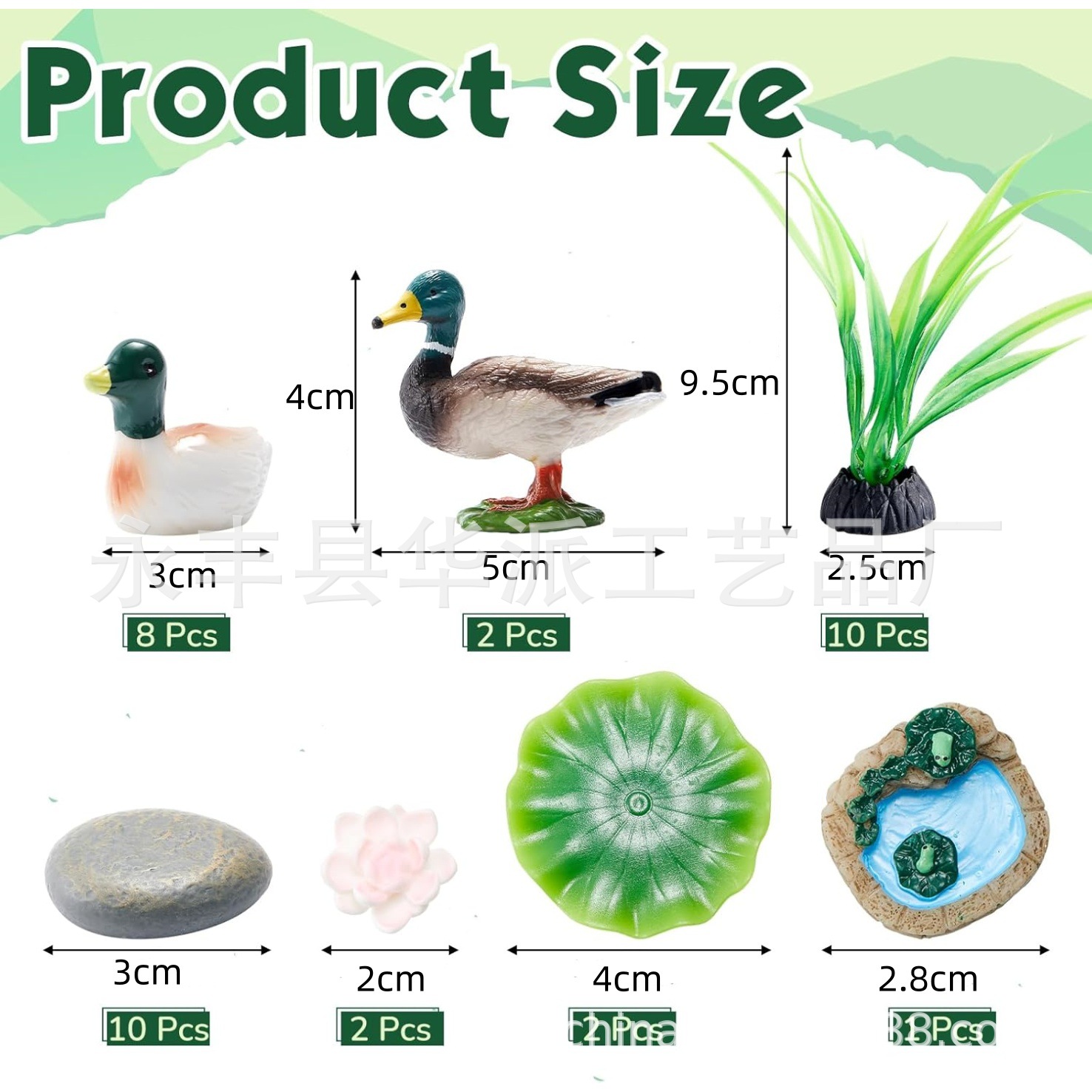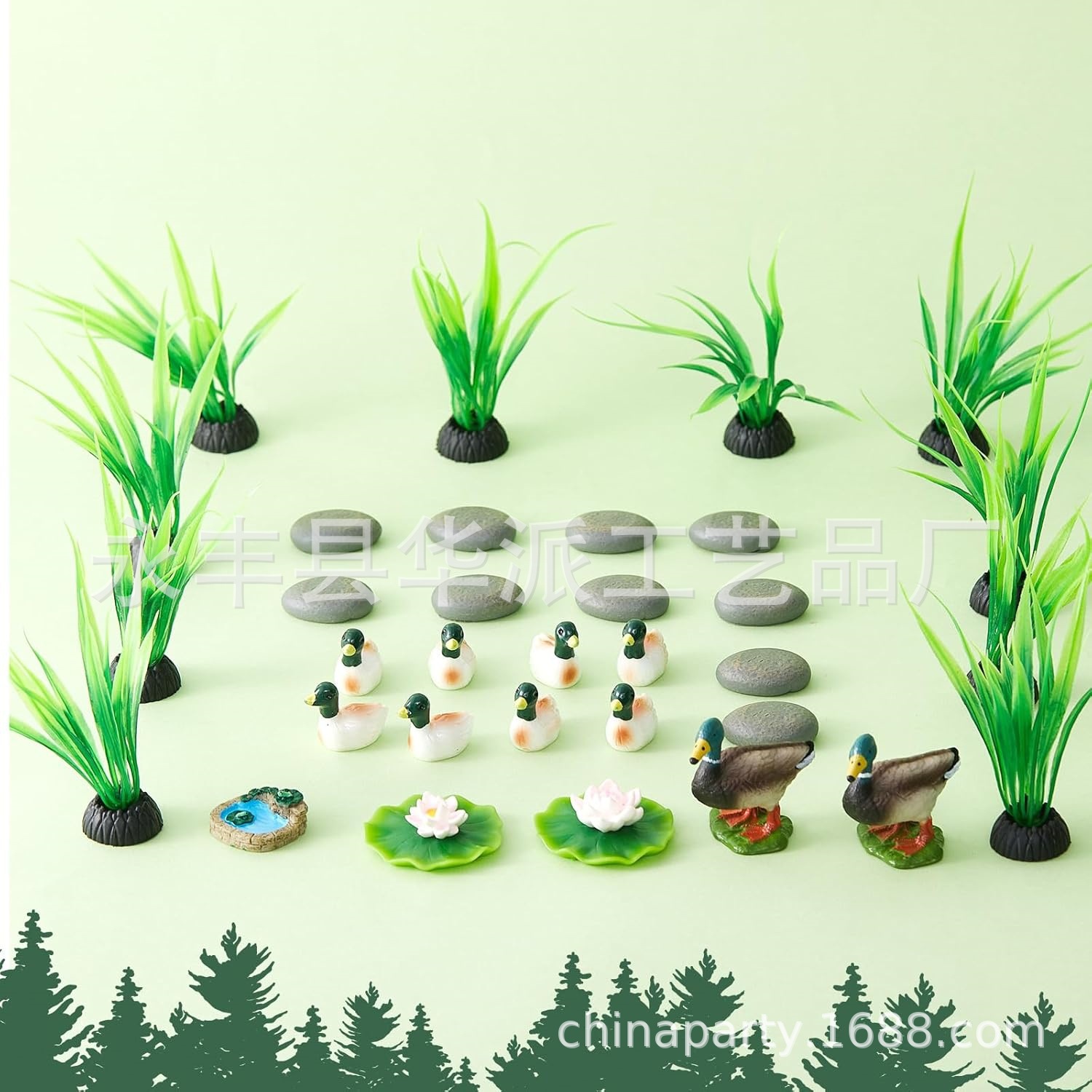 商品规格:8个野鸭模型、10 个仿真水草、2 个莲花、2 个莲花蕾、2 个盛开的莲花、1 个圆形池塘、10 块圆形石头