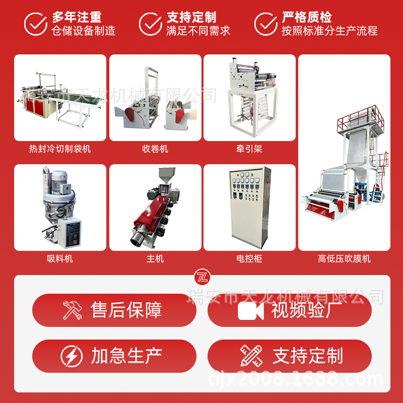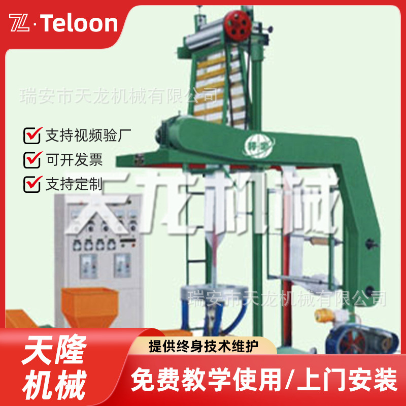 用途:本机组适用于吹制高密度聚乙烯(HDPE),低密度聚乙烯(LDPE)及线形低密度聚乙烯(LLDPE)塑料薄膜,广泛用于食品,服装,纺织品,日用品等民用品和工业品的包装.