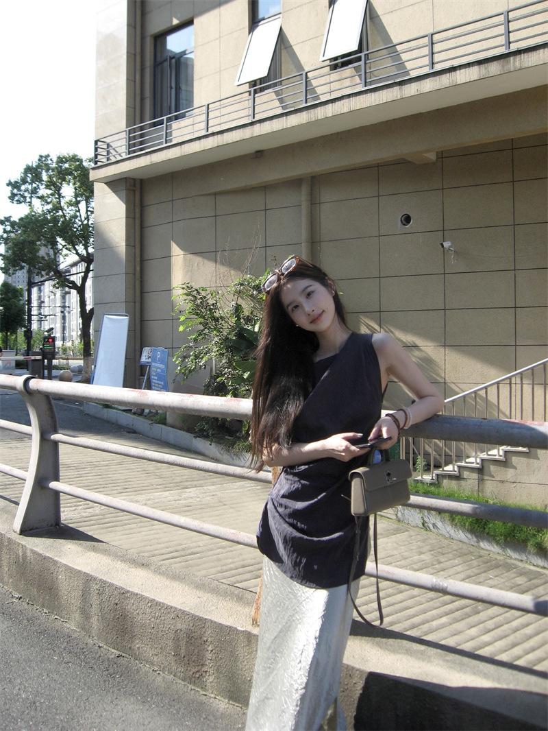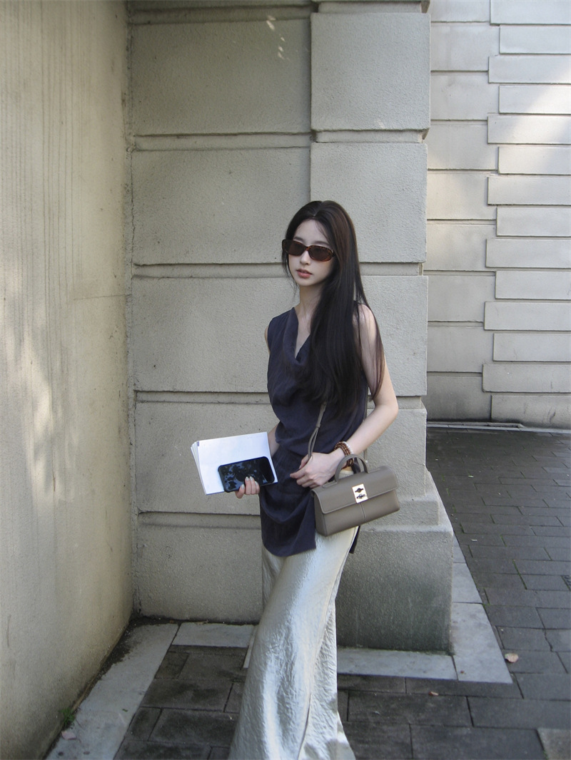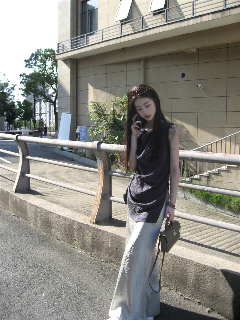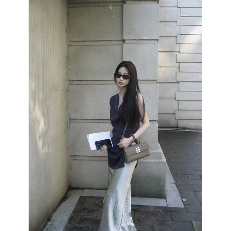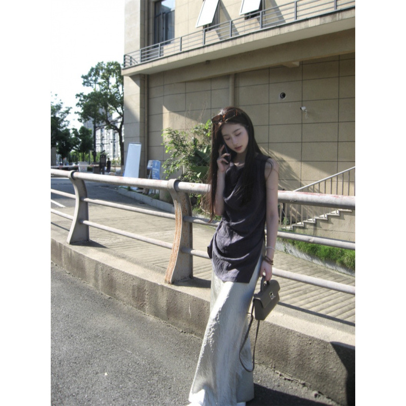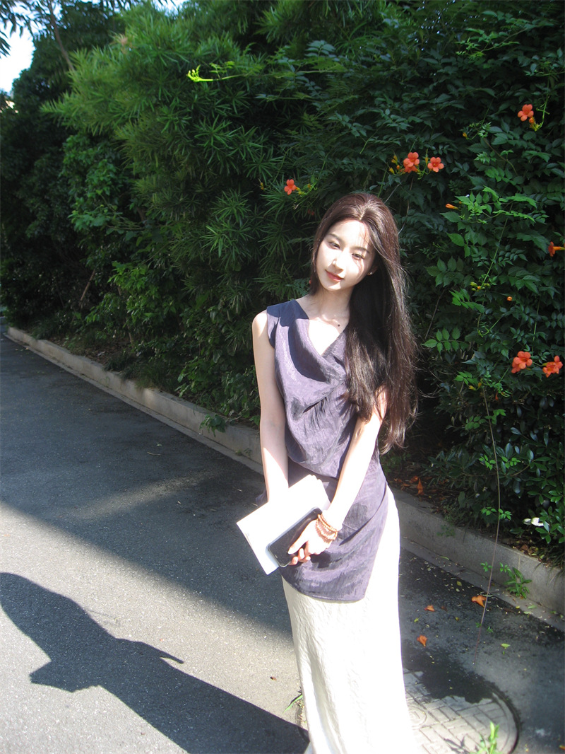 Реальные фотографии и реальные цены # Женский костюм премиум-класса: топ без рукавов с воротником-стойкой и складками, нишевый дизайн.