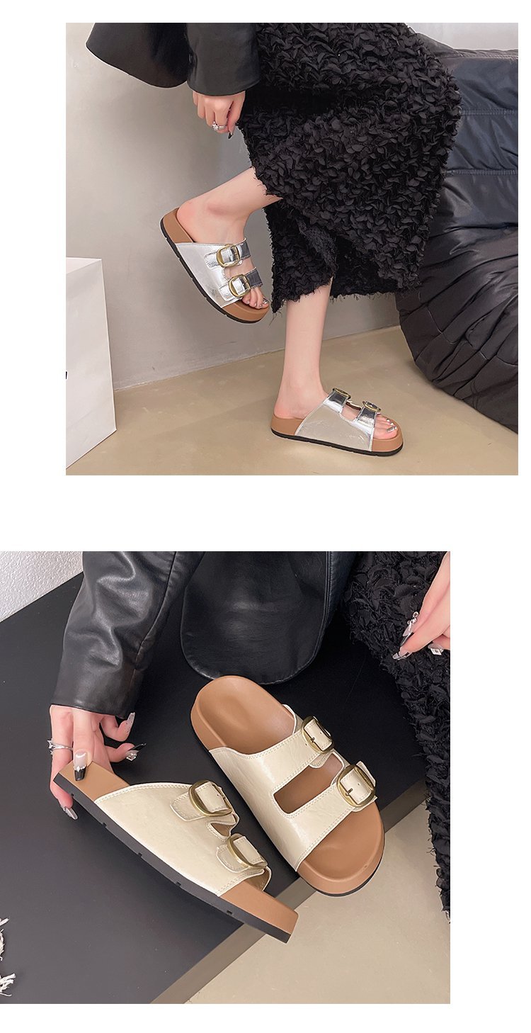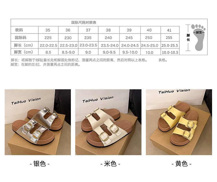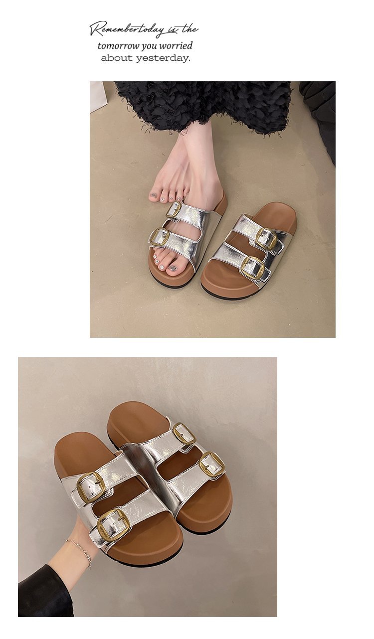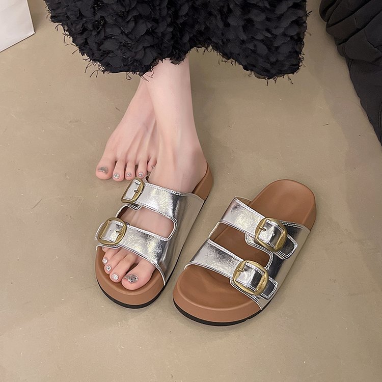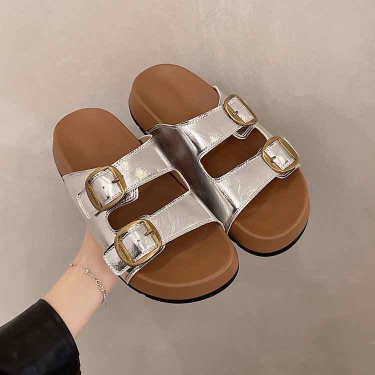 Модные простые женские сандалии в корейском стиле, дизайнерские пляжные тапочки с металлической пряжкой, серебряные удобные тапочки на толстой подошве.