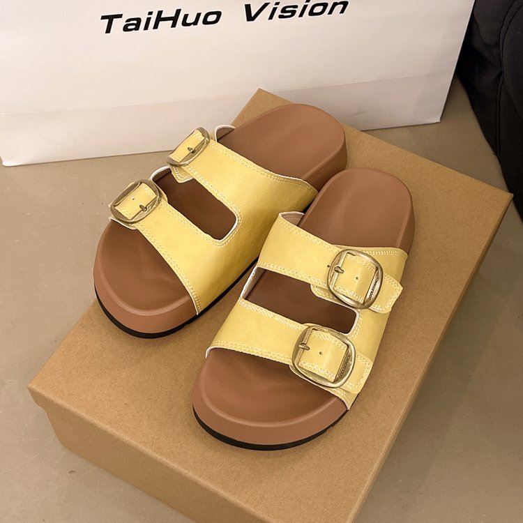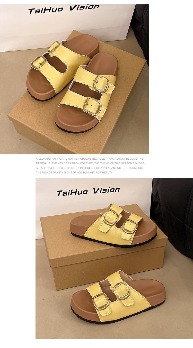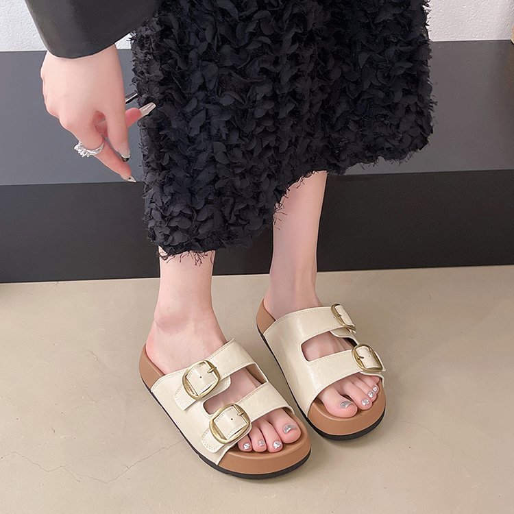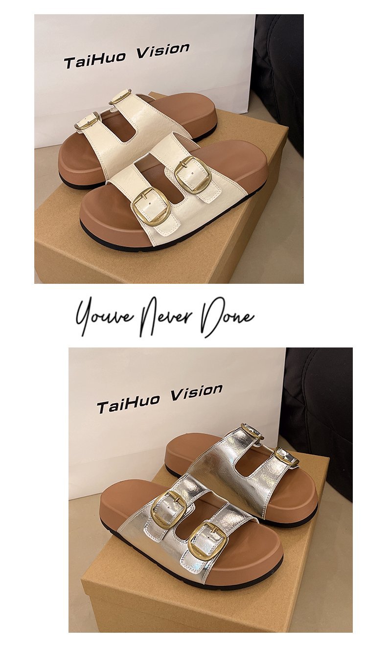 Модные простые женские сандалии в корейском стиле, дизайнерские пляжные тапочки с металлической пряжкой, серебряные удобные тапочки на толстой подошве.