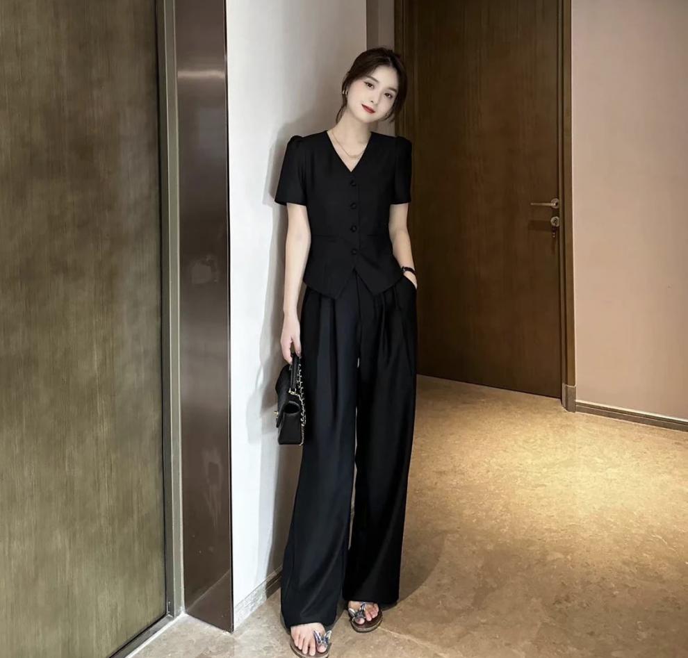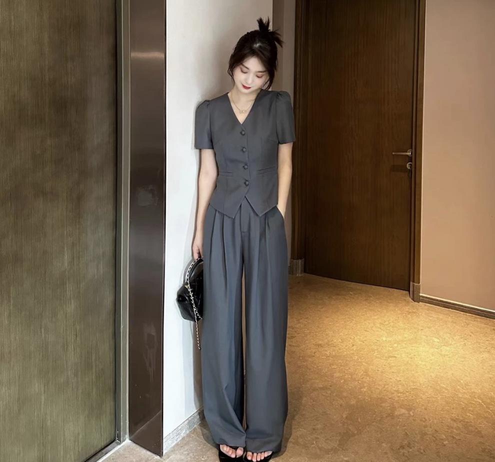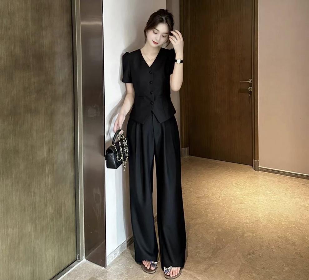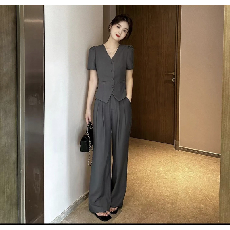 Твидовый стиль профессиональный костюм 2025 новый универсальный утягивающий топ с короткими рукавами и широкие брюки комплект из двух предметов