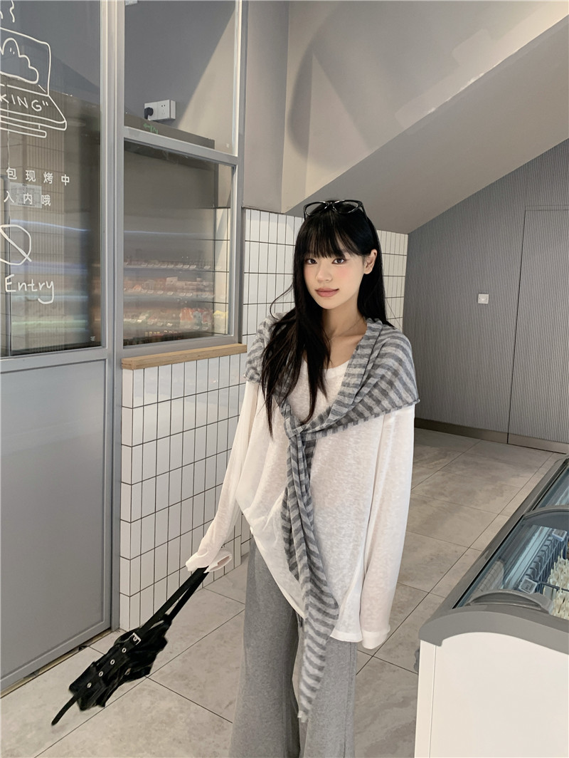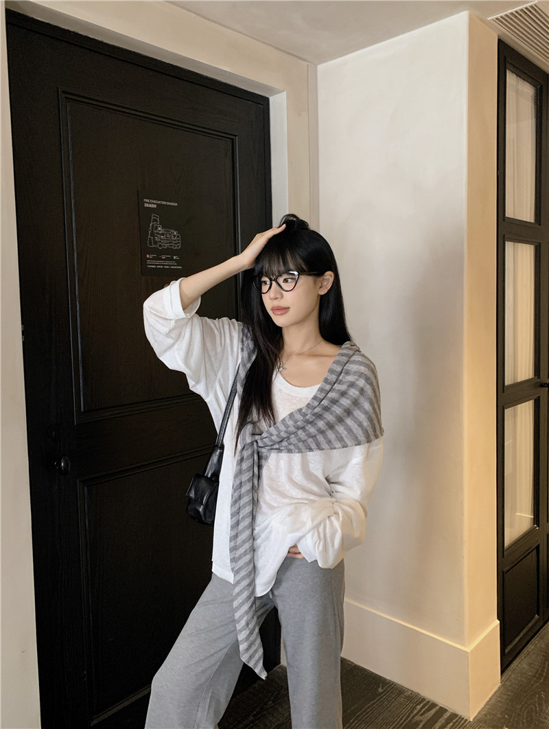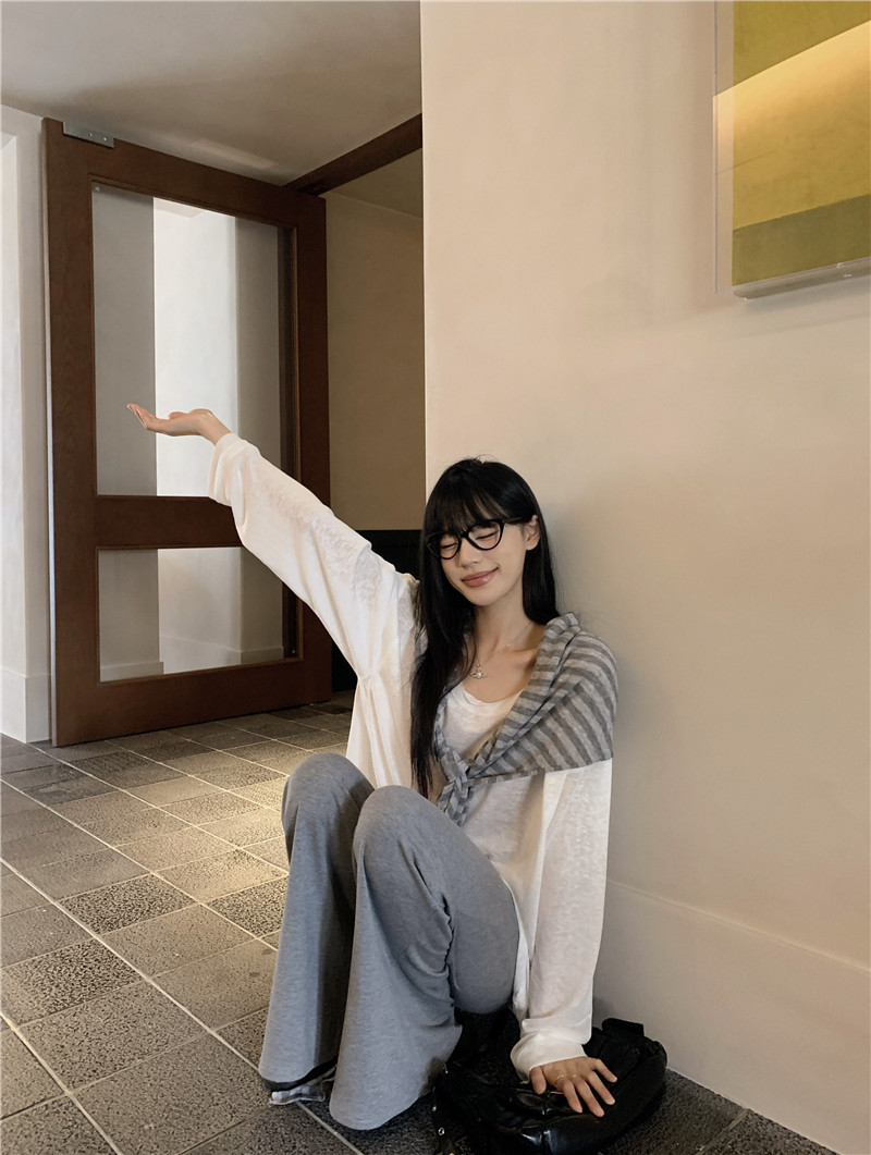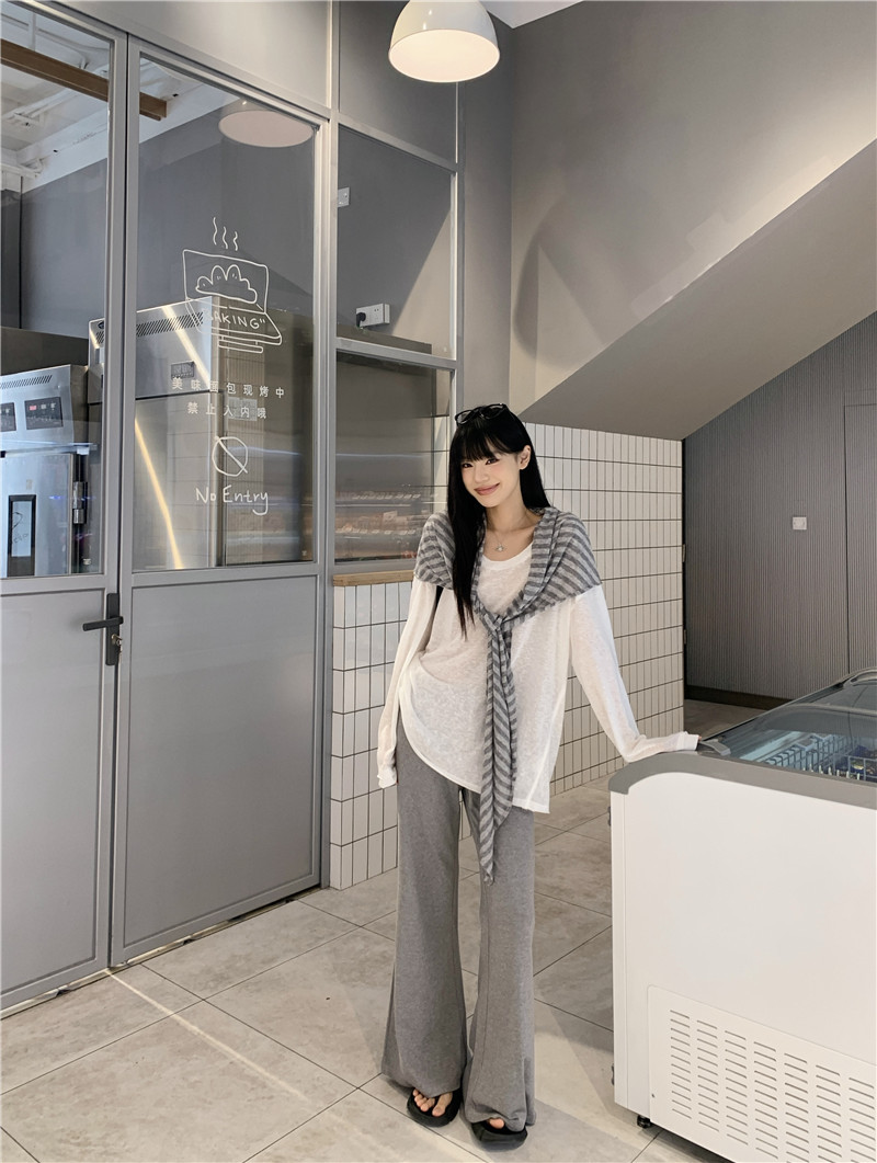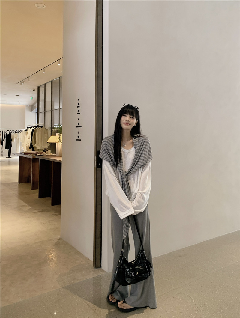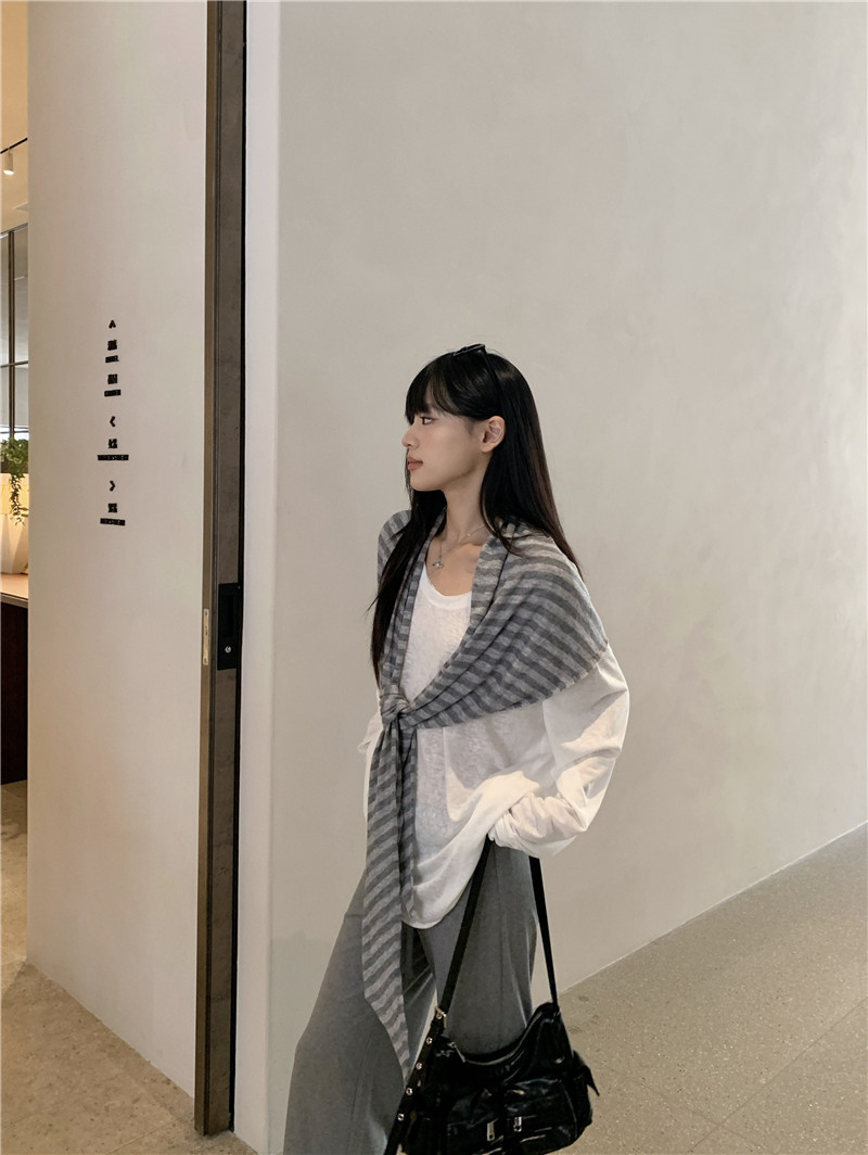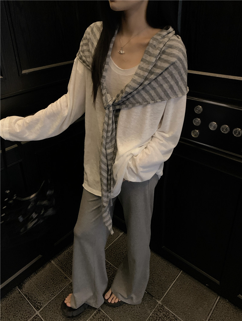 Белая солнцезащитная блузка; полосатая шаль; Серые брюки-ботинки