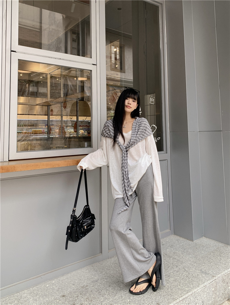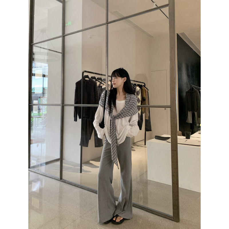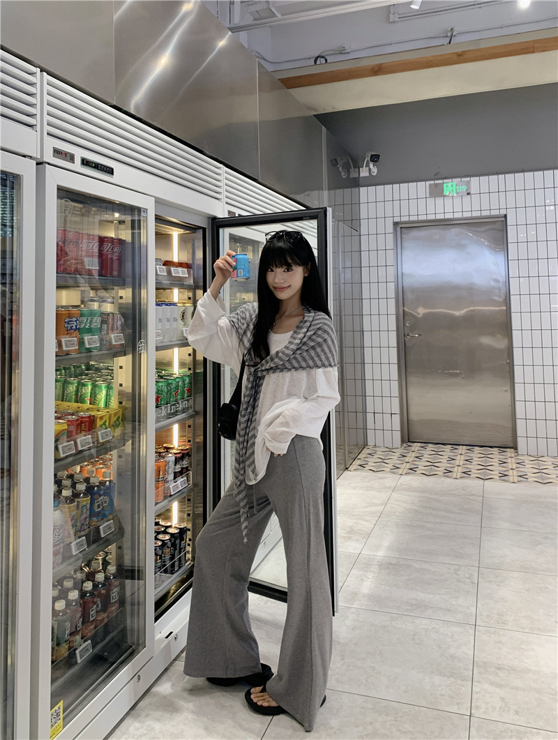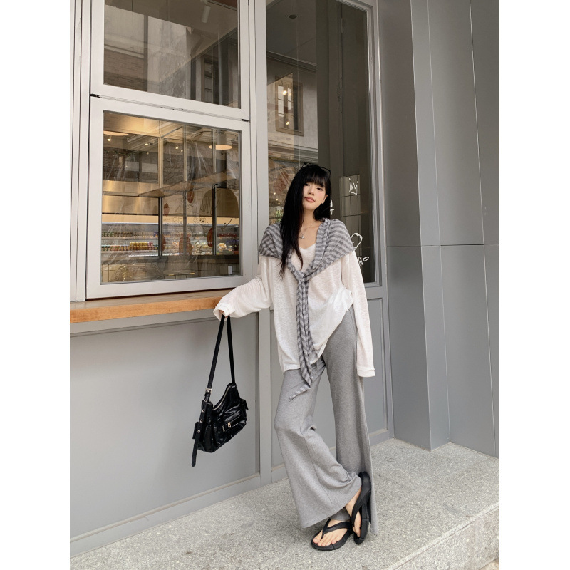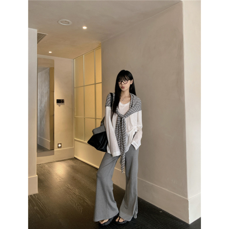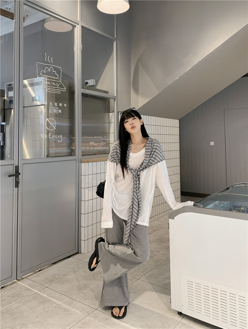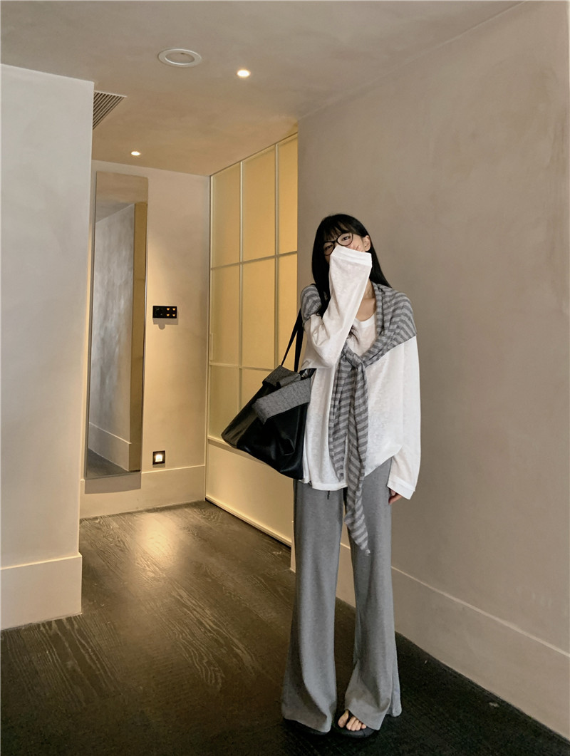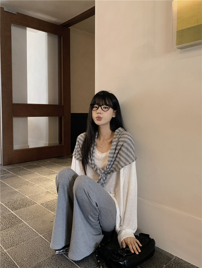 Белая солнцезащитная блузка; полосатая шаль; Серые брюки-ботинки