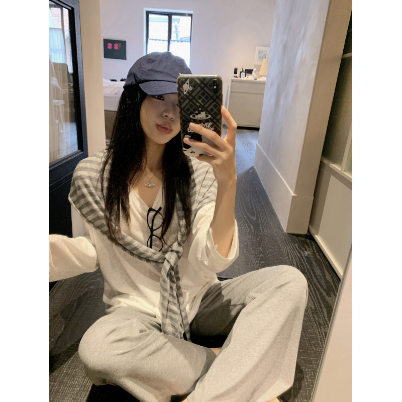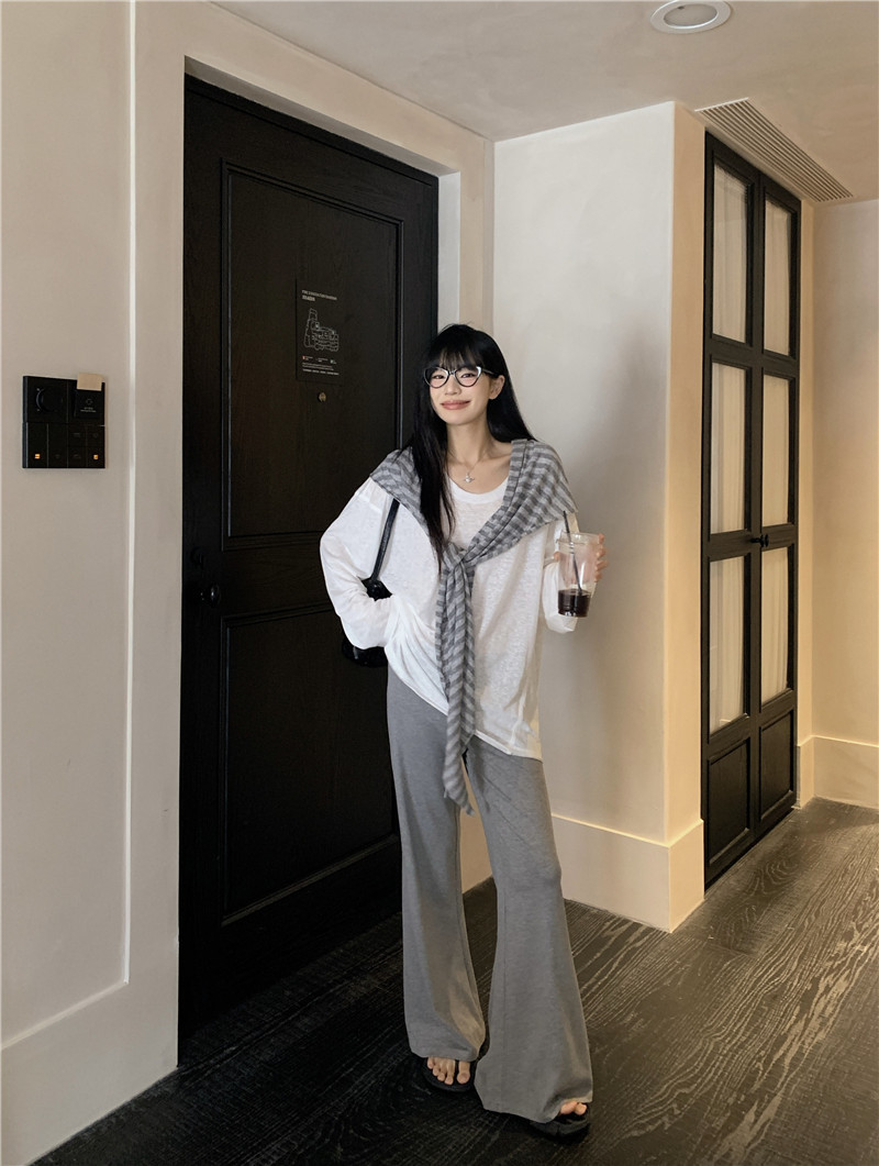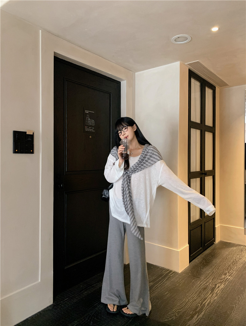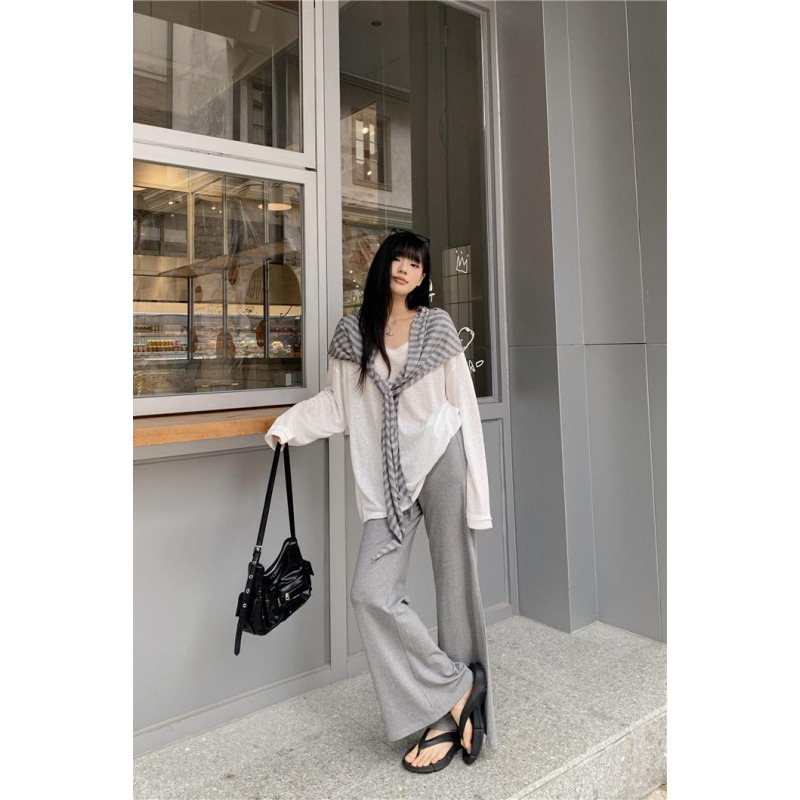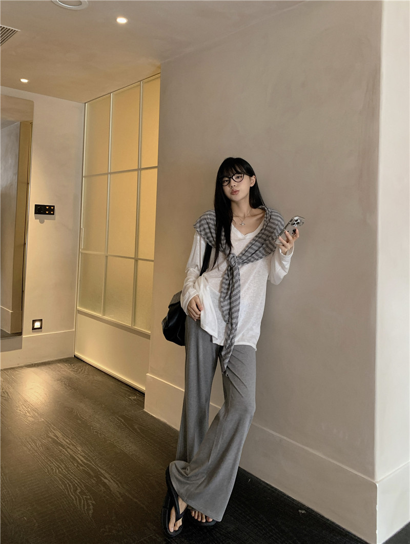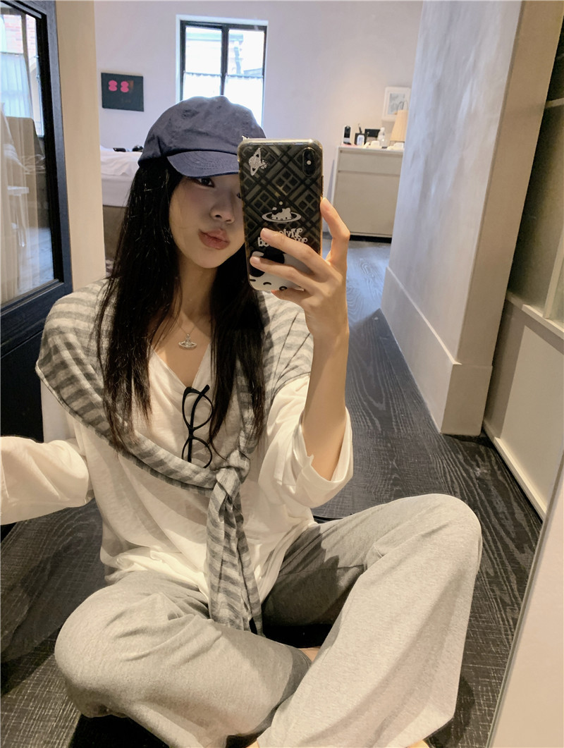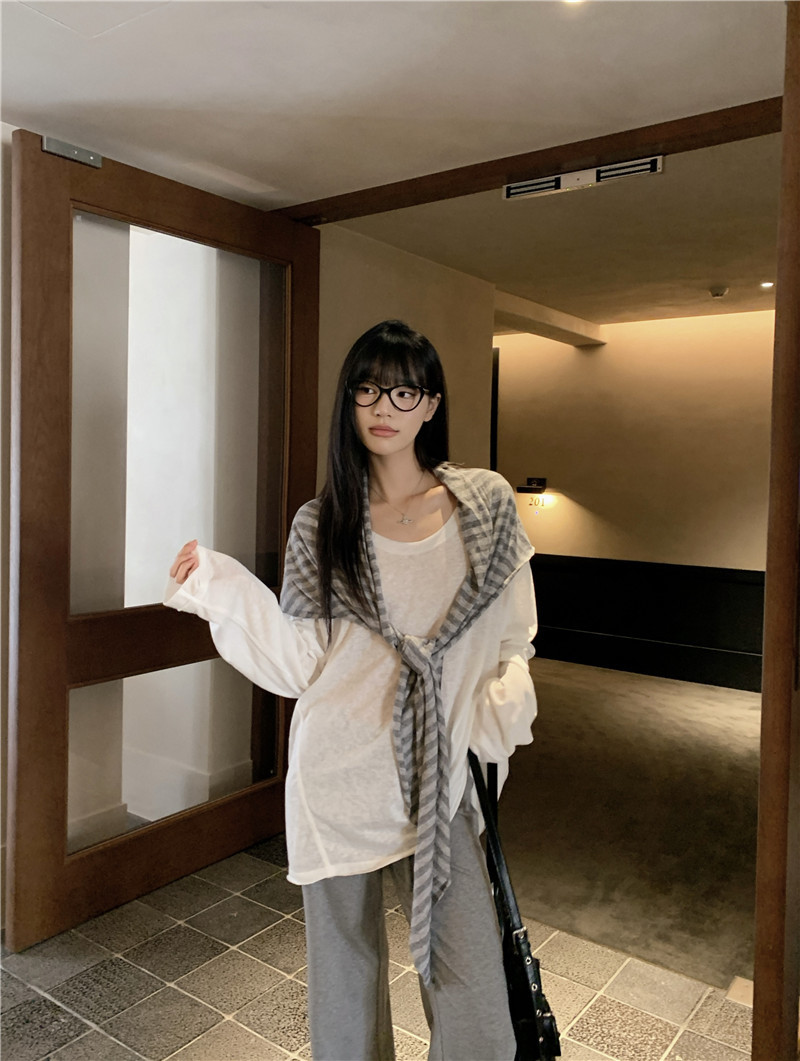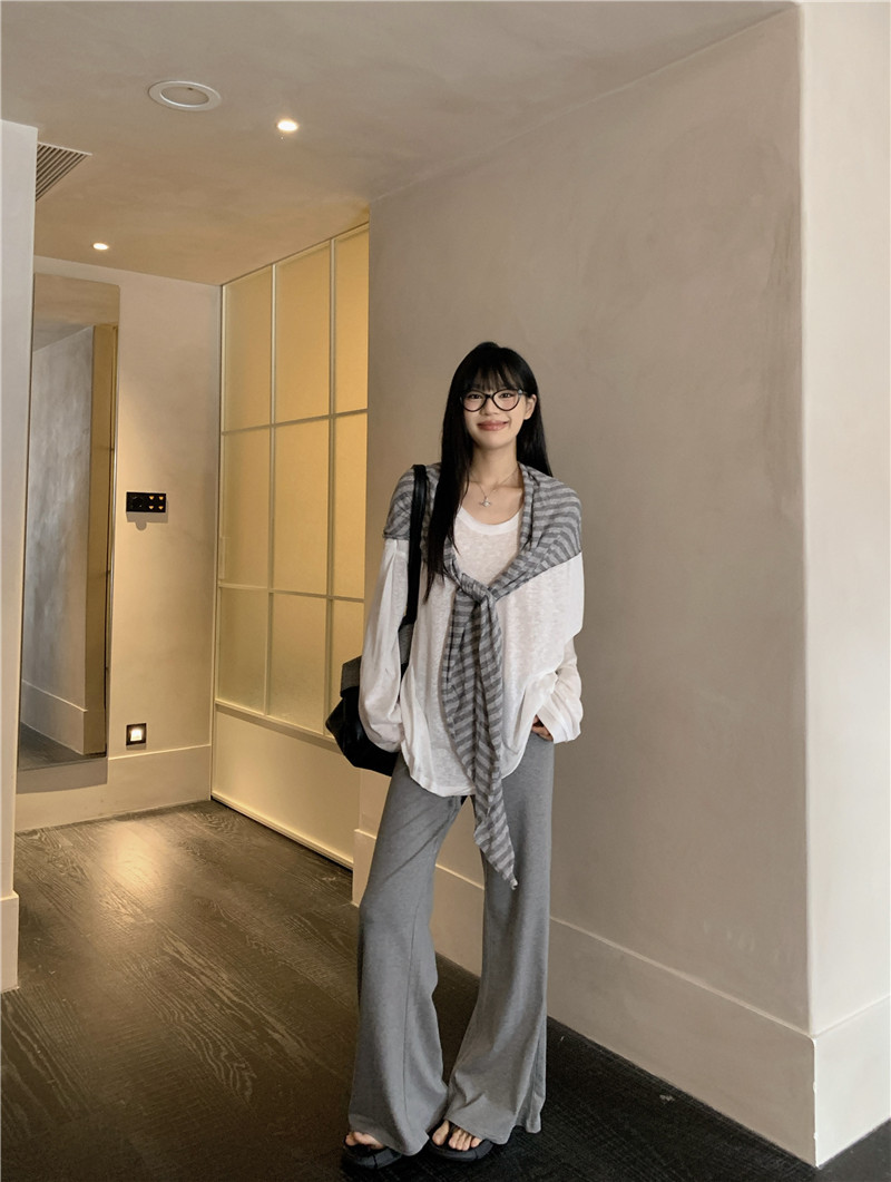 Белая солнцезащитная блузка; полосатая шаль; Серые брюки-ботинки