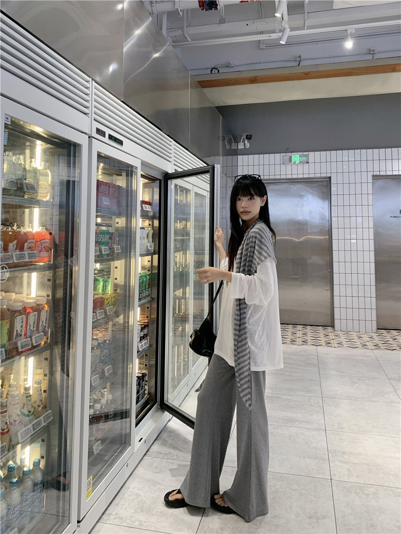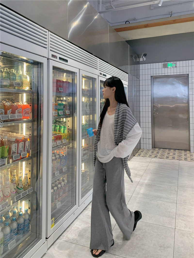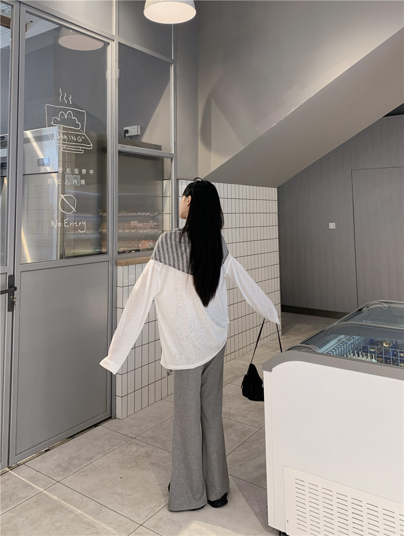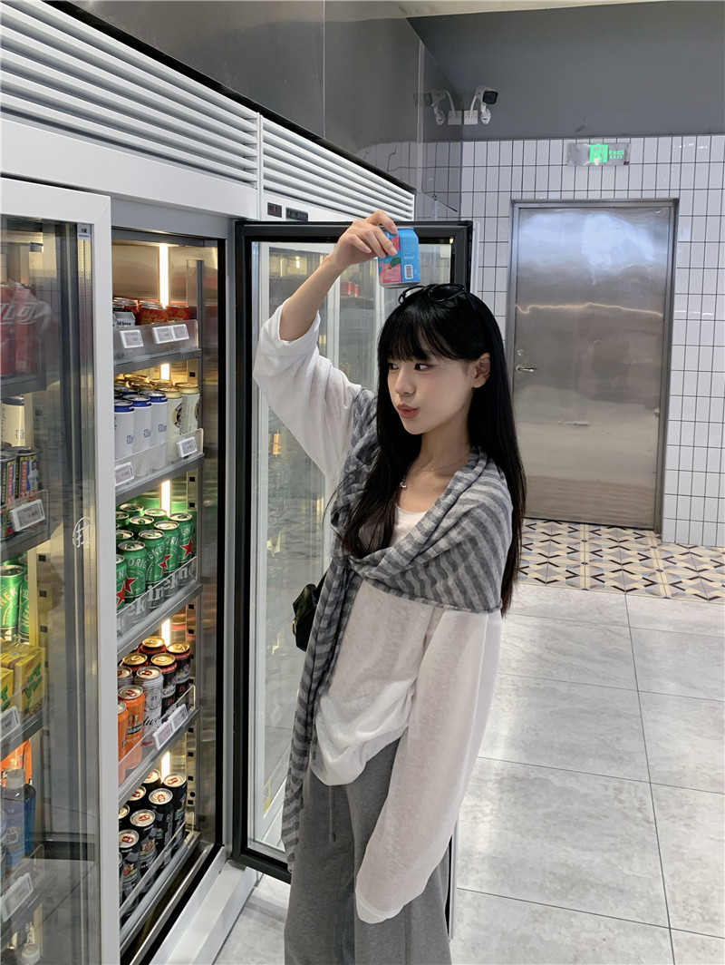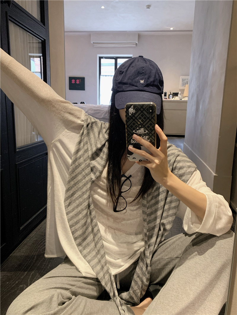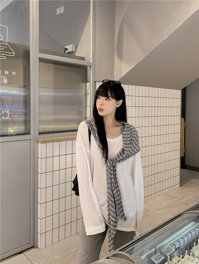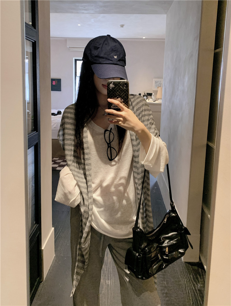 Реальный снимок, реальная цена, популярная солнцезащитная блузка в ленивом стиле, футболка, слегка расклешенная повседневная летняя длинная полосатая верхняя шаль