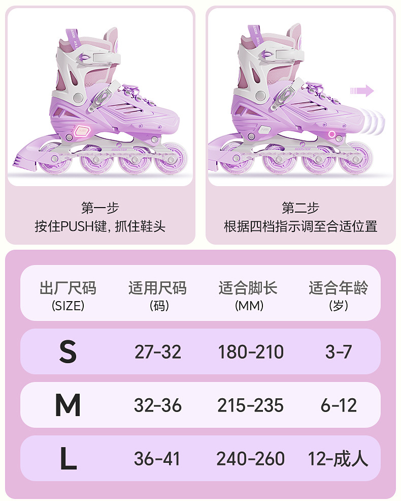 Размер S (подходит для детей 3-7 лет) нормальный размер обуви: 27-32.; Размер М (подходит для детей 6–12 лет). Обычный размер обуви: 32–36.; Размер L (применимо для детей от 12 лет и взрослых), нормальный размер обуви: 36–41.