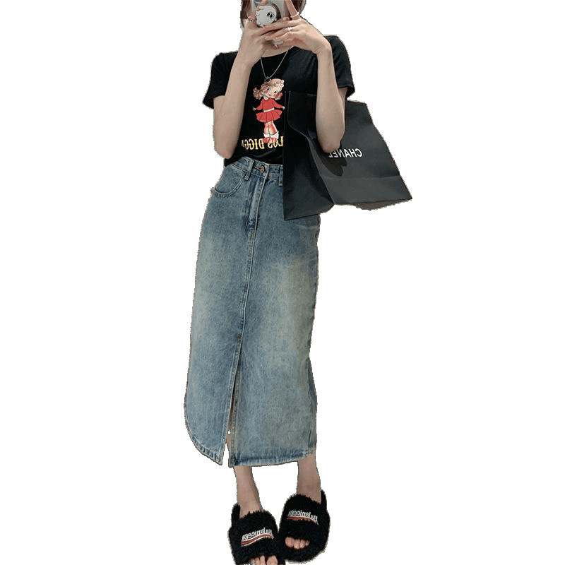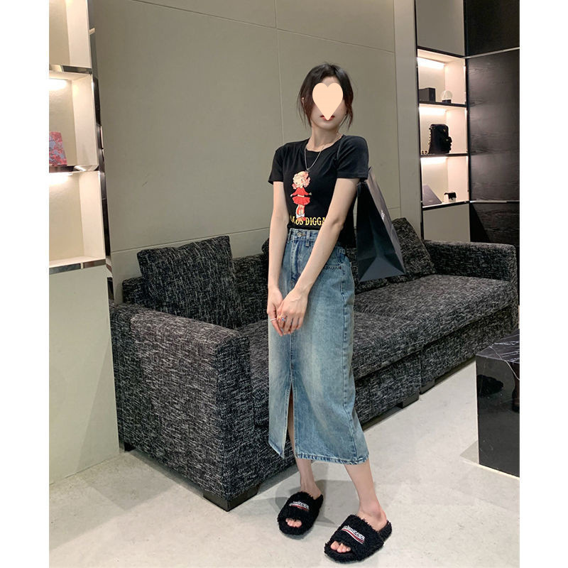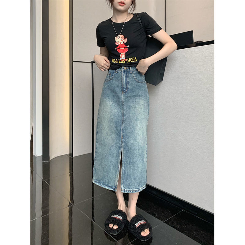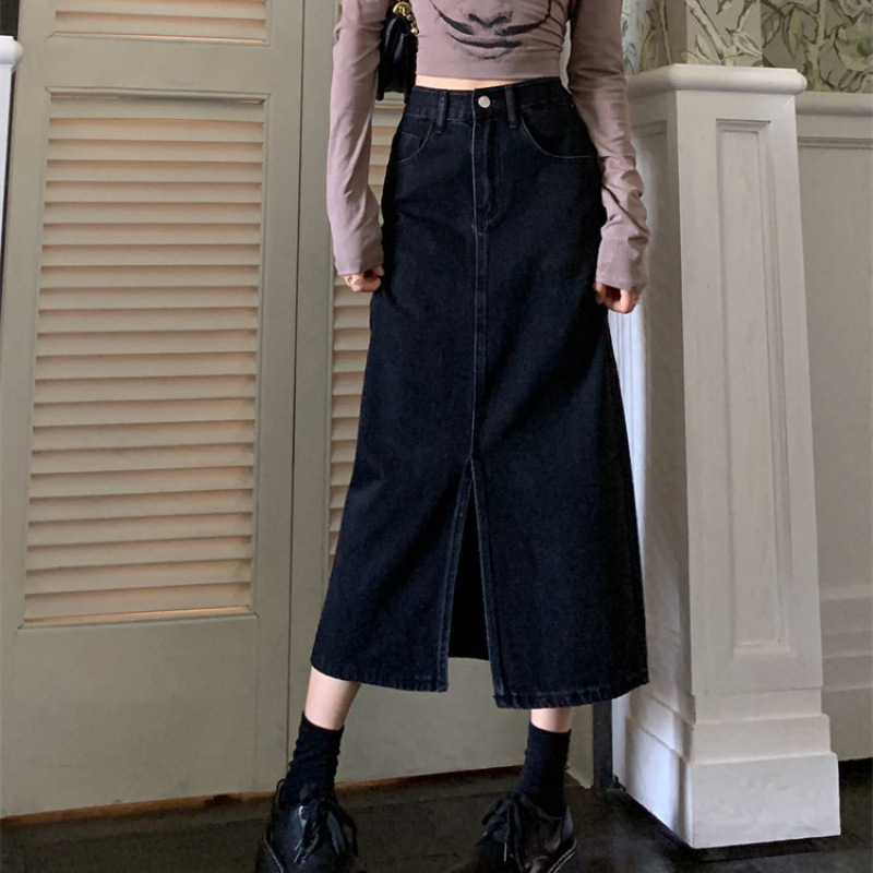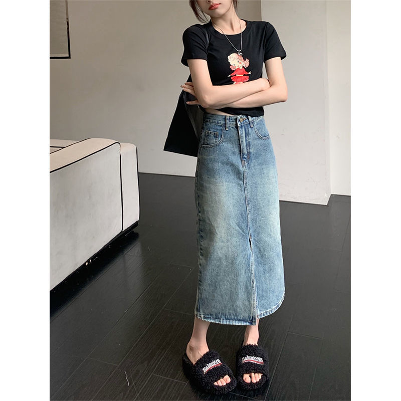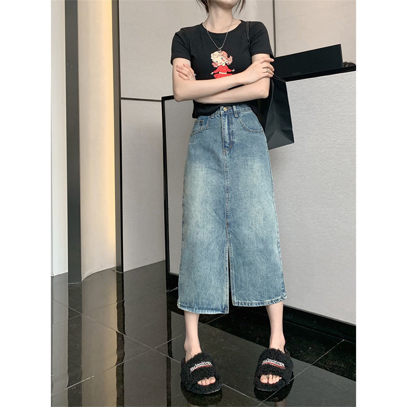 Ретро-юбка из денима с разрезом для женщин, весна-лето 2025, новая, высокая талия, облегающая, миди, модная