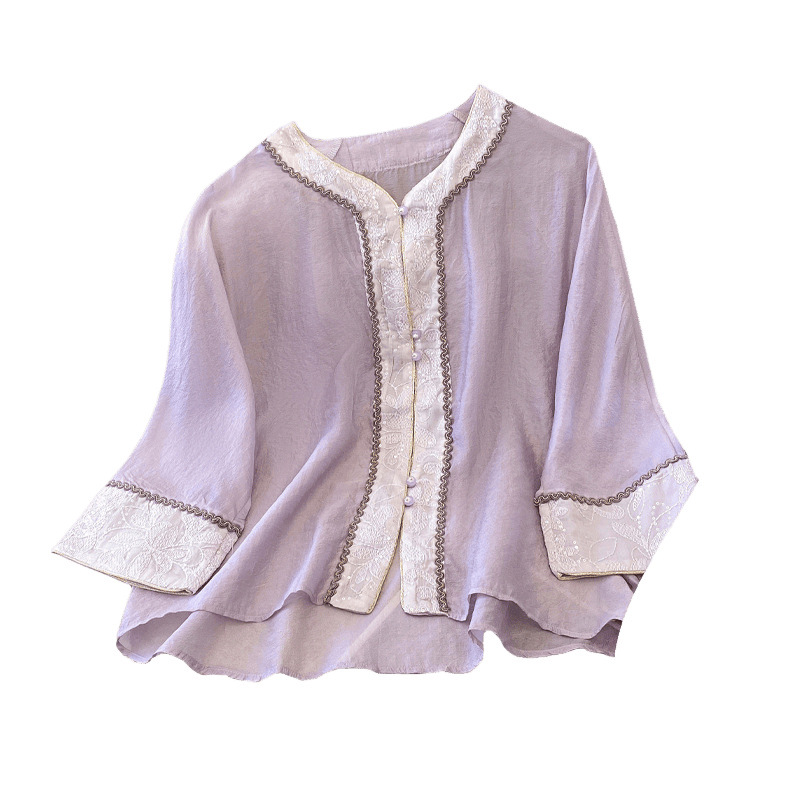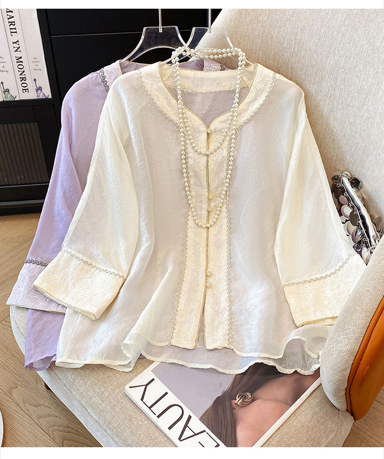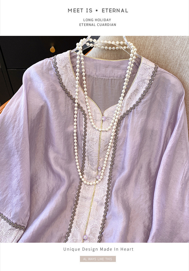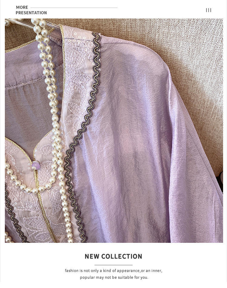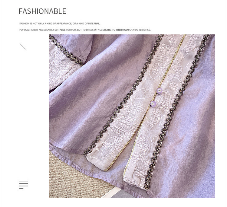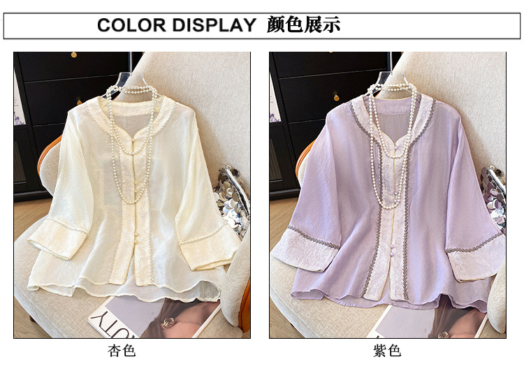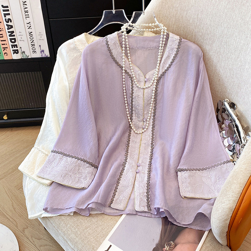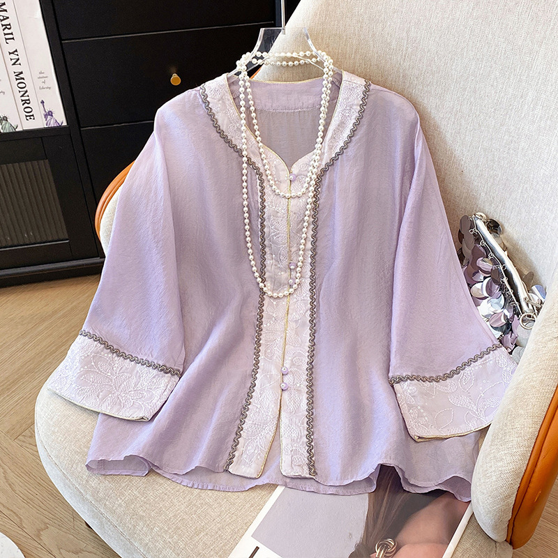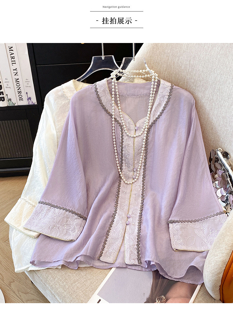 Настоящая фотография нового легкого тюлевого солнцезащитного кардигана в китайском стиле в национальном стиле для женщин, летняя фиолетовая верхняя одежда, имитация шелка, стильный дух феи, прозрачный