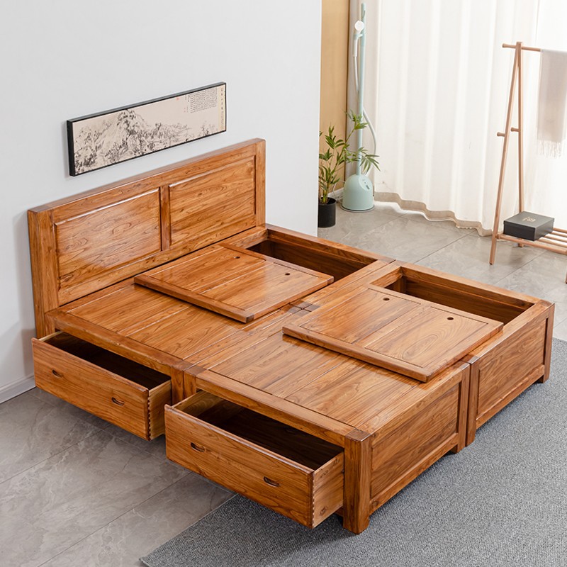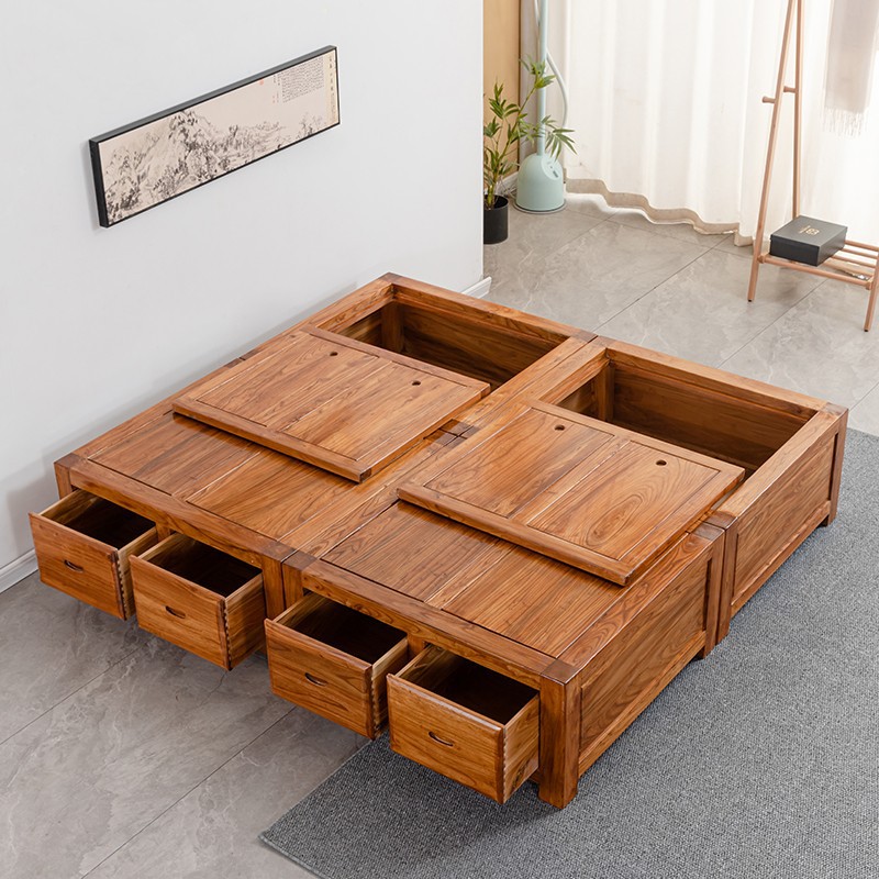 Двуспальная кровать из массива старого вяза с татами, соединением «паз-гребень», выдвижным ящиком и высоким ящиком для хранения, полностью из массива дерева.