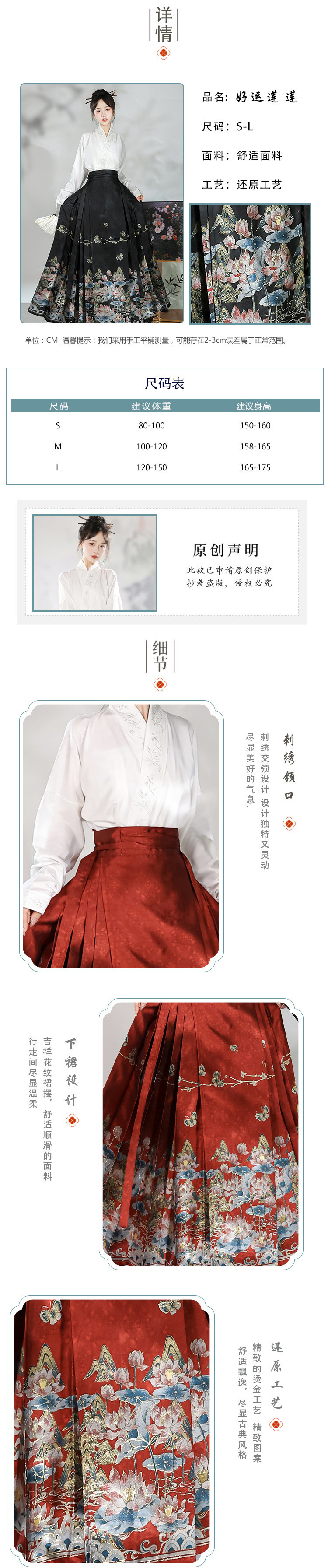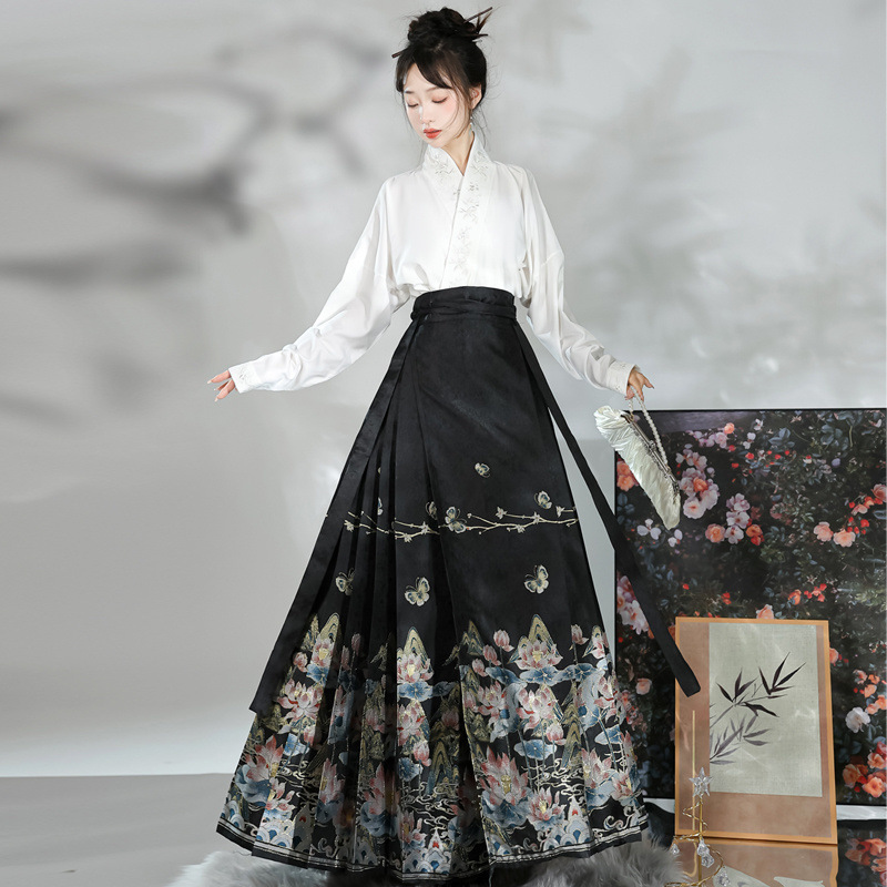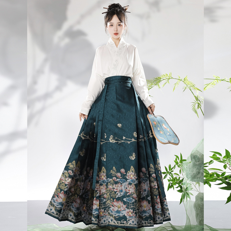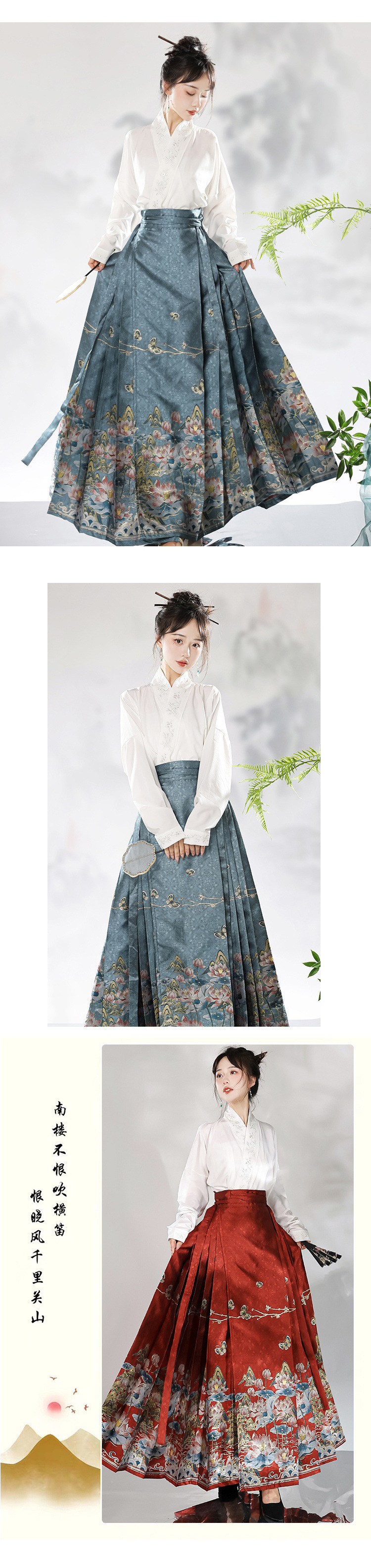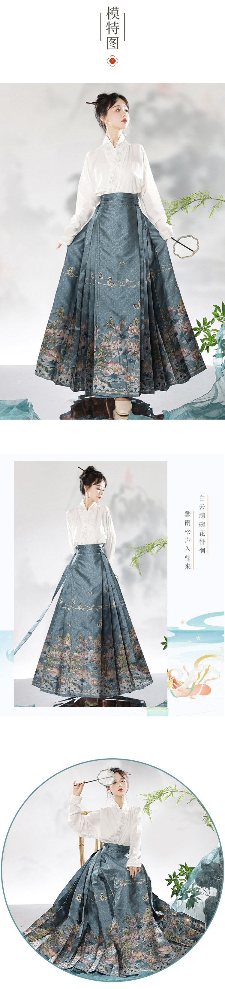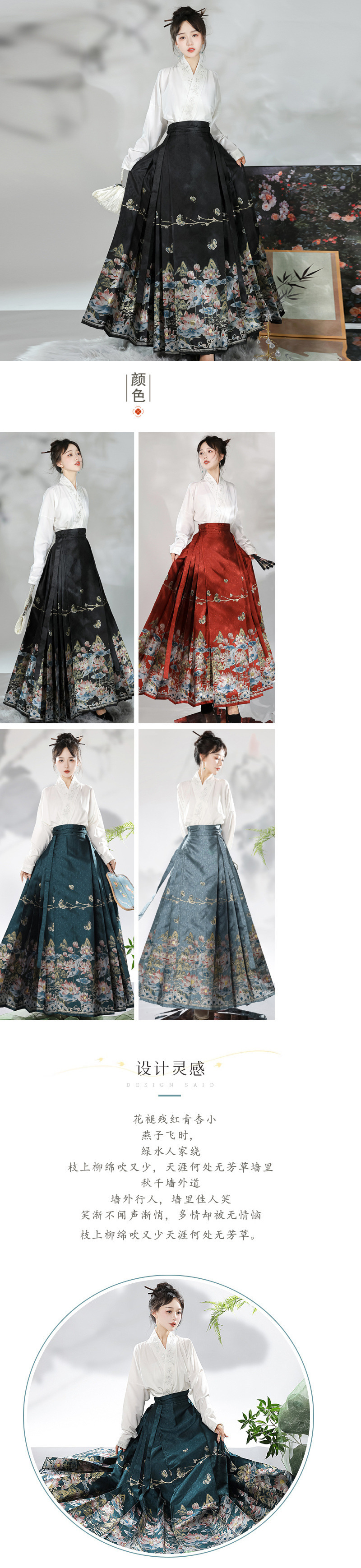Юбка с конским лицом Мо Сюань; Юбка с лицом лошади из киновари; Юбка с бамбуковым лунным конским лицом; Темно-зеленая юбка-лошадь; Белые рукава-самолеты + черная юбка-лошадь.; Белые рукава-самолеты + юбка-лошадь из киновари.; Белые рукава-самолеты + бамбуковая юбка в виде лунного коня; Белые рукава-самолеты + темно-зеленая юбка-лошадь.
