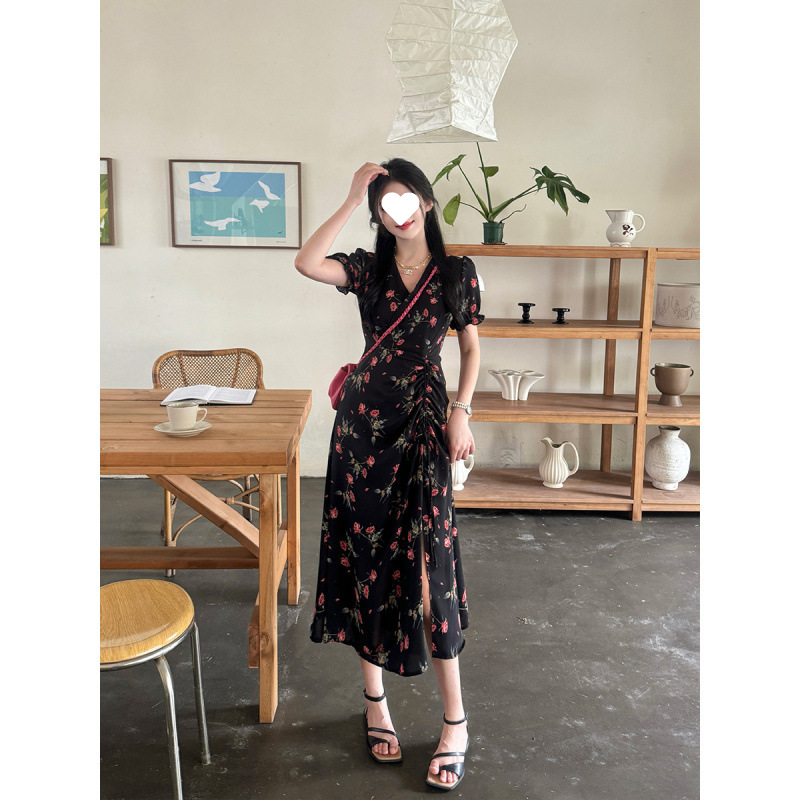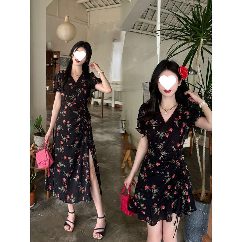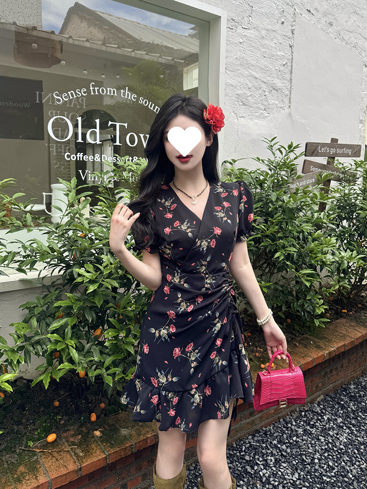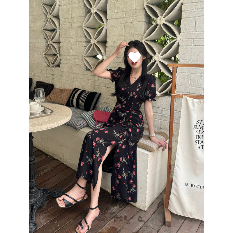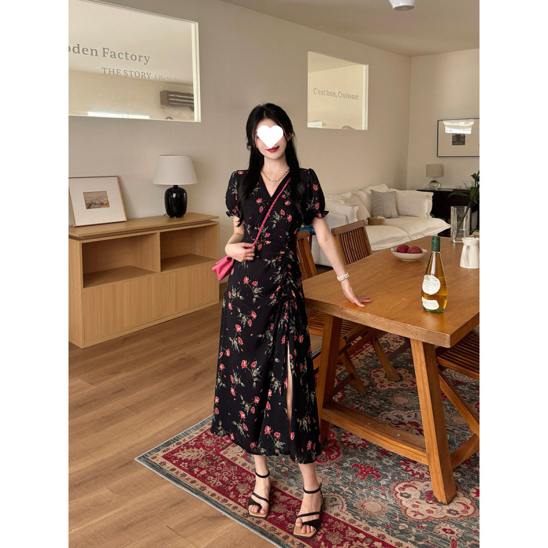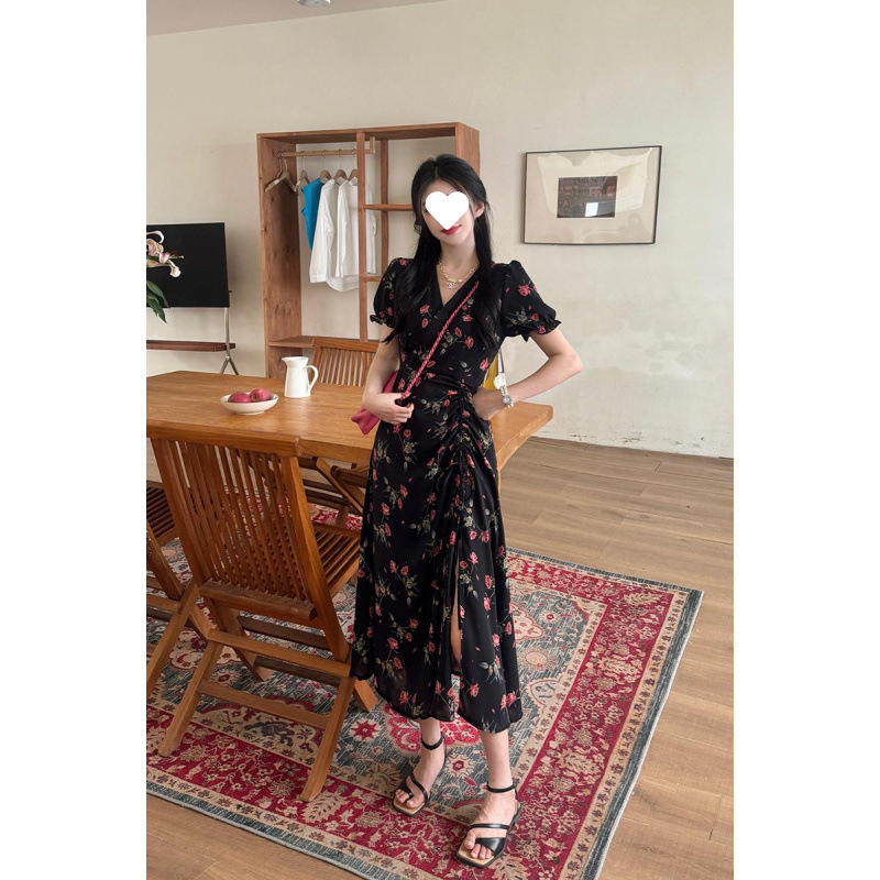 Настоящее фото женского платья больших размеров для перерыва на чай с французским цветочным принтом и разрезом в форме рыбы, утягивающее платье для полных девушек, чтобы скрыть свое тело и утянуть талию.