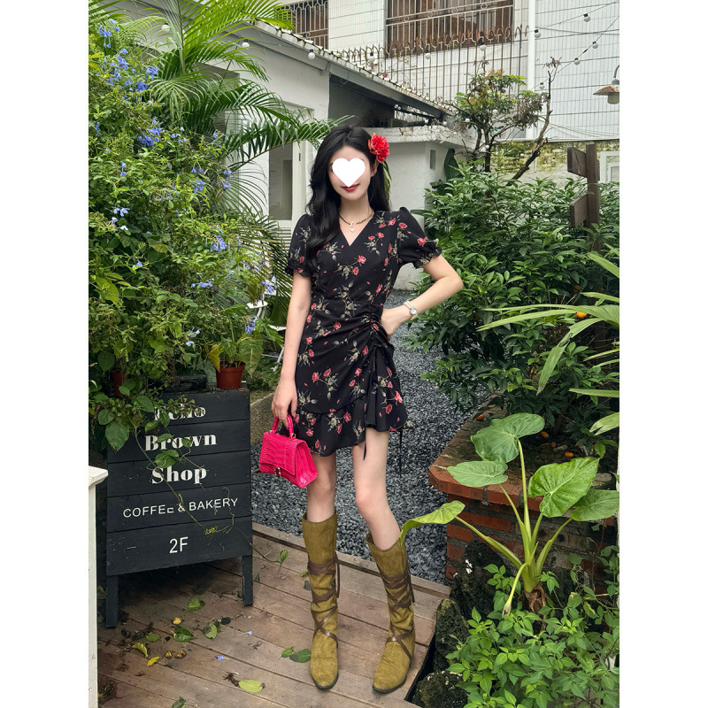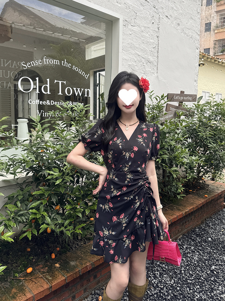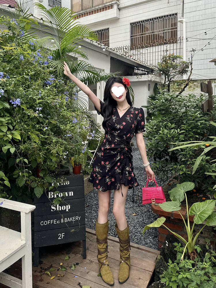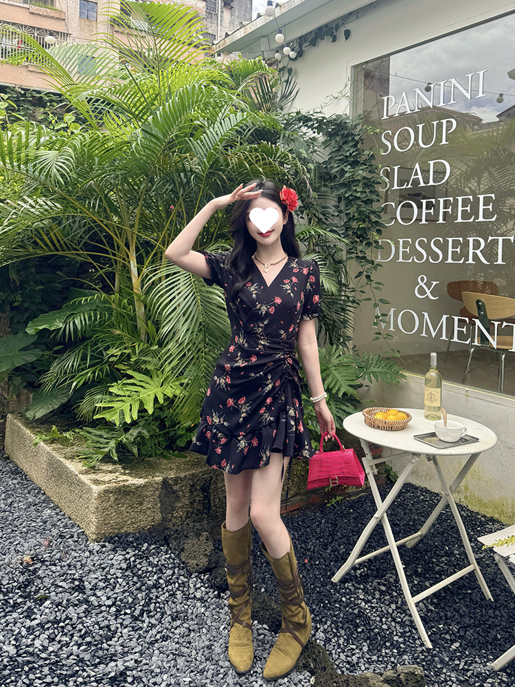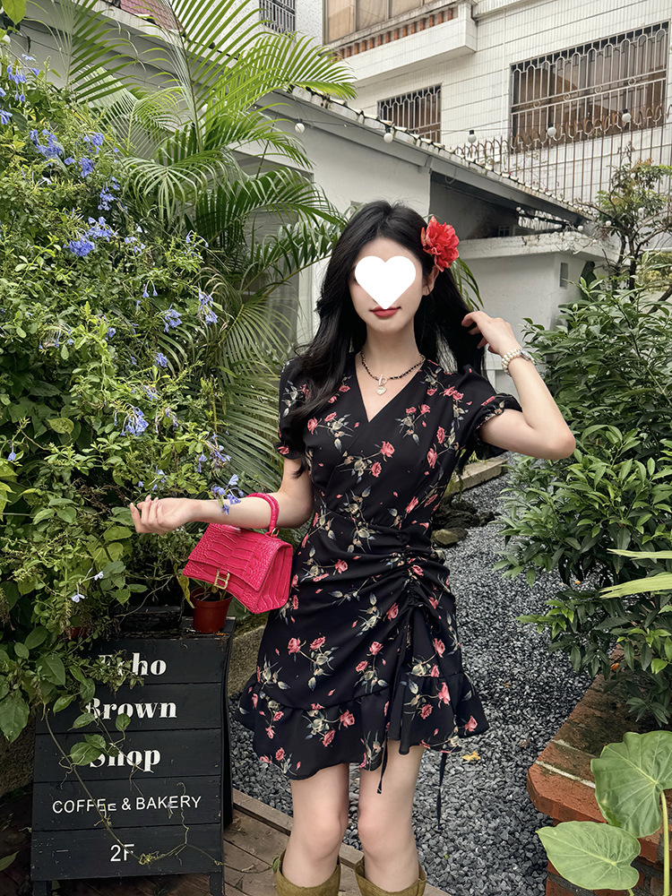 Настоящее фото женского платья больших размеров для перерыва на чай с французским цветочным принтом и разрезом в форме рыбы, утягивающее платье для полных девушек, чтобы скрыть свое тело и утянуть талию.