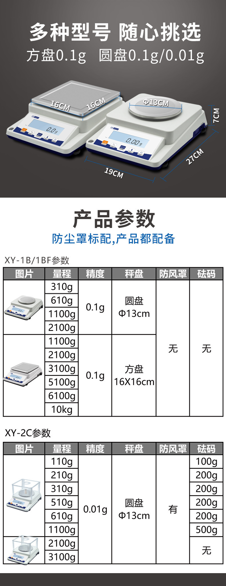 Диапазон дисков XY1000-1B 1100 г, точность 0,1 г; Диапазон дисков XY2000-1B 2100 г, точность 0,1 г; XY3000-1BF диапазон квадратных пластин 3100 г, точность 0,1 г; XY5000-1BF диапазон квадратных пластин 5100 г, точность 0,1 г; Диапазон XY5MB 5 кг, точность 0,1 г; Диапазон XY10MB 10 кг, точность 0,1 г; Диапазон XY15MB 15 кг, точность 0,1 г; Диапазон XY20MB 21 кг, точность 0,1 г; Диапазон XY25MB 26 кг, точность 0,1 г; Диапазон XY28MB 28 кг, точность 0,1 г; XY200-2C диапазон измерения 210 г, точность 0,01 г; XY300-2C диапазон измерения 310 г, точность 0,01 г; XY600-2C диапазон измерения 610 г, точность 0,01 г; XY1000-2C диапазон измерения 1100 г, точность 0,01 г; XY2000-2C диапазон измерения 2100 г, точность 0,01 г; Диапазон XY3000-2C 3100 г, точность 0,01 г; JA3000C диапазон измерения 3000 г, точность 0,01 г, алюминиевый корпус; JA4000C диапазон измерения 4000 г, точность 0,01 г, алюминиевый корпус; JA5000C диапазон измерения 5000 г, точность 0,01 г, алюминиевый корпус