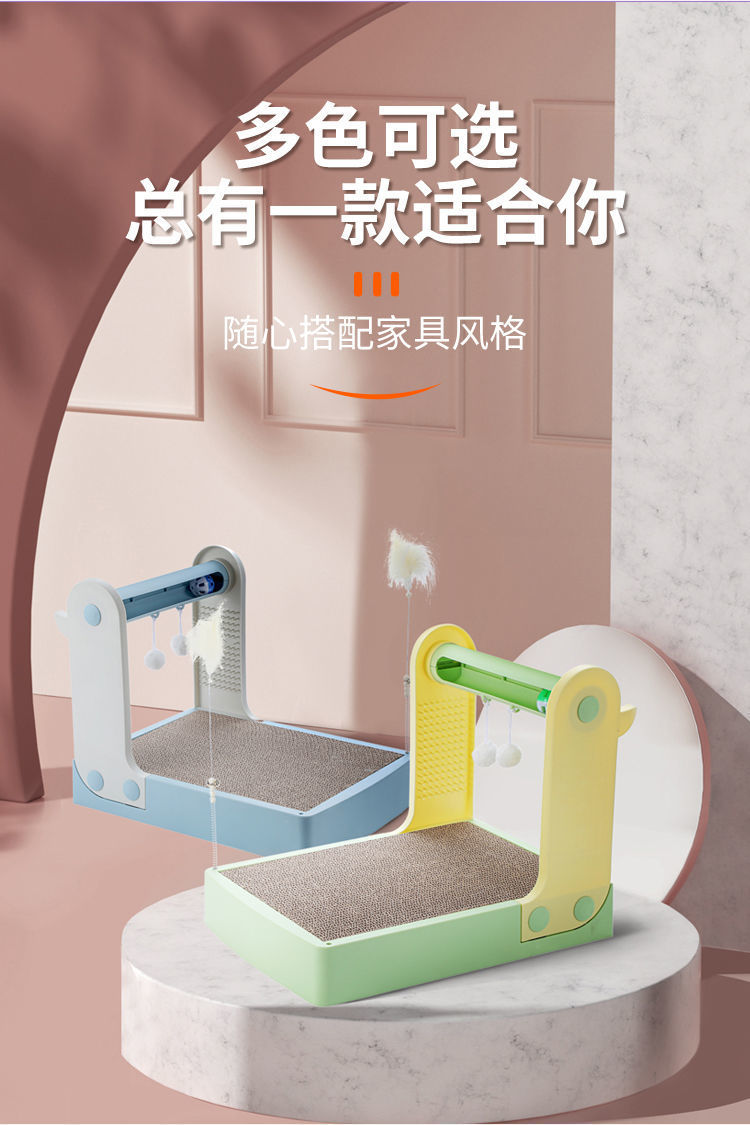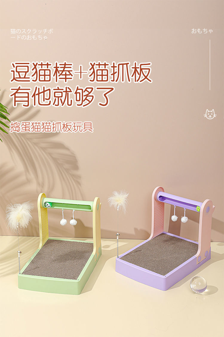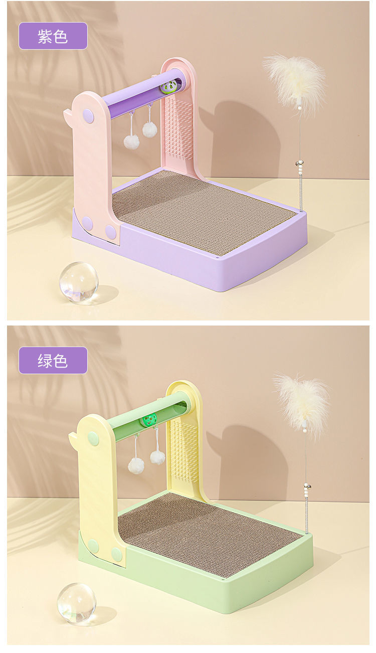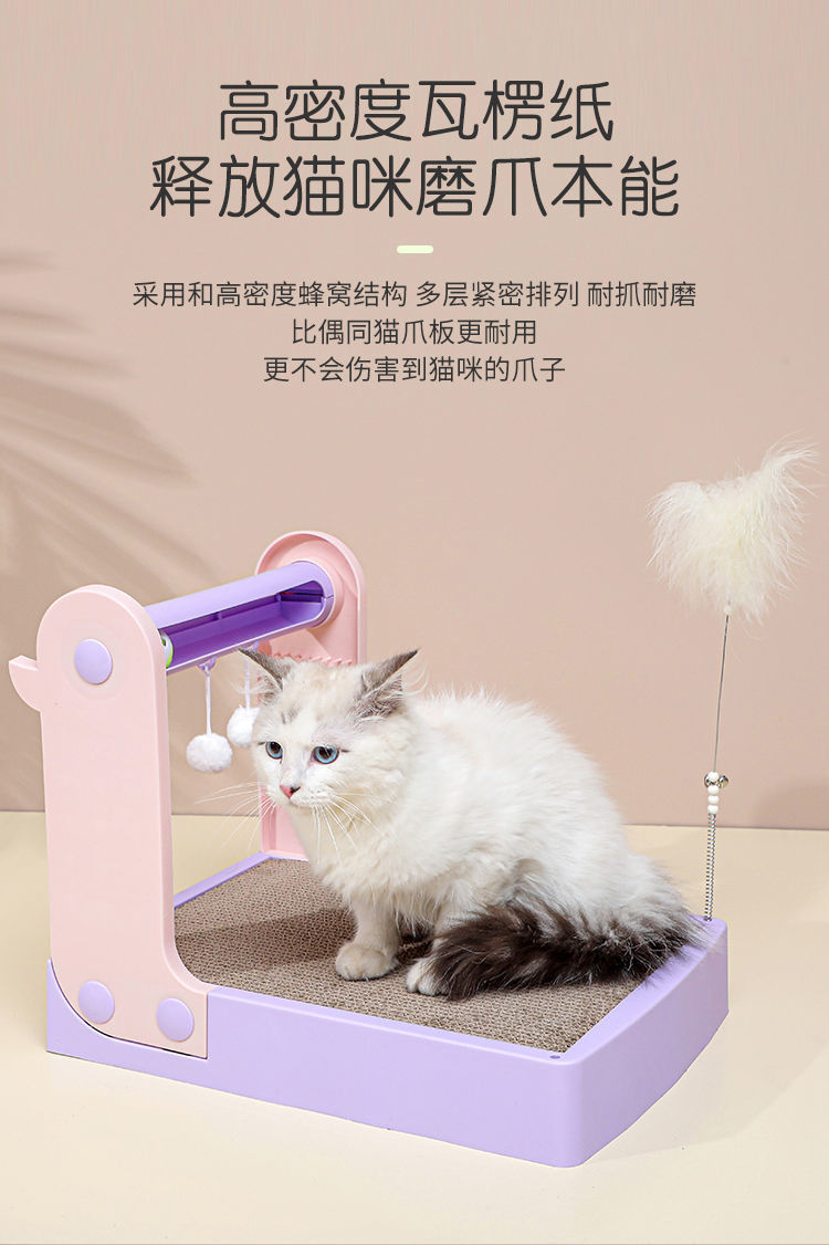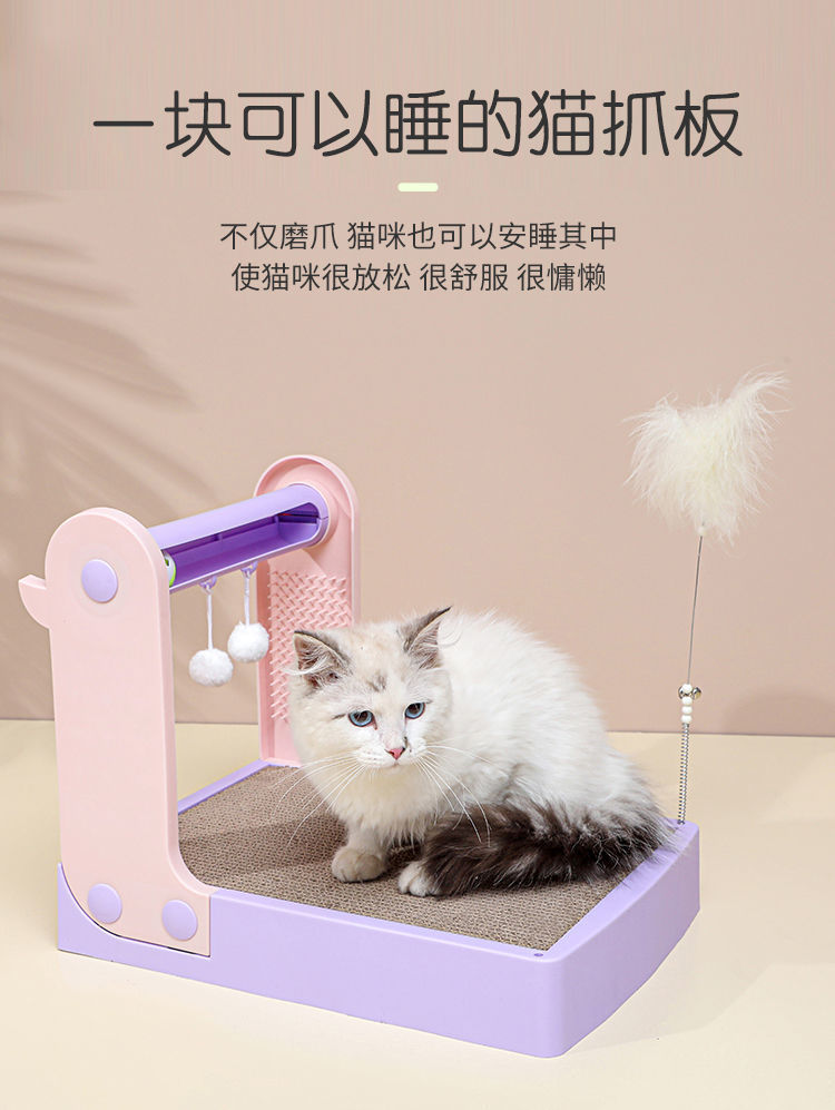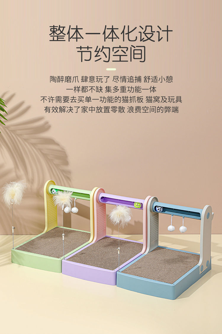 Когтеточка для кошек-уток фиолетового и розового цвета (сон, заточка и игра в одном)); Когтеточка для кошек-уток желтого и зеленого цвета (спит, точит когти и играет все в одном)); Сине-серая когтеточка для кошек-уток (спит, скрипит и играет все в одном))