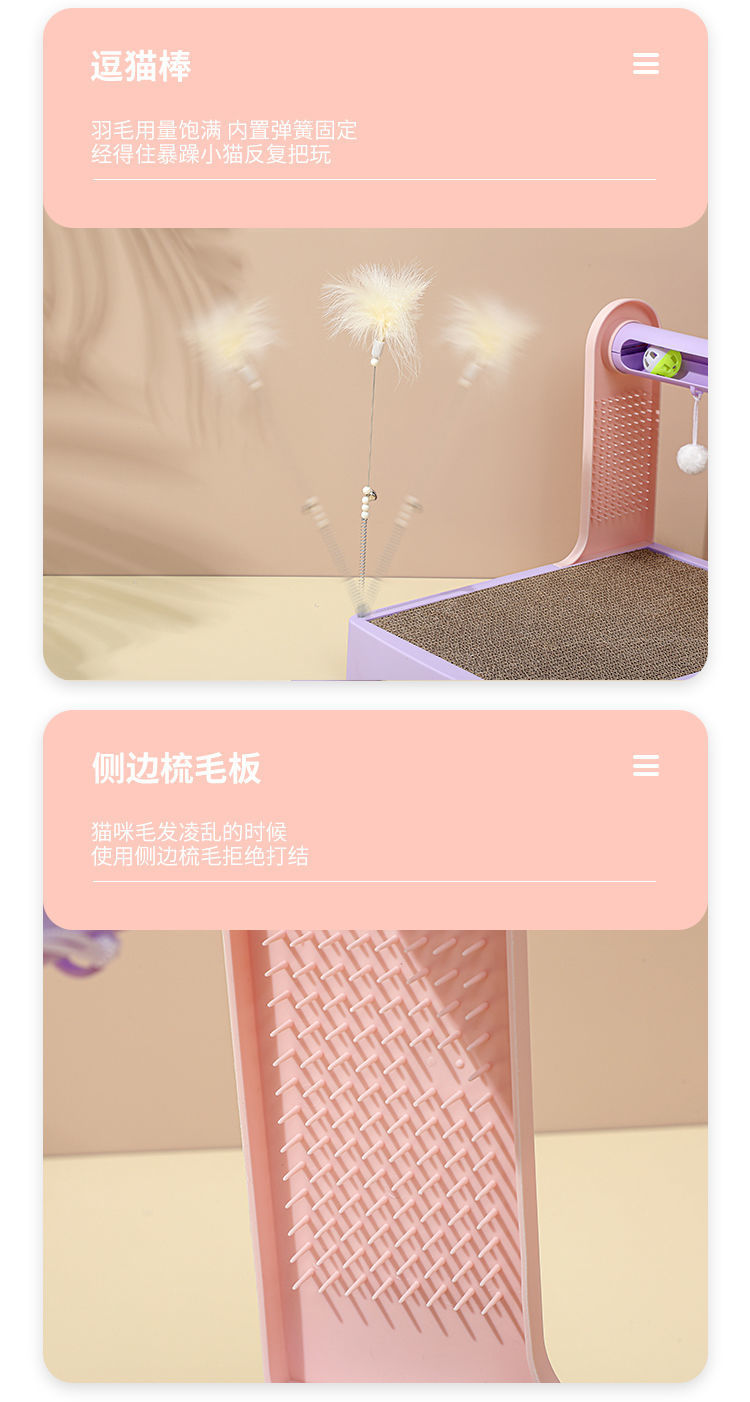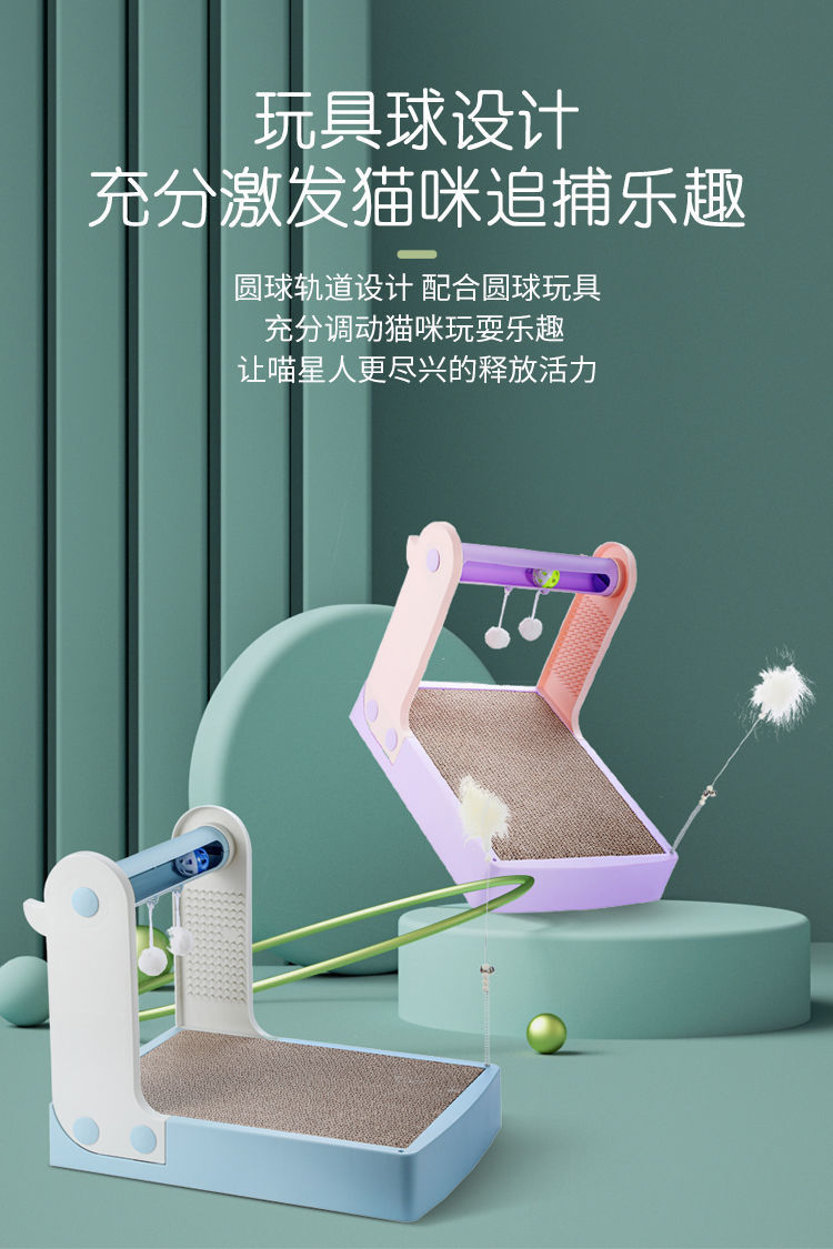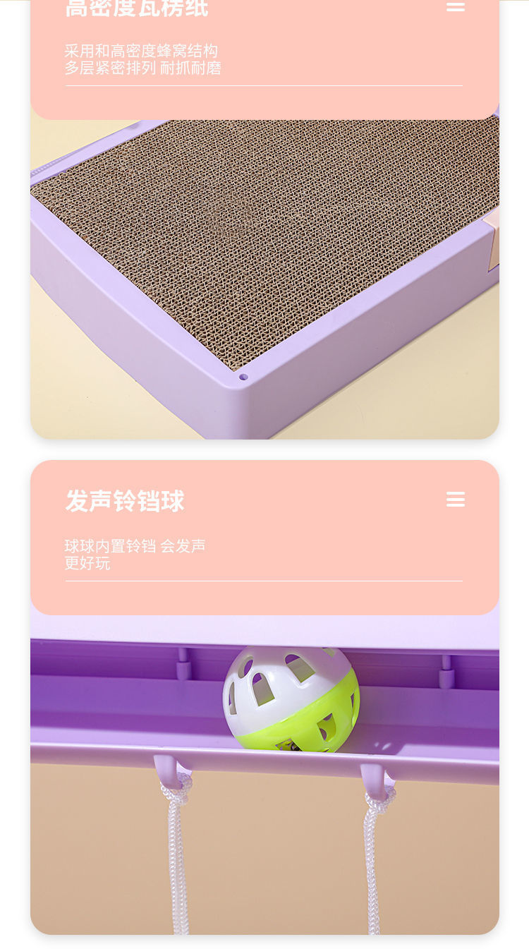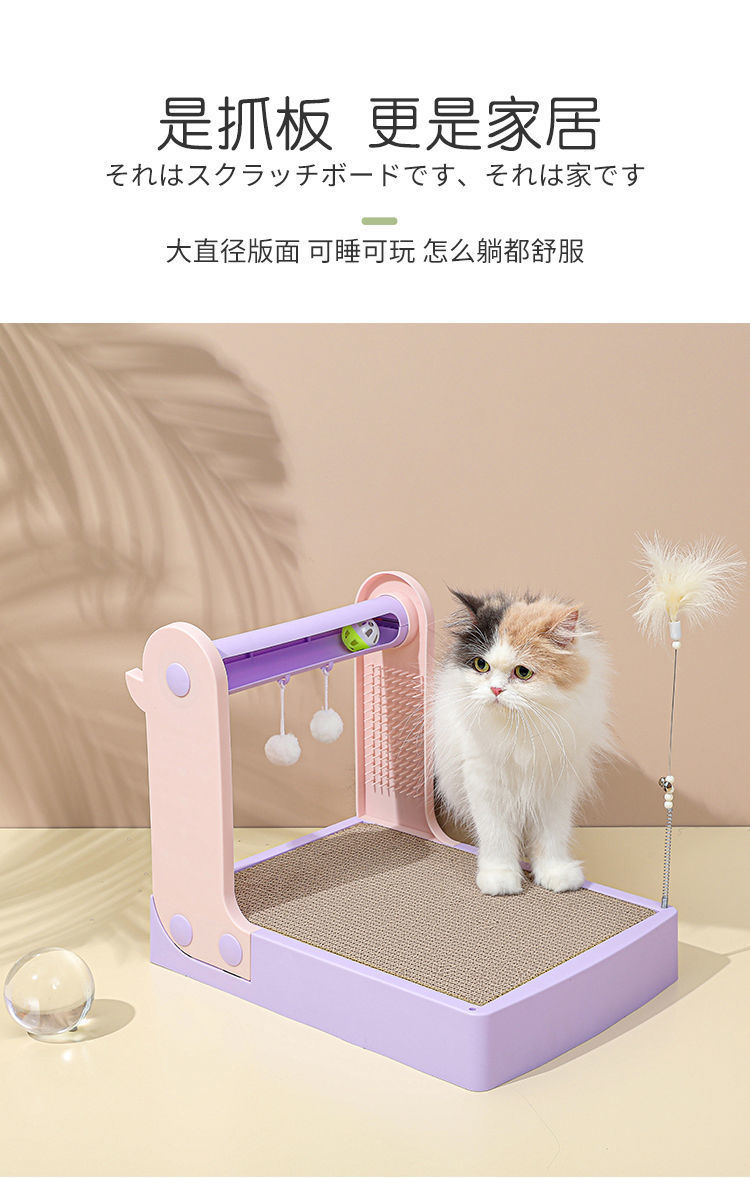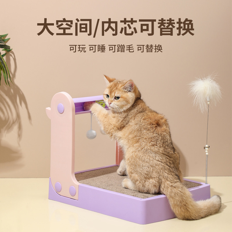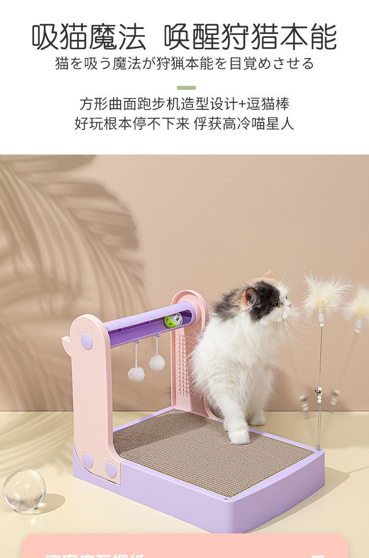 Когтеточка для кошек-уток фиолетового и розового цвета (сон, заточка и игра в одном)); Когтеточка для кошек-уток желтого и зеленого цвета (спит, точит когти и играет все в одном)); Сине-серая когтеточка для кошек-уток (спит, скрипит и играет все в одном))
