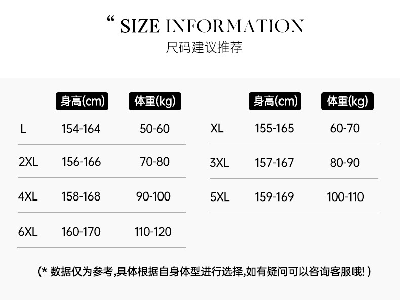 L (рекомендуется 50-60kg ); XL (рекомендуется 60-70kg ); 2XL (рекомендуется 70-80kg ); 3XL (рекомендуется 80-90kg ); 4XL (рекомендуется 90-100kg )