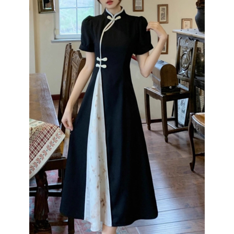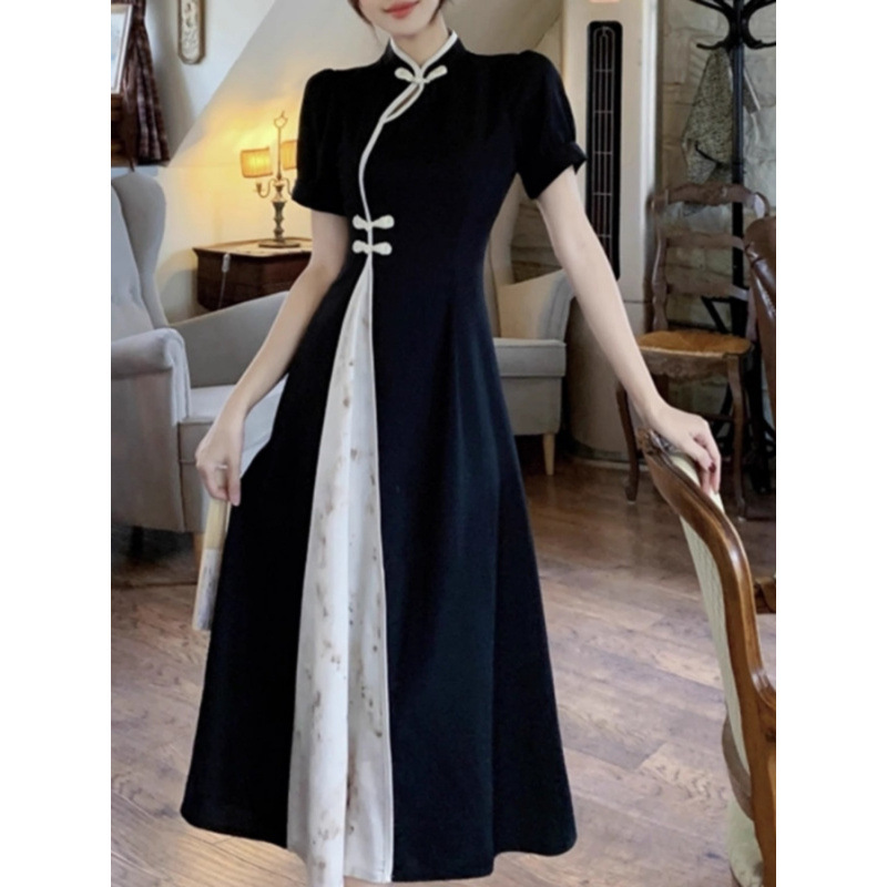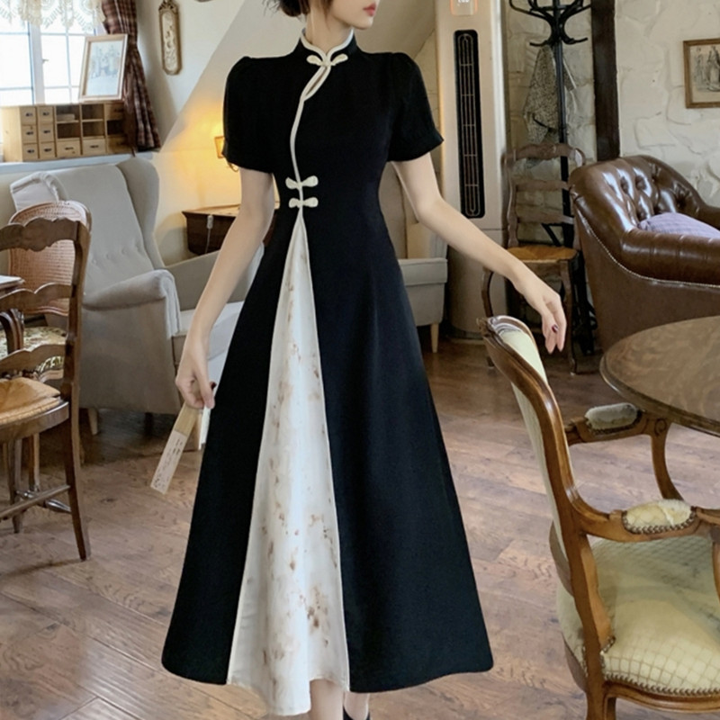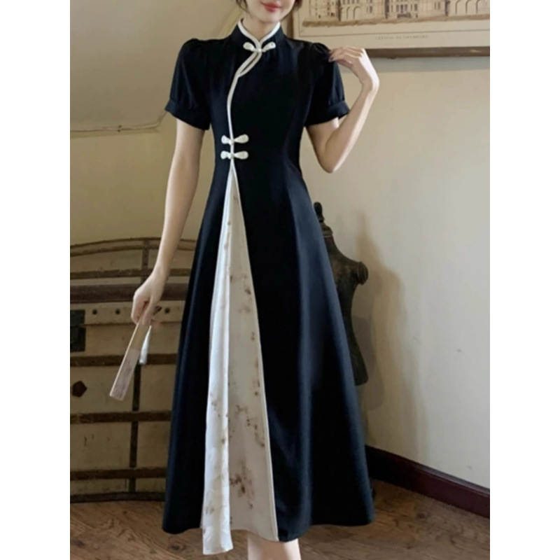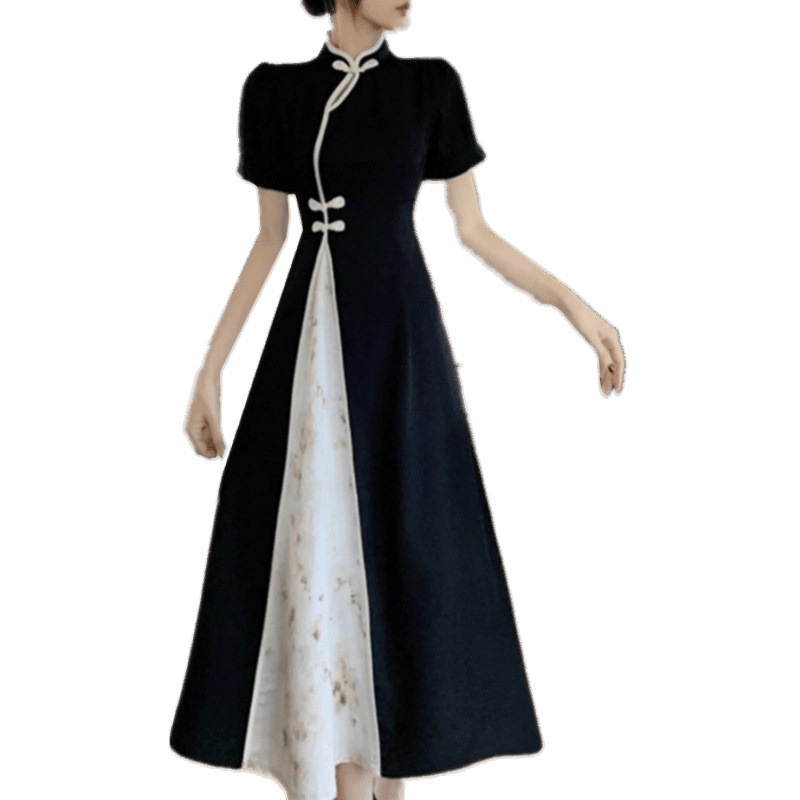 Летняя новая улучшенная юбка Cheongsam в китайском стиле больших размеров для полных мм, черно-белое платье нежного национального стиля контрастного цвета