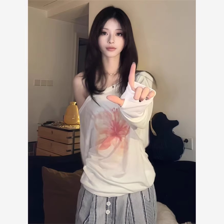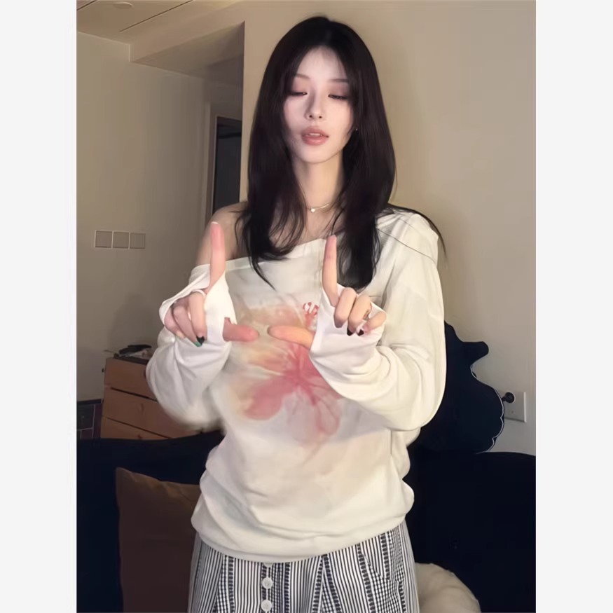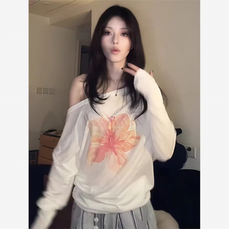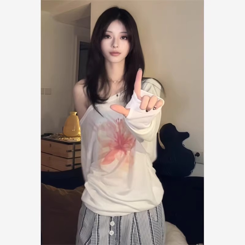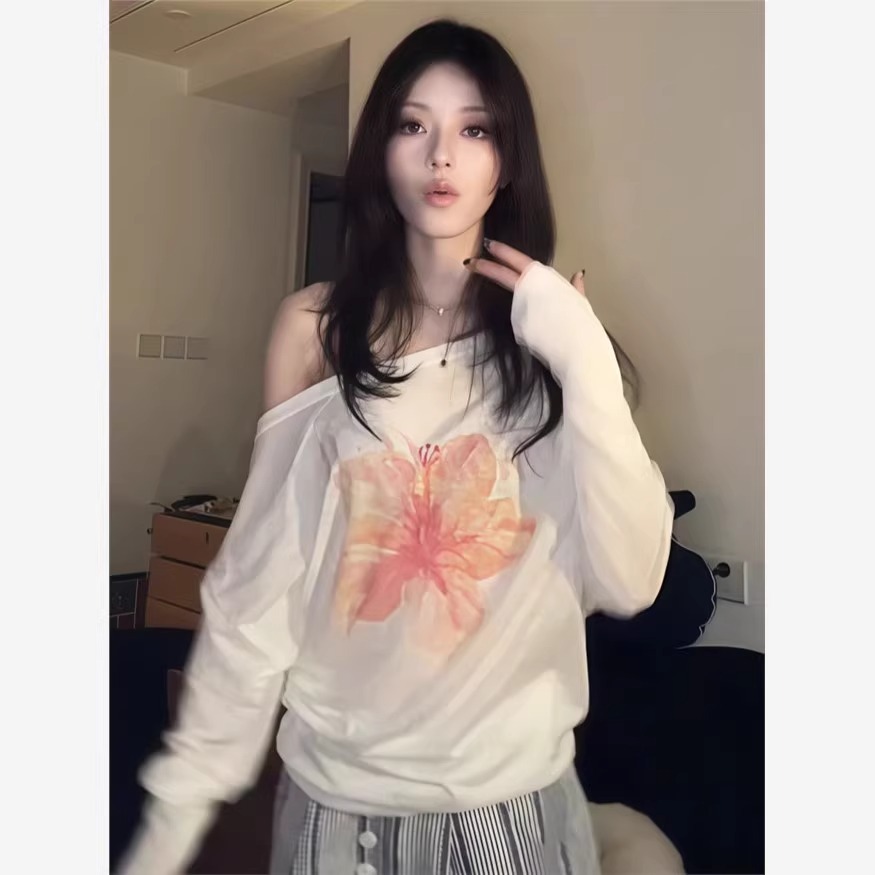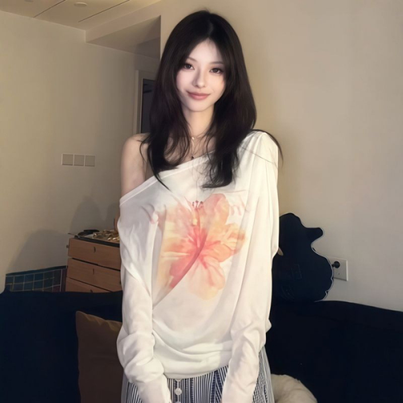 [Хлопок «Снежинка»] Блузка с наклонными плечами, белая тонкая футболка, женский дизайн, свободный повседневный топ с цветочным принтом