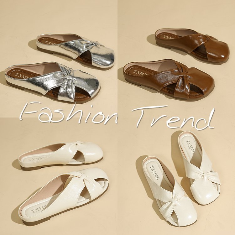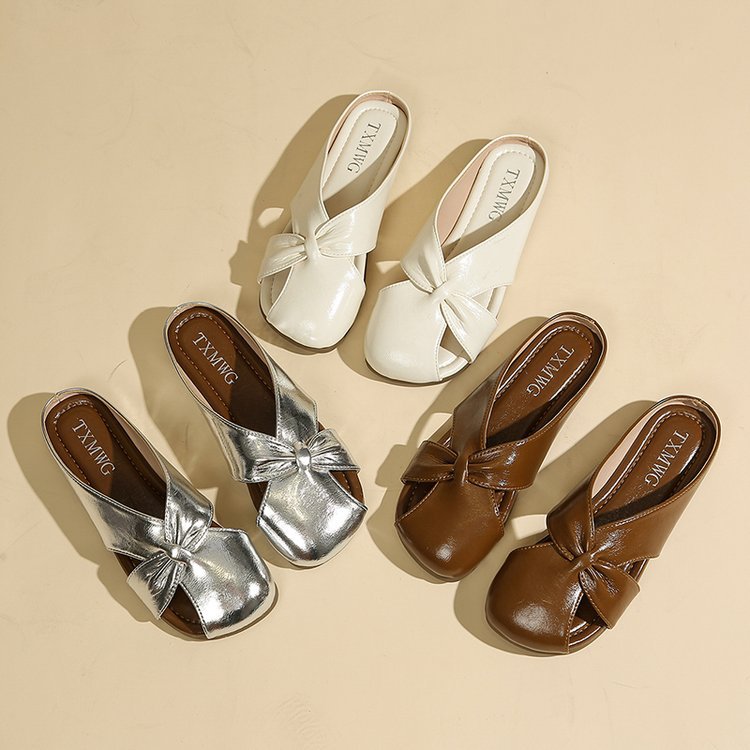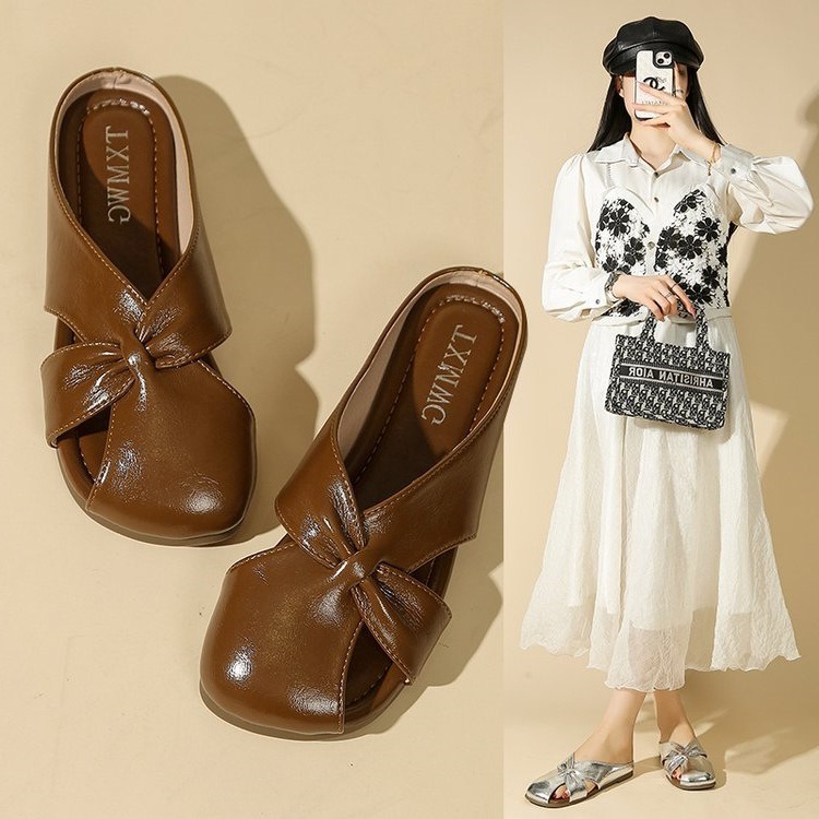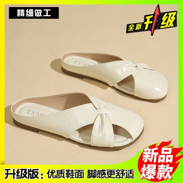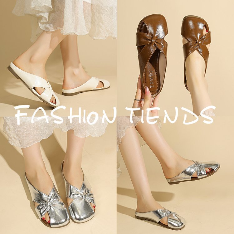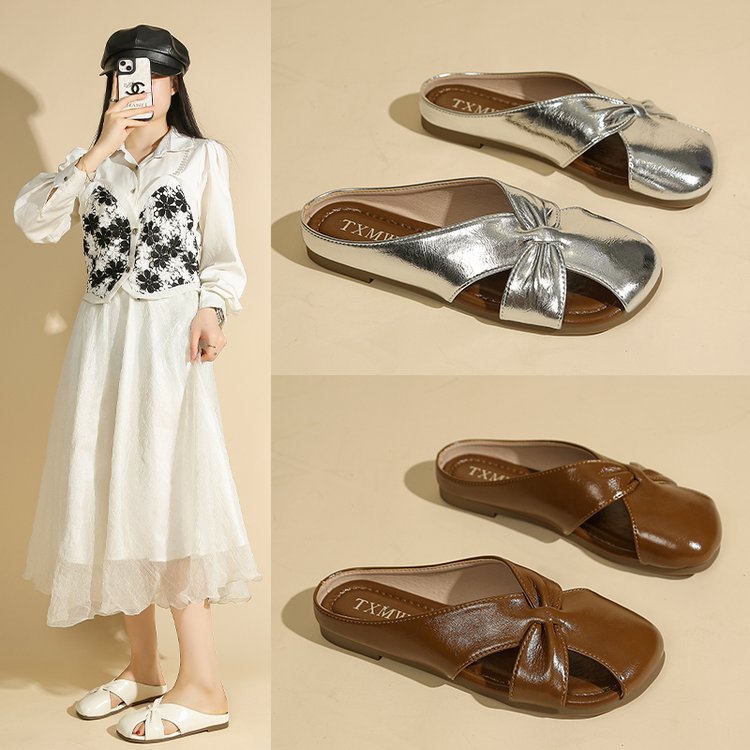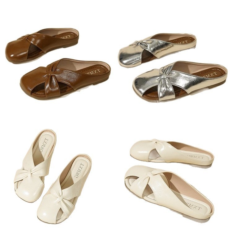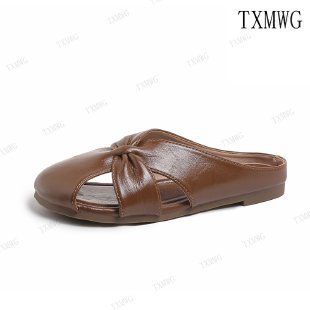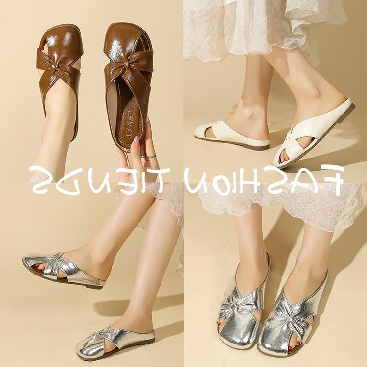 Женские летние шлепанцы с бантом на носке 2025 года, новые универсальные французские балетки на плоской подошве из мягкой кожи, легкие сандалии
