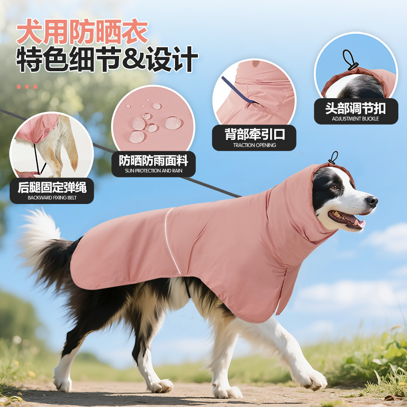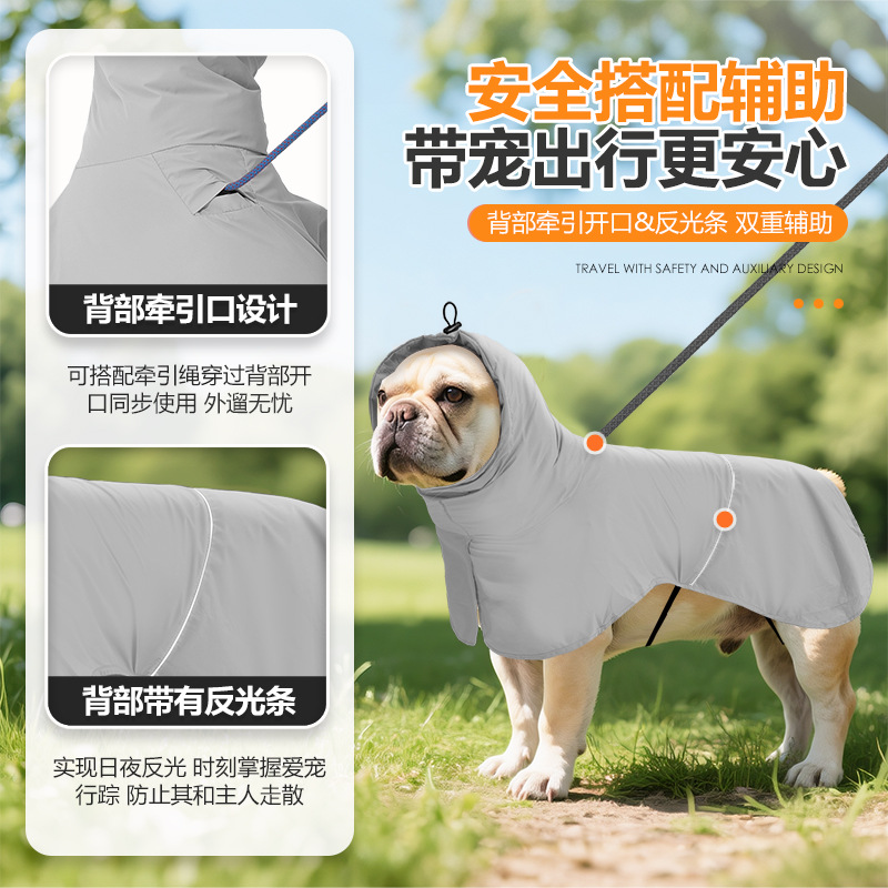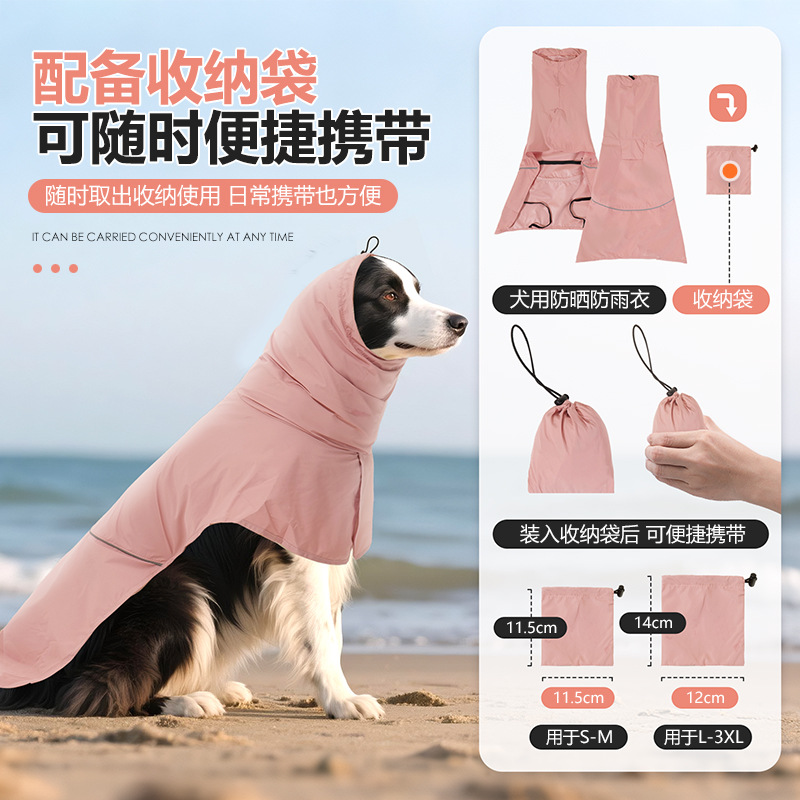 背部牵引开口方便牵引~带有反光条适用于夜间出行。配有收纳口袋,出行时可随时取出使用。夏季出行可防晒,阻隔紫外线,狗狗出行不在炎热,防雨防晒的面料适用于多种复杂天气出行,斗篷披风版型适合各种犬型