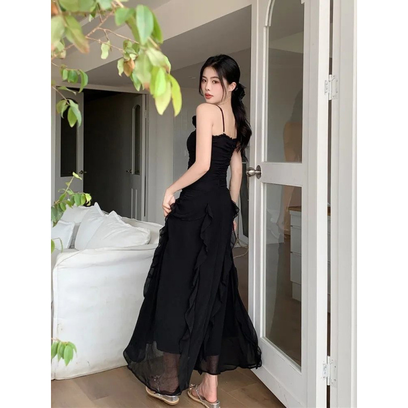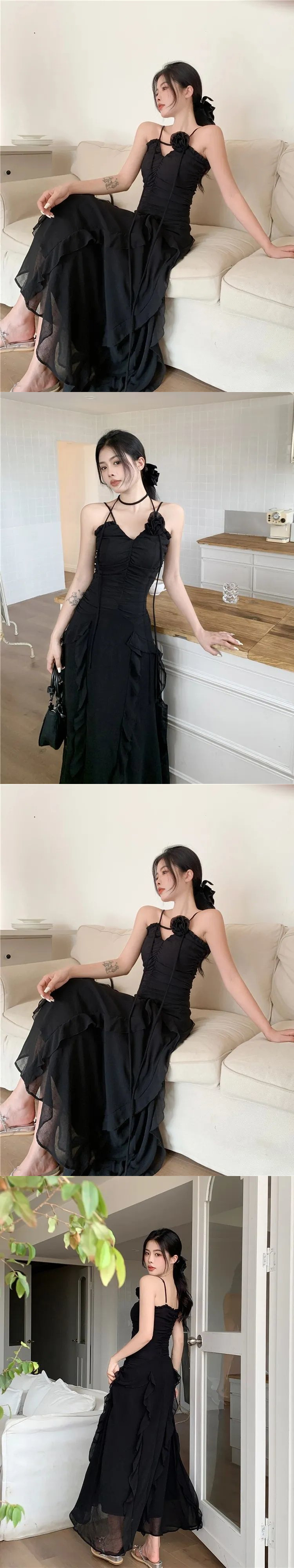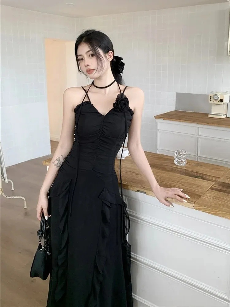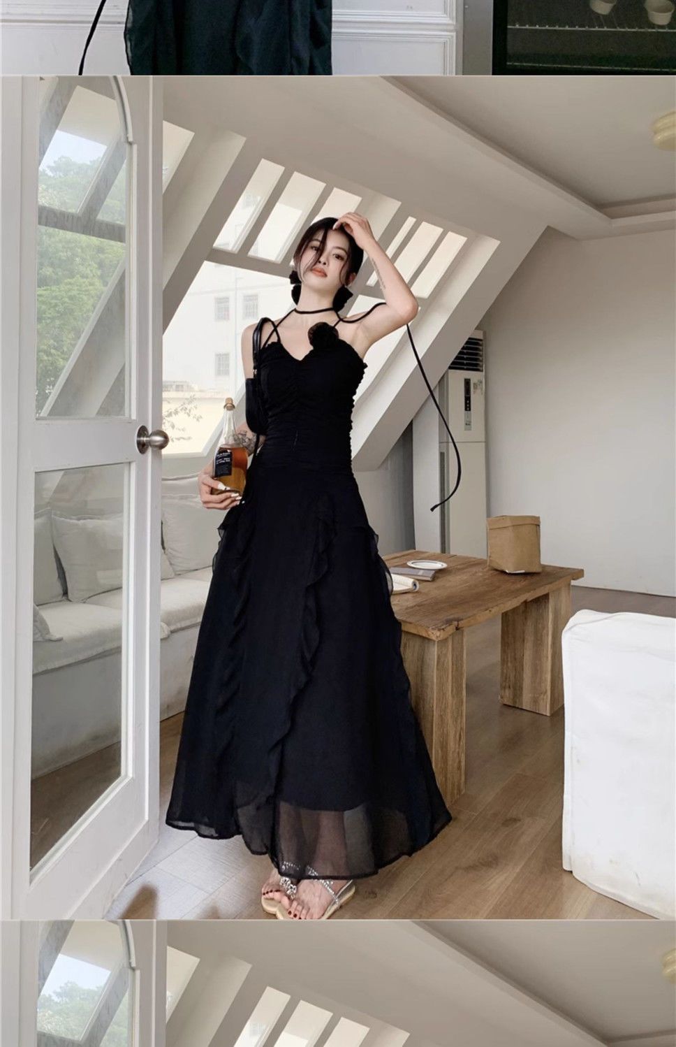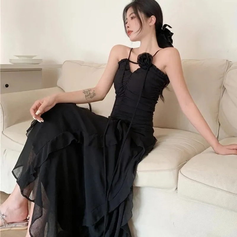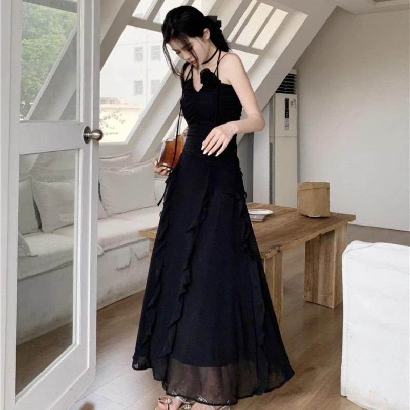 Новый французский стиль, полая талия, плиссированное длинное платье на подтяжках, черная темпераментная юбка, сексуальная