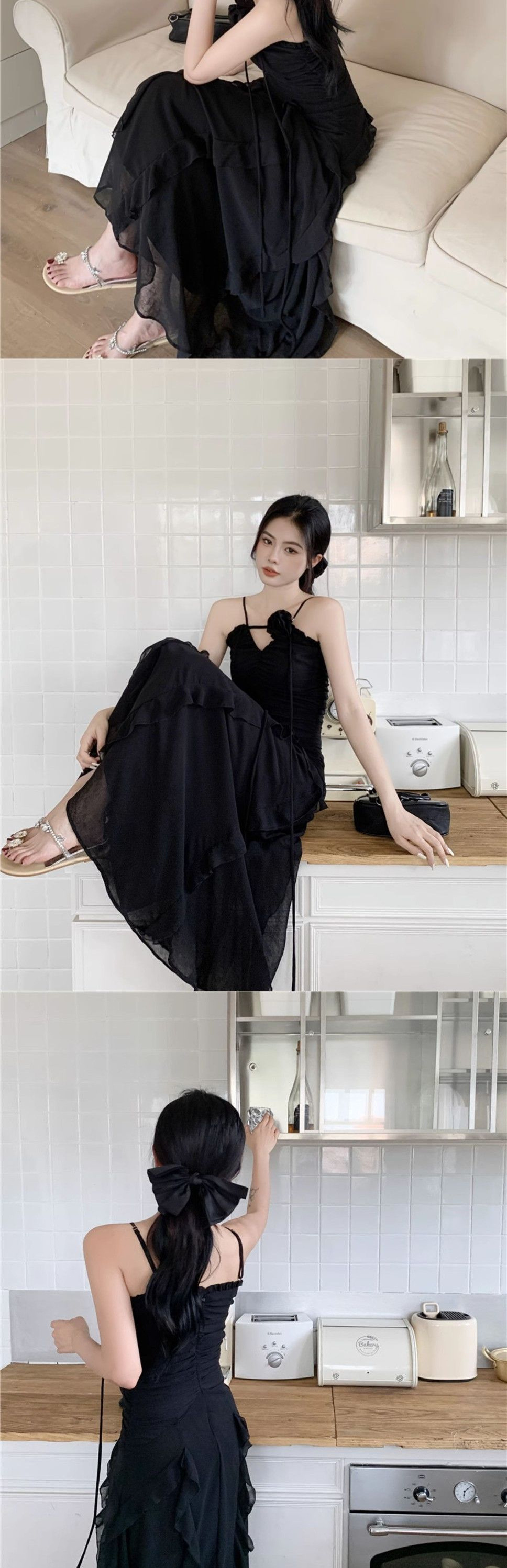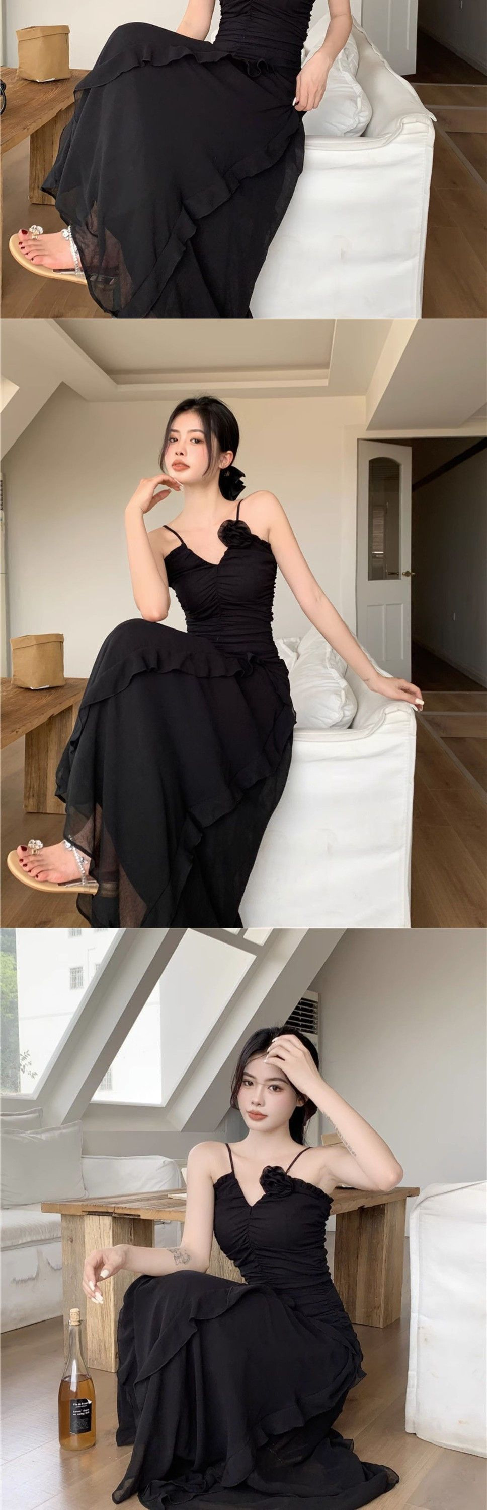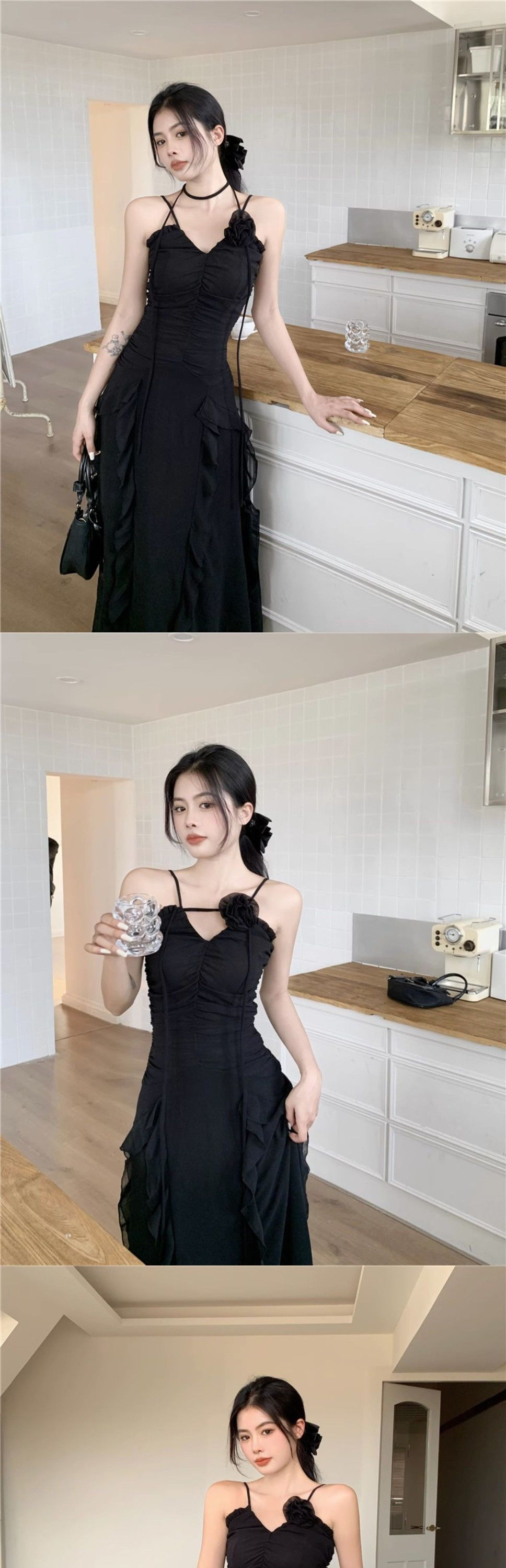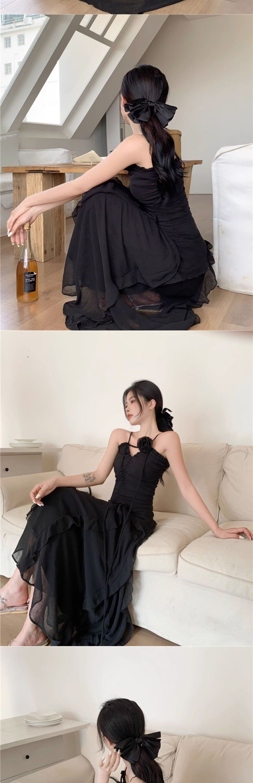 Новый французский стиль, полая талия, плиссированное длинное платье на подтяжках, черная темпераментная юбка, сексуальная