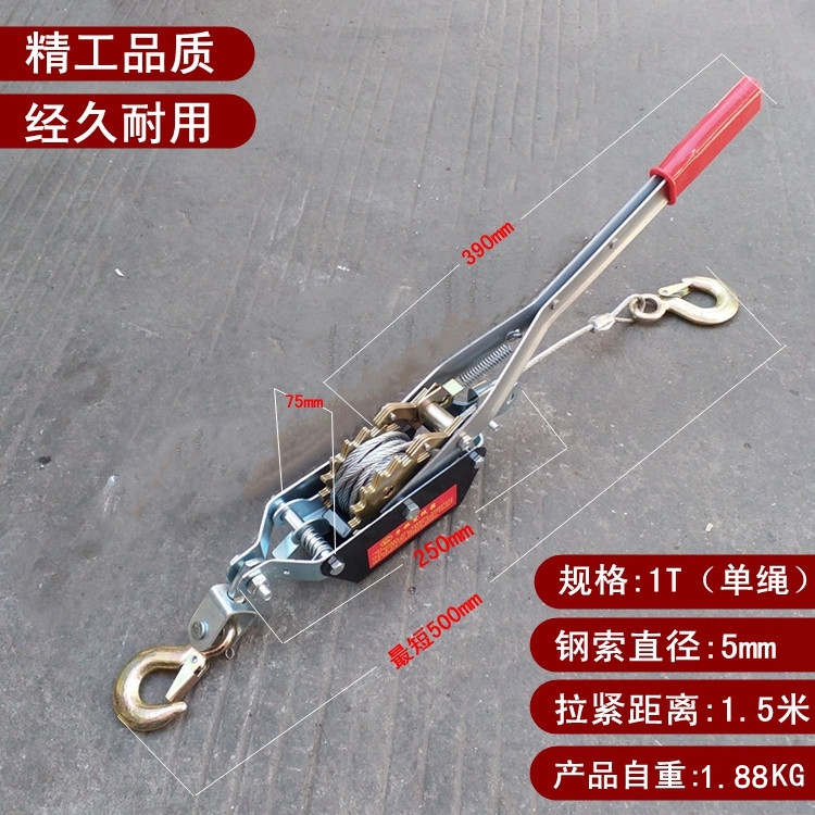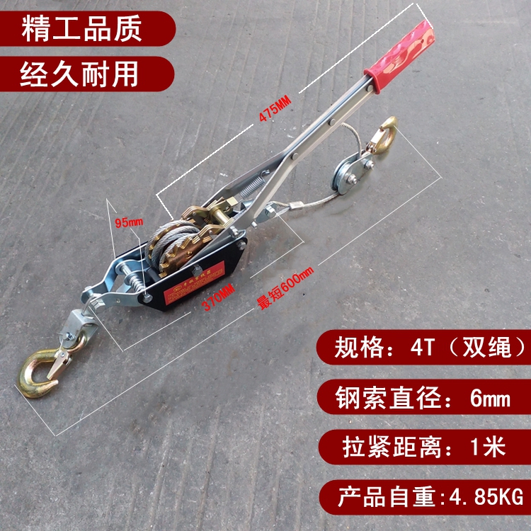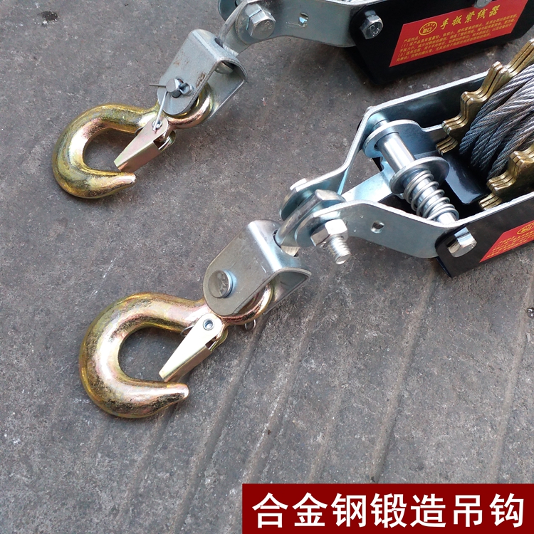 负载放绳方法:手柄继续向前扳,扳一丁点让两边的棘轮斜齿离开一点棘轮锁紧卡板,这个时候棘轮卡板没有吃力,棘轮锁紧卡板就可以很轻松的扳开,扳开棘轮锁紧卡板后手柄往回放,这个操作1-2次就可以。钢丝绳松开后,调起棘爪,就可以快速抽出钢丝绳了。(所以手柄不能扳死哦,一点都不能向前的话,就不好操作了。).
