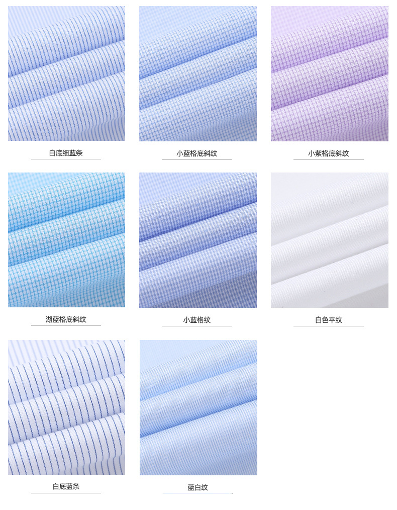 02 тонкая синяя полоска; 03 синий простой; 04 белый средний саржа; 05 синий средний саржа; 06 широких полос на белом фоне; 07 синий бамбуковый узор; 10 белых узоров «елочка»; 11 синий узор «елочка»; 12 синих узоров «гусиные лапки»; 17 тонких синих полос на белом фоне; 20 маленьких синих клетчатых саржевых низов; 21 маленький синтетический низ в фиолетовую клетку; 22 твил с синим клетчатым дном озера; 31 белый простой; 33 синих полосы на белом фоне; 37 сине-белый узор