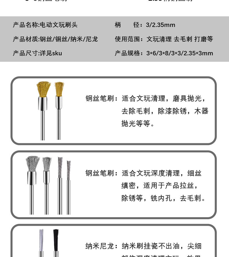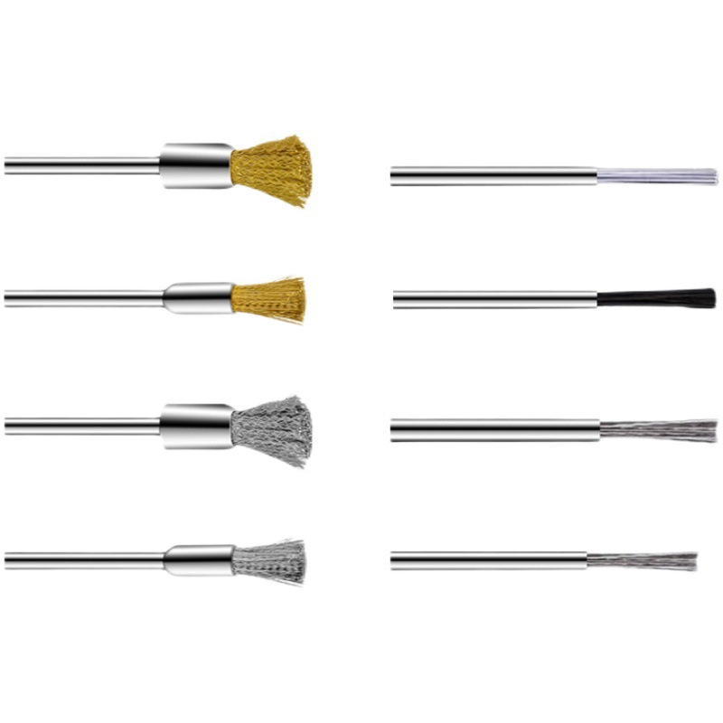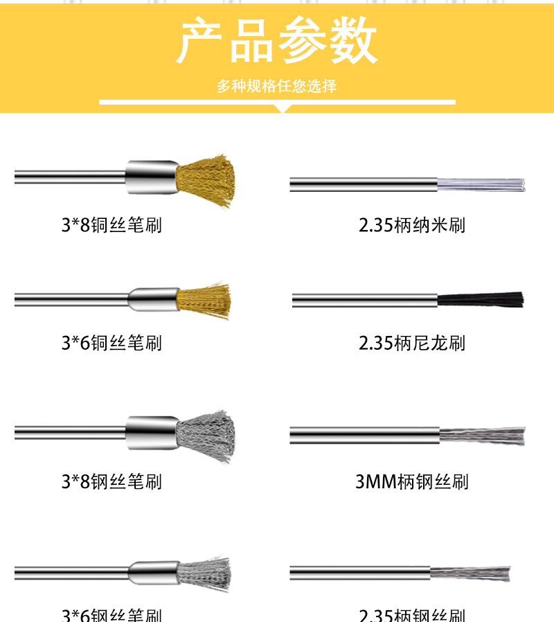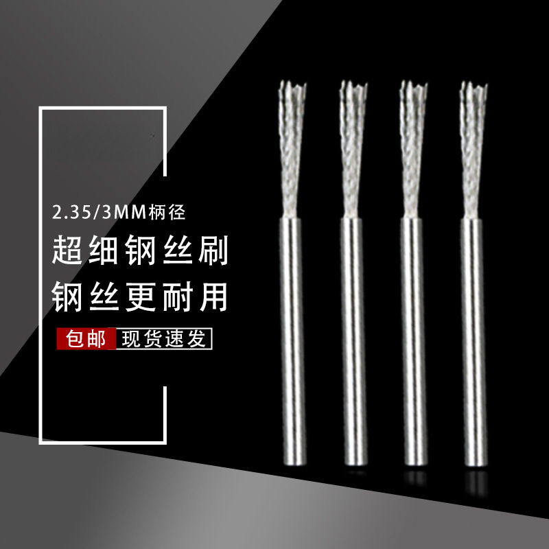В упаковке пять проволочных щеток с ручкой 2,35, в упаковке десять проволочных щеток с ручкой 2,35, в упаковке двадцать проволочных щеток с ручкой 2,35, в упаковке пять проволочных щеток с ручкой 3 мм, 3 мм.