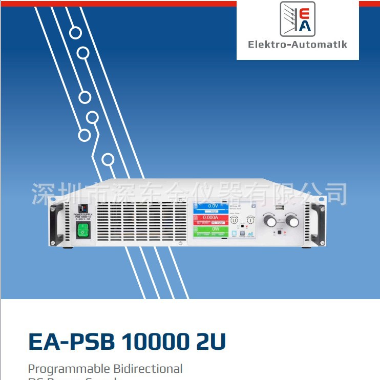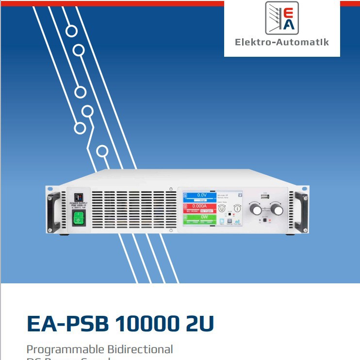 EA-PSB 10200-50 2U is a PSB 10000 2U series programmable bidirectional DC power supply. This bidirectional power supply device incorporates the function of a laboratory power supply(source) and an electronic load(sink) into one unit. The DC supply operates as a flexible output stage with a constant power characteristic (auto ranging), and a wide voltage, current and power range. To achieve higher power and current all units are equipped with a host-server bus. Furthermore, typical laboratory functionality is provided. This includes an extensive function generator, alarm and warning management, assorted interfaces and ports, software solutions and many more functions.