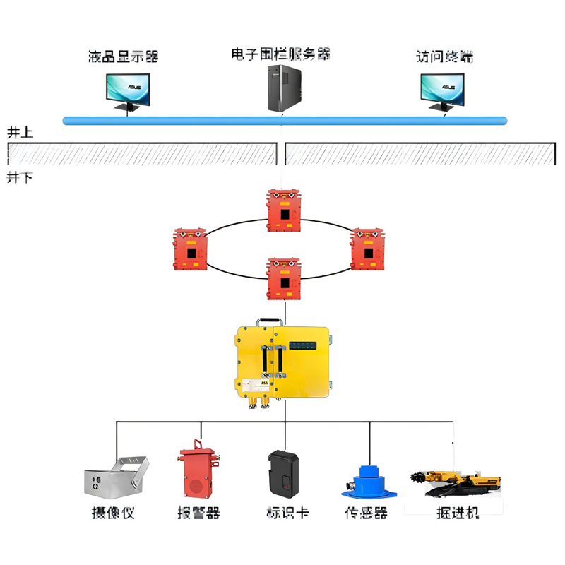 在井下各危险区域建设“电子围栏”系统,“电子围栏”又称人员接近防护系统,是一种安全防护系统。广泛应用于掘进工作面、煤仓、密闭墙、带式输送机等井下关键危险区域的安全预警。该系统通过精准人员定位、红外感应技术、红外热成像技术技术等手段,实现作业人员进入危险区域时,及时发出声光报警或触发设备停机,避免事故发生。